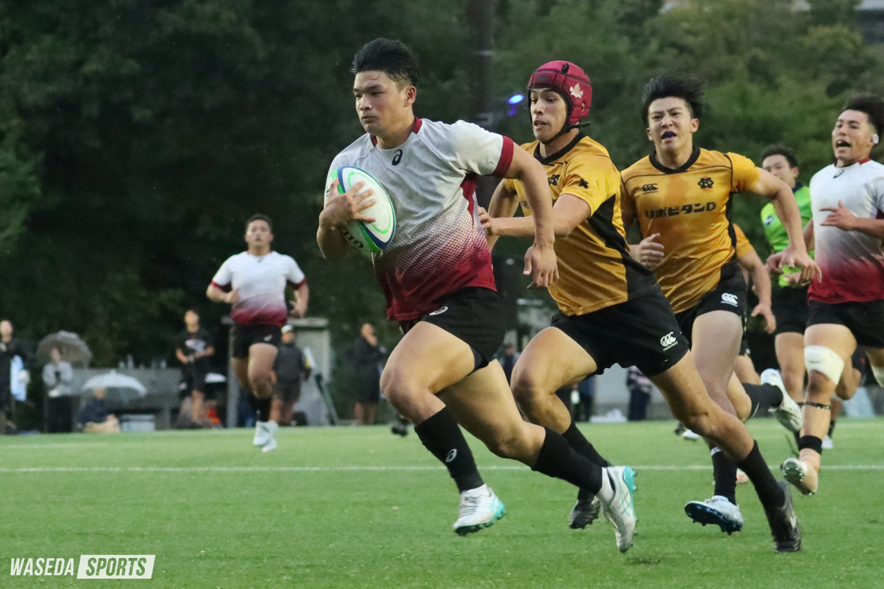 日は沈み、時折雨が降る中行われた早大Cと慶大Cの一戦。次第に下がる気温とは裏腹に、早大Cは開始直後から果敢に攻め込む。早くも前半2分に先制点を奪うと、立て続けに得点を奪い31ー0で試合を折り返した。続く後半も早大Cは攻撃の手を緩めない。一時は膠着(こうちゃく)状態も訪れたが、早大Cはボールを継続して得点の機会を伺う。27分にインゴールを明け渡したものの、試合終了間際に得点を重ねた早大Cが73ー5で白星を奪い取った。