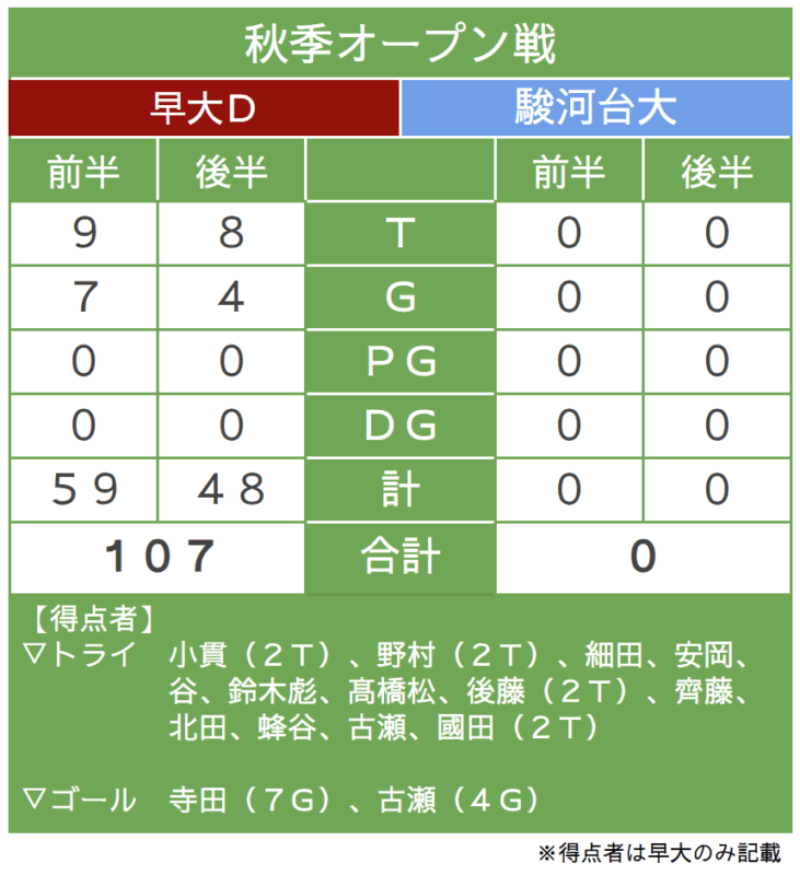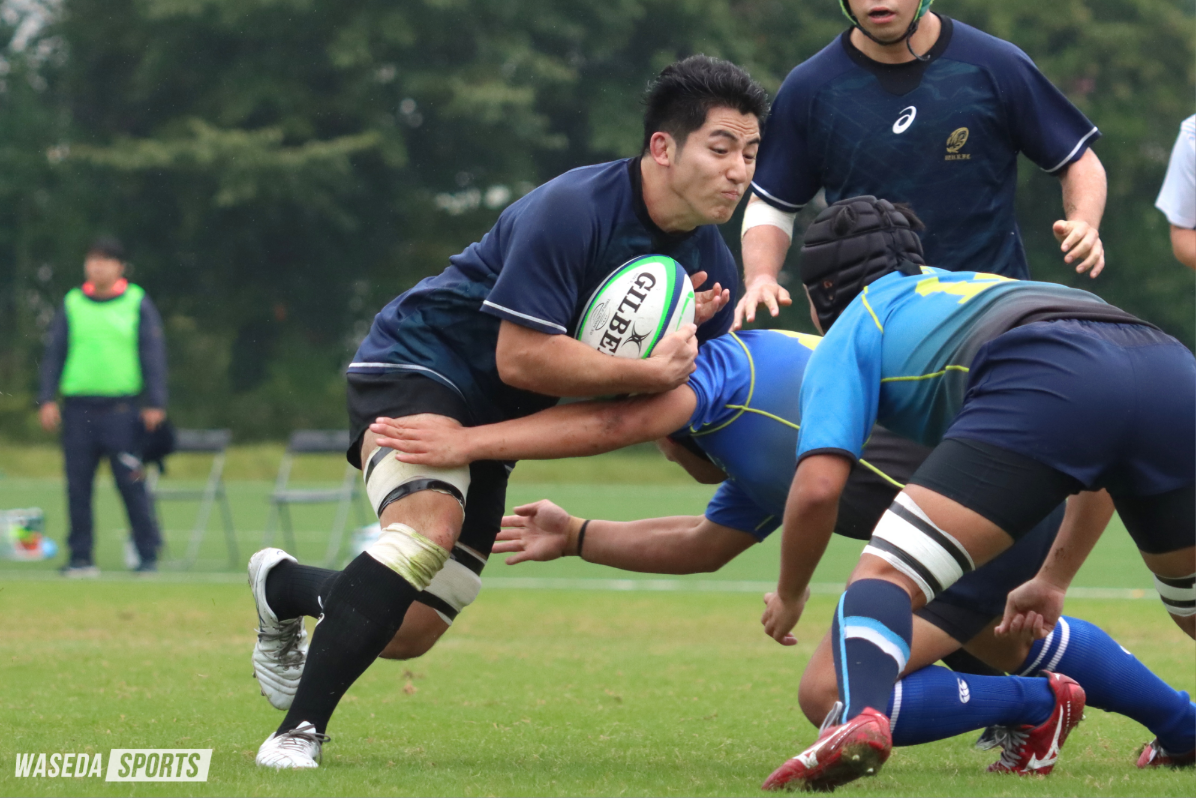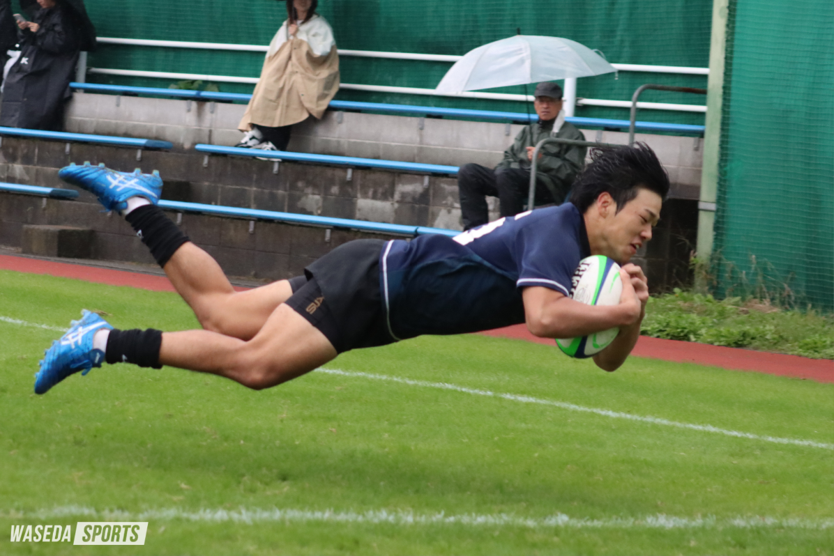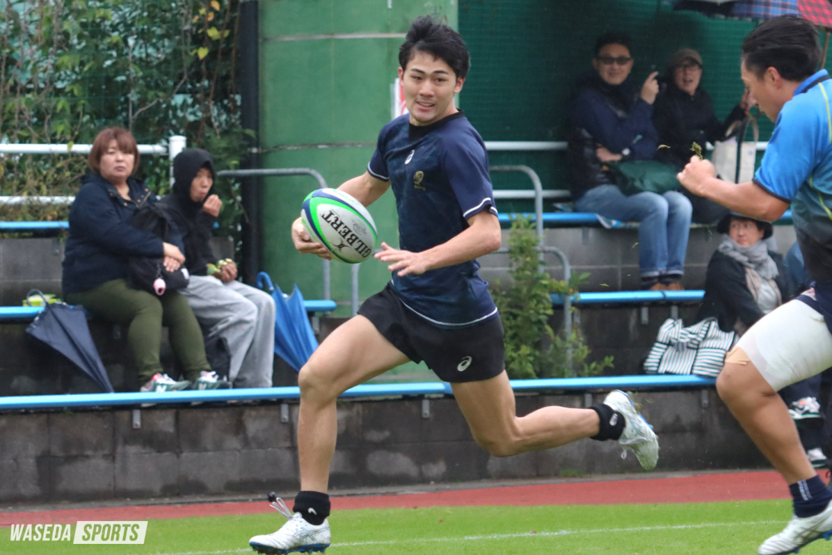 メンバーを代えつつ迎えた後半だったが、試合は変わらず早大Dペース。1分に早くもWTB後藤洸輝(スポ1=大分・玖珠美山)が追加点を挙げる。さらに4分にはLO岩尾隼悟(教1=神奈川・湘南)のゲインをきっかけにテンポが生まれると、最後は齊藤がタックラーをはじき飛ばしながらインゴールに飛び込んだ。71ー0と次々に点差を広げていく。後半から出場したLO松澤慶(スポ2=早稲田佐賀)とPR蜂谷謙介(基理4=東京・早大学院)のナイスタックルで試合全体のコンタクトが熱を帯びると、16分にはFB北田琢麿(スポ4=埼玉・川越東)もトライ。24分にはHO丸橋怜央(商3=埼玉・早大本庄)がゲインしたところから良い形でのアタックを展開した早大D。これは惜しくもゴール前でノックフォワードとなったが、相手ボールスクラムを押し込むと判定はキャリーバック。絶好のチャンスを迎え、敵陣でのアタックを継続すると最後は蜂谷がゴール中央にグラウンディング。部員席からは歓声が上がった。続く30分、駿河台大に自陣まで攻め込まれた早大Dだったがボールを奪い返すとCTB佐藤世那(スポ1=神奈川・桐蔭学園) がロングゲイン。一気に敵陣深くまで侵入するとSO古瀬莊(スポ1=静岡聖光学院)が自ら仕掛け、少ない手数で追加点を挙げた。33分にはまたも佐藤世がディフェンスのギャップを突いたランでブレイクに成功すると、最後はFB國田泰裕(法1=東京・早大学院)がタックラーを引きずりながらインゴールを叩き割り、スコアは99ー0。36分に國田が連続でトライを挙げ、ノータイムに後藤が得点を追加したところでノーサイド。107ー0と圧倒的なスコアで駿河台大を打ち破った。