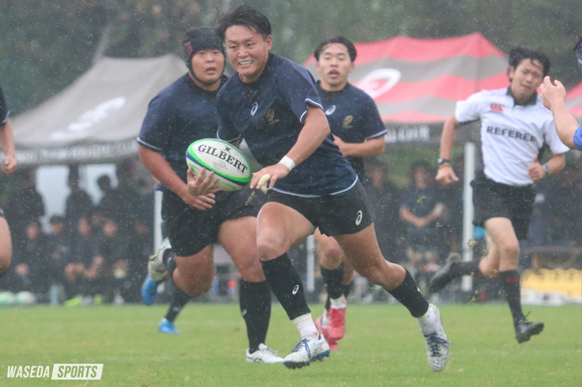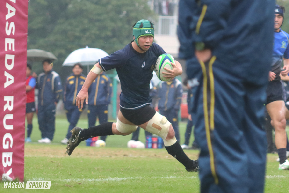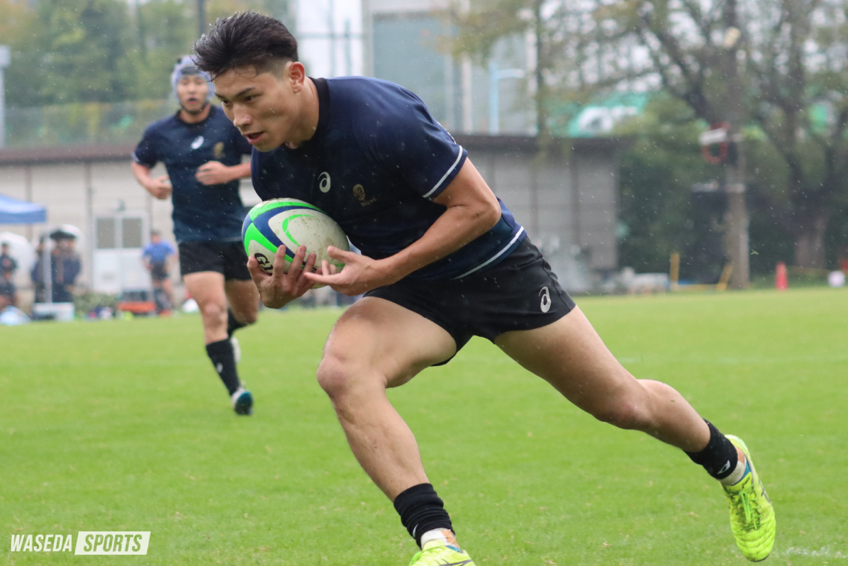 駿河台大のキックオフで始まった試合はいきなり早大Dの好キックで敵陣でのラインアウトを得る。コンタクトが起こるたびに前進した早大Dは思い通りのアタックの形を作り出し、WTB小貫壮太(教3=東京・早大学院)がインゴール右隅に滑り込んで早くも先制点。続く4分、5分の相手ボールスクラムでペナルティーを立て続けに獲得すると、ゴール前でモールを形成。密集からパスされたボールをCTB藤井雄士(社2=北海道・札幌山の手)が力強いキャリーでゴール目前まで持ち込むと、最後はHO野村怜央(商1=兵庫・報徳学園)がグラウンディングに成功。今試合は雨でボールが落ち着かない試合だったため、スクラムを支配した早大Dが優位に立つのは当然の展開であった。9分、またも相手ボールスクラムをペナルティーでターンオーバーすると敵陣ラインアウトをすぐにセットし、駿河台大ディフェンスが揃う前に攻撃を始めた早大D。SO寺田結(スポ2=広島・尾道)が守備の乱れを見逃さず、ラインブレイクに成功すると早いテンポで順目に展開。最後はFB細田悠介(スポ2=福岡・修猷館)がインゴールを駆け抜けた。セットプレーで試合の流れを完全につかむと、22分にモールでも得点を挙げる。再開のキックオフをキャッチしたNO・8山下広一朗(創理4=東京・早大学院)がラインブレイクするとCTB鈴木彪馬(スポ2=東京・国学院久我山)がオフロードパスをキャッチ。敵陣深くに持ち込み、最後はインゴール左隅にSH安岡叶夢(社2=大阪桐蔭)が飛び込んだ。この時点でスコアは31ー0。続く26分、小貫が快足を生かしてこの日2本目のトライを挙げ、36分にはCTB齊藤慧士郎(社1=宮城・仙台第三)のナイスタックルから得た反則をFL谷司馬人(教4=東京・早実)が素早く再開し、ゴール中央にボールを置いた。終了間際に鈴木彪、NO・8髙橋松大郎(スポ3=愛媛・松山東)が得点を追加し、59ー0で前半を終えた。