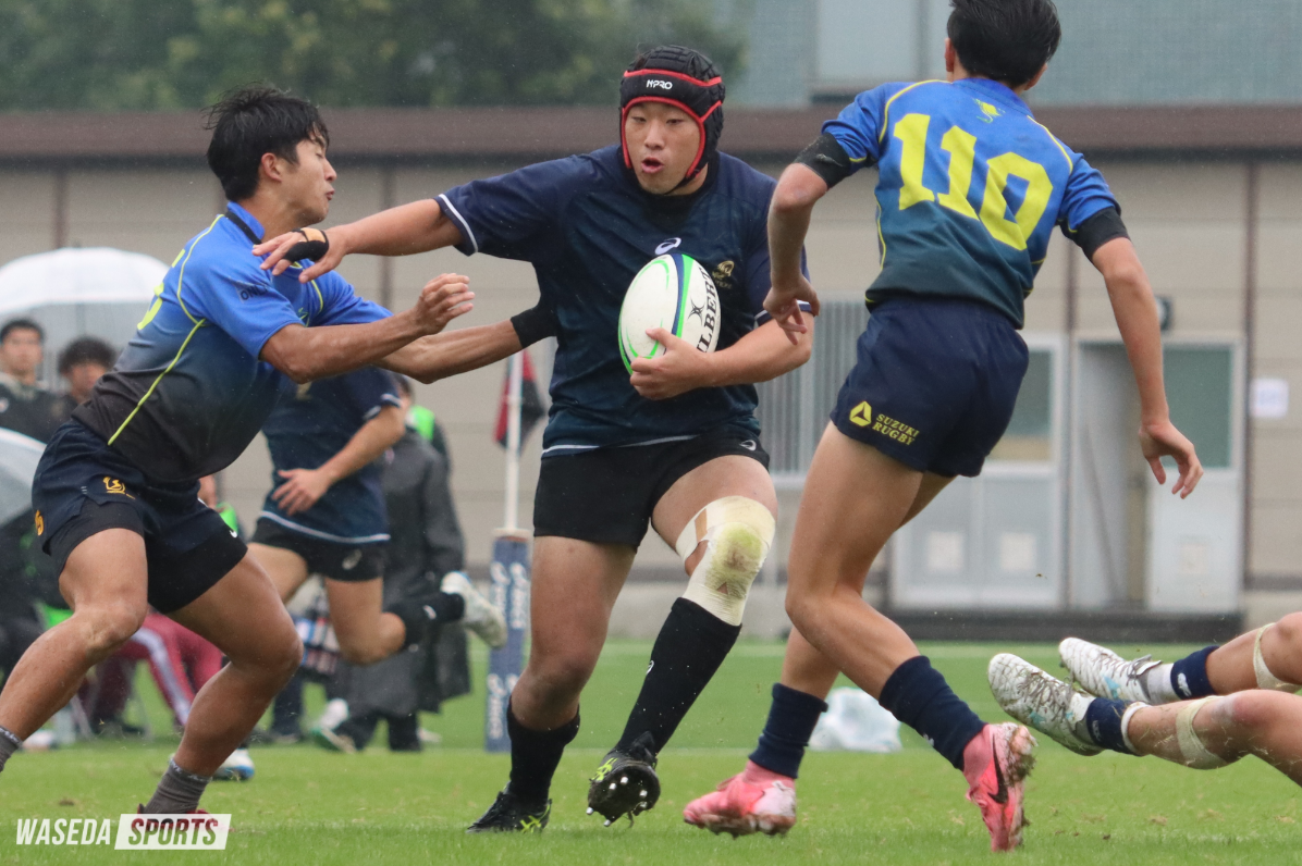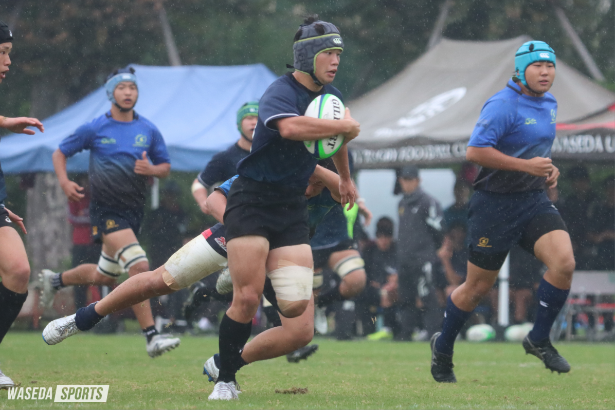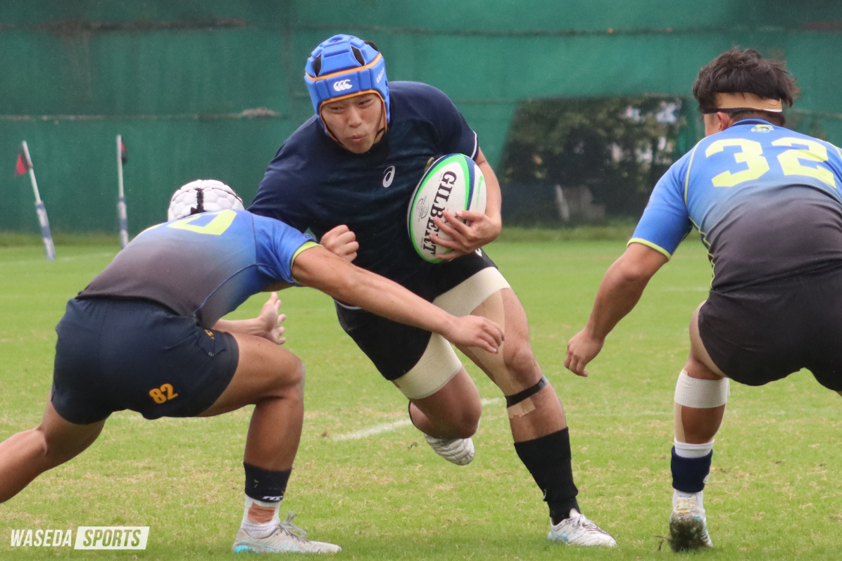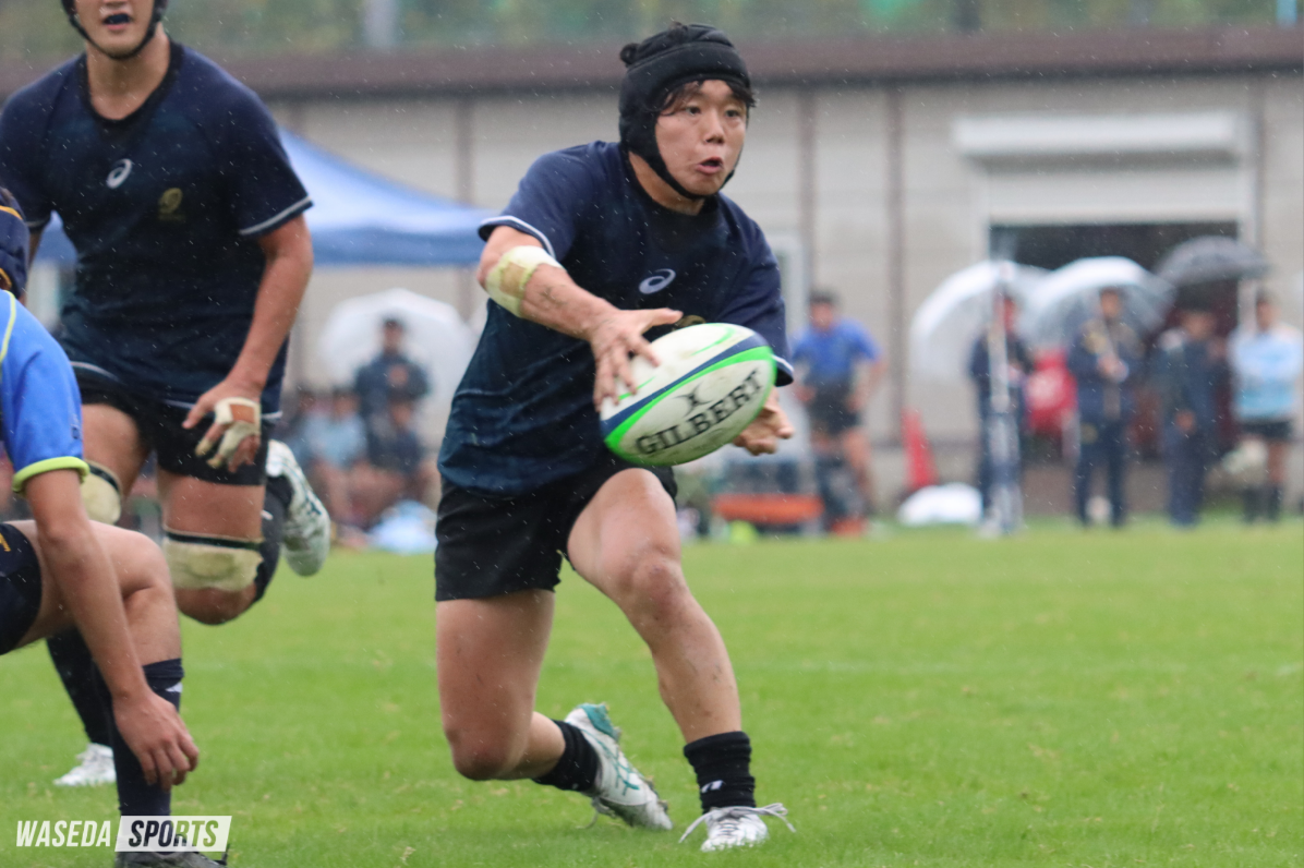 駿河台大のキックオフで始まった試合はいきなり早大Dの好キックで敵陣でのラインアウトを得る。コンタクトが起こるたびに前進した早大Dは思い通りのアタックの形を作り出し、WTB小貫壮太(教3=東京・早大学院)がインゴール右隅に滑り込んで早くも先制点。続く4分、5分の相手ボールスクラムでペナルティーを立て続けに獲得すると、ゴール前でモールを形成。密集からパスされたボールをCTB藤井雄士(社2=北海道・札幌山の手)が力強いキャリーでゴール目前まで持ち込むと、最後はHO野村怜央(商1=兵庫・報徳学園)がグラウンディングに成功。今試合は雨でボールが落ち着かない試合だったため、スクラムを支配した早大Dが優位に立つのは当然の展開であった。9分、またも相手ボールスクラムをペナルティーでターンオーバーすると敵陣ラインアウトをすぐにセットし、駿河台大ディフェンスが揃う前に攻撃を始めた早大D。SO寺田結(スポ2=広島・尾道)が守備の乱れを見逃さず、ラインブレイクに成功すると早いテンポで順目に展開。最後はFB細田悠介(スポ2=福岡・修猷館)がインゴールを駆け抜けた。セットプレーで試合の流れを完全につかむと、22分にモールでも得点を挙げる。再開のキックオフをキャッチしたNO・8山下広一朗(創理4=東京・早大学院)がラインブレイクするとCTB鈴木彪馬(スポ2=東京・国学院久我山)がオフロードパスをキャッチ。敵陣深くに持ち込み、最後はインゴール左隅にSH安岡叶夢(社2=大阪桐蔭)が飛び込んだ。この時点でスコアは31ー0。続く26分、小貫が快足を生かしてこの日2本目のトライを挙げ、36分にはCTB齊藤慧士郎(社1=宮城・仙台第三)のナイスタックルから得た反則をFL谷司馬人(教4=東京・早実)が素早く再開し、ゴール中央にボールを置いた。終了間際に鈴木彪、NO・8髙橋松大郎(スポ3=愛媛・松山東)が得点を追加し、59ー0で前半を終えた。