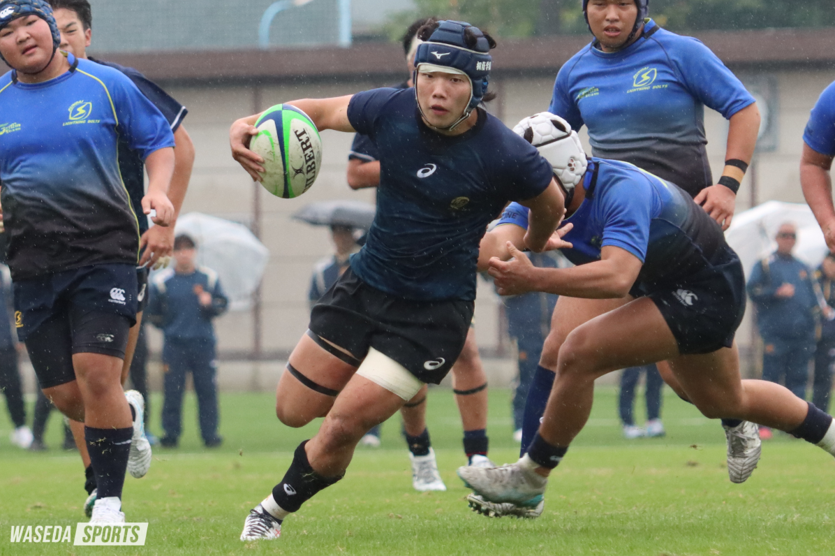 シーズンの深まりを告げるような冷たい霧雨が降る上井草グラウンドで行われたのは早大Dと駿河台大の一戦。16名の1年生がメンバー登録され、各学年の選手が混在する早大Dだったが、見事な連携で駿河台大を圧倒して見せた。スクラムでは8人が1つになった圧倒的なパワーを見せつけ、攻撃では的を絞らせない連動した動きでトライを量産。前半だけで9トライを挙げ、59ー0と大差で40分を終えると、後半も早大Dのトライショー。駿河台大に得点の予感を感じさせることもなく、107ー0と大差で勝利して見せた。