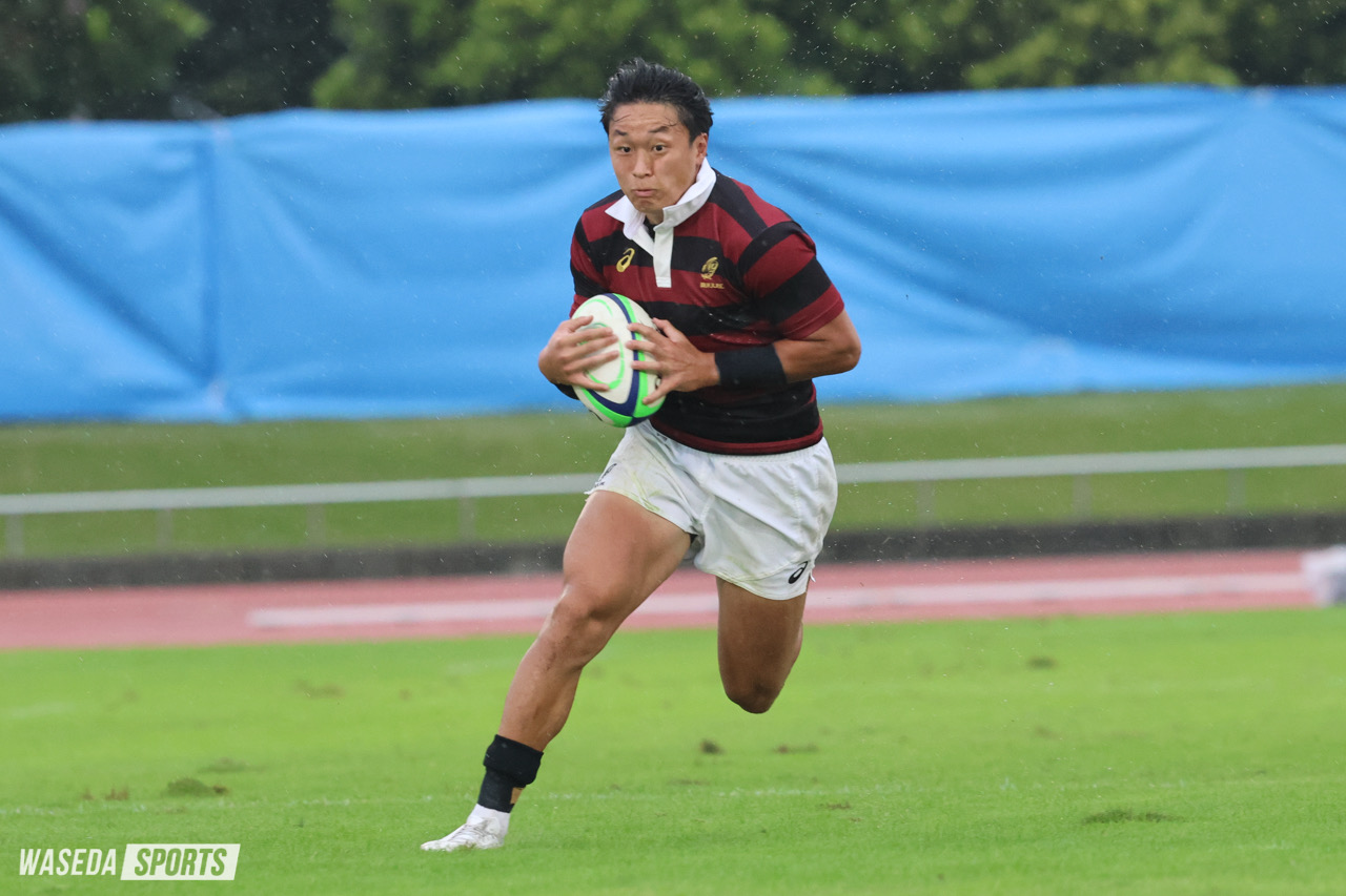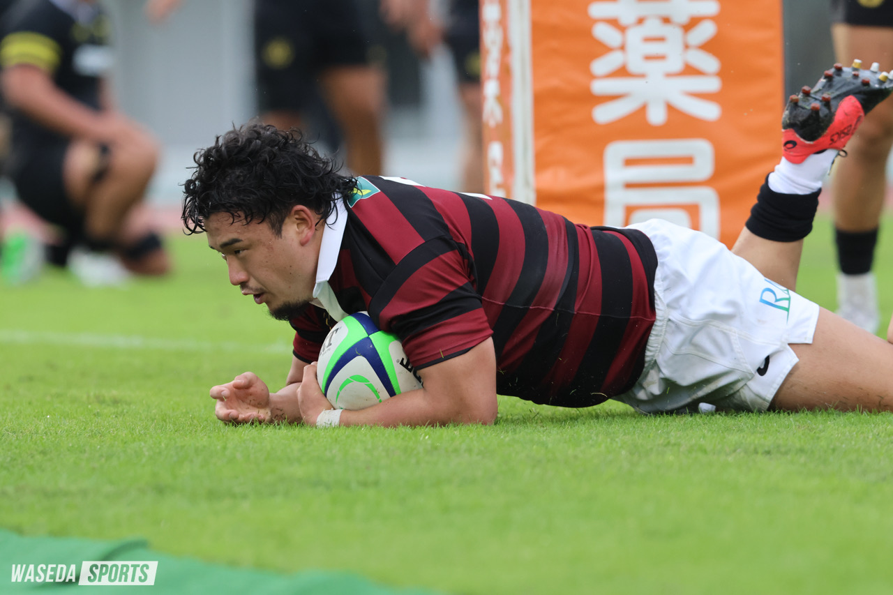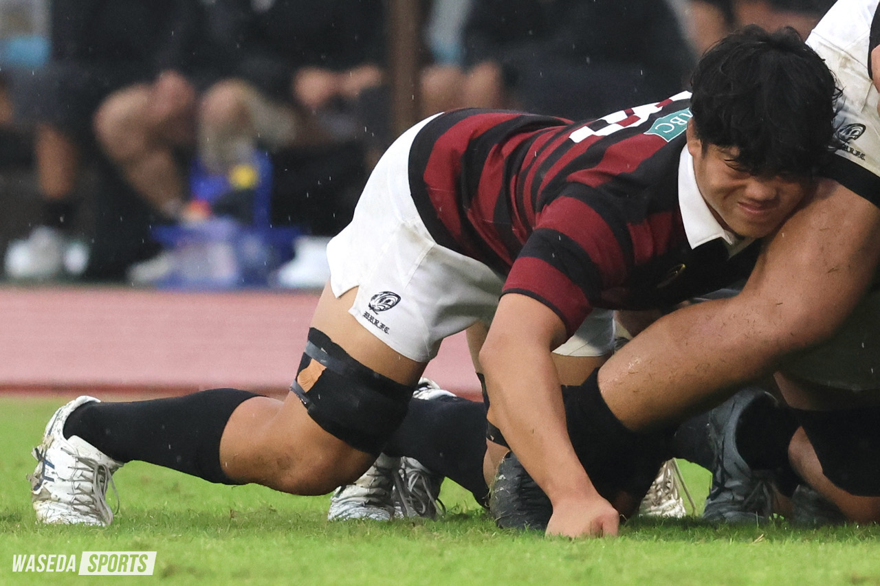 関東大学対抗戦(対抗戦)全勝優勝が懸かる中、迎えたのは夢の島競技場での青学大との一戦。前半開始から接点の激しさが見られる試合展開の中、WTB山下恵士朗(スポ2=早稲田佐賀)、WTB田中健想(社2=神奈川・桐蔭学園)が大外からまくる展開が続き39ー7でファーストハーフを終える。後半も早大が先制点を挙げ、勢い止まらぬままにHO清水健伸(スポ3=東京・国学院久我山)がトライラインにボールをねじ込んだ。フレッシュな面々の活躍も光る中、試合終盤にダメ押しのモール成功。青学大戦は59ー12で早大に軍配が上がった。