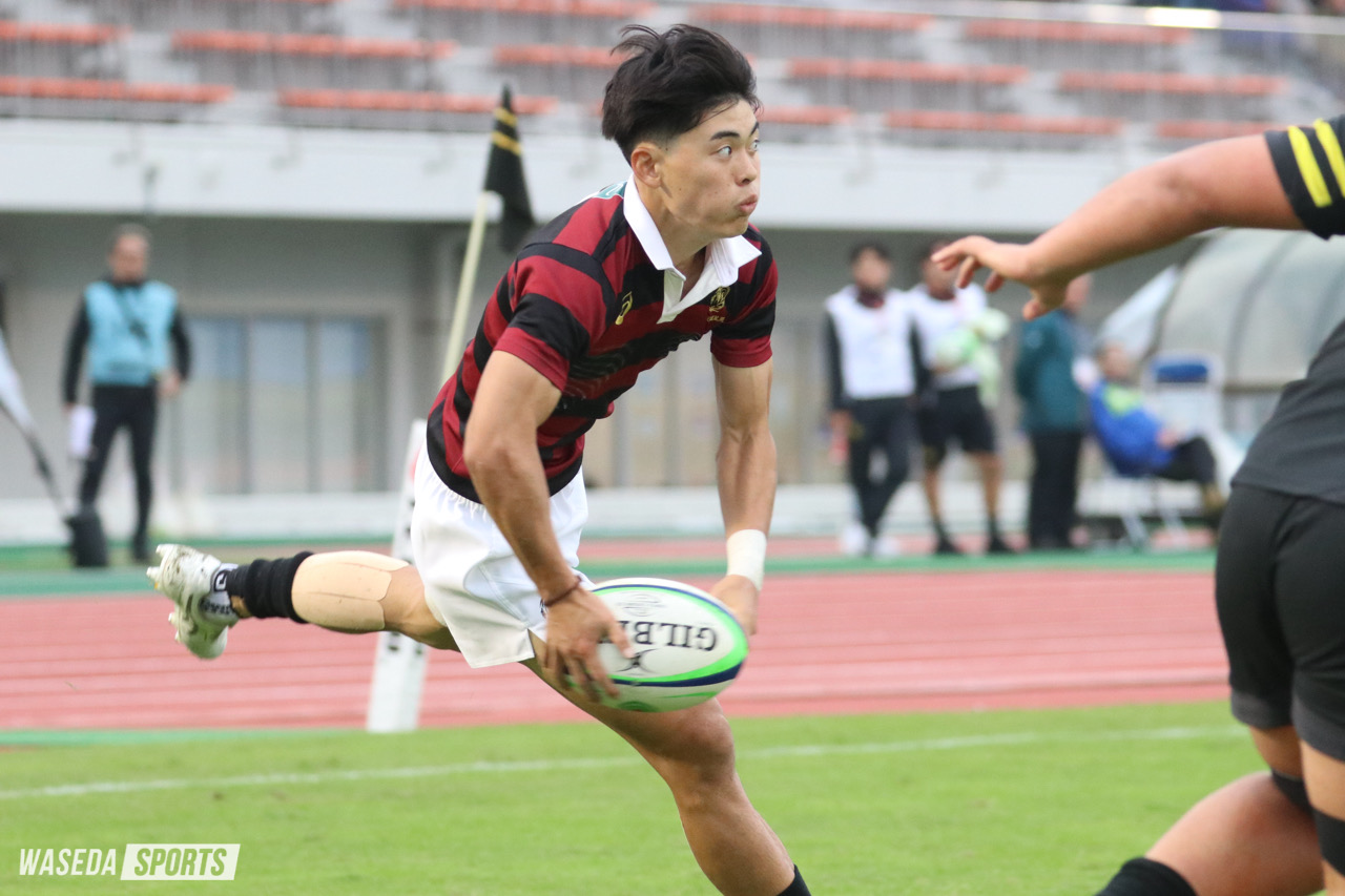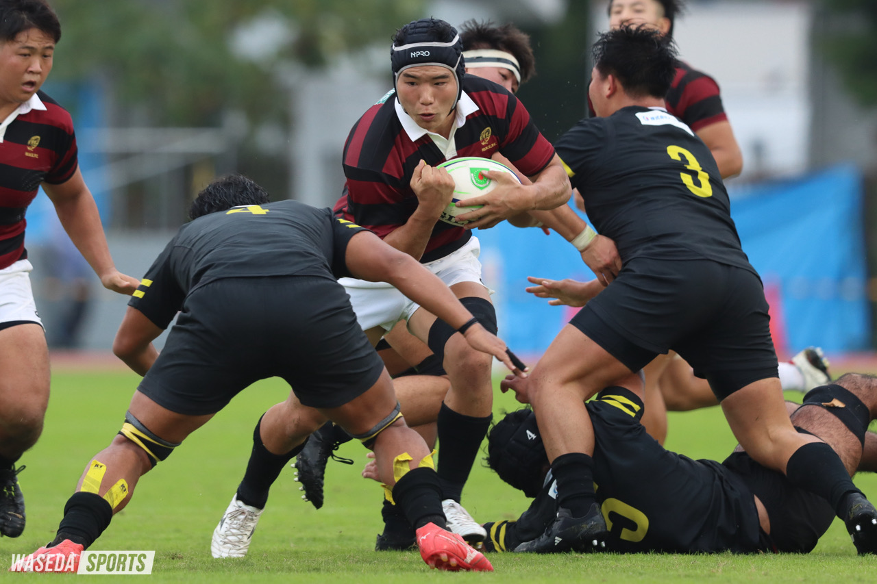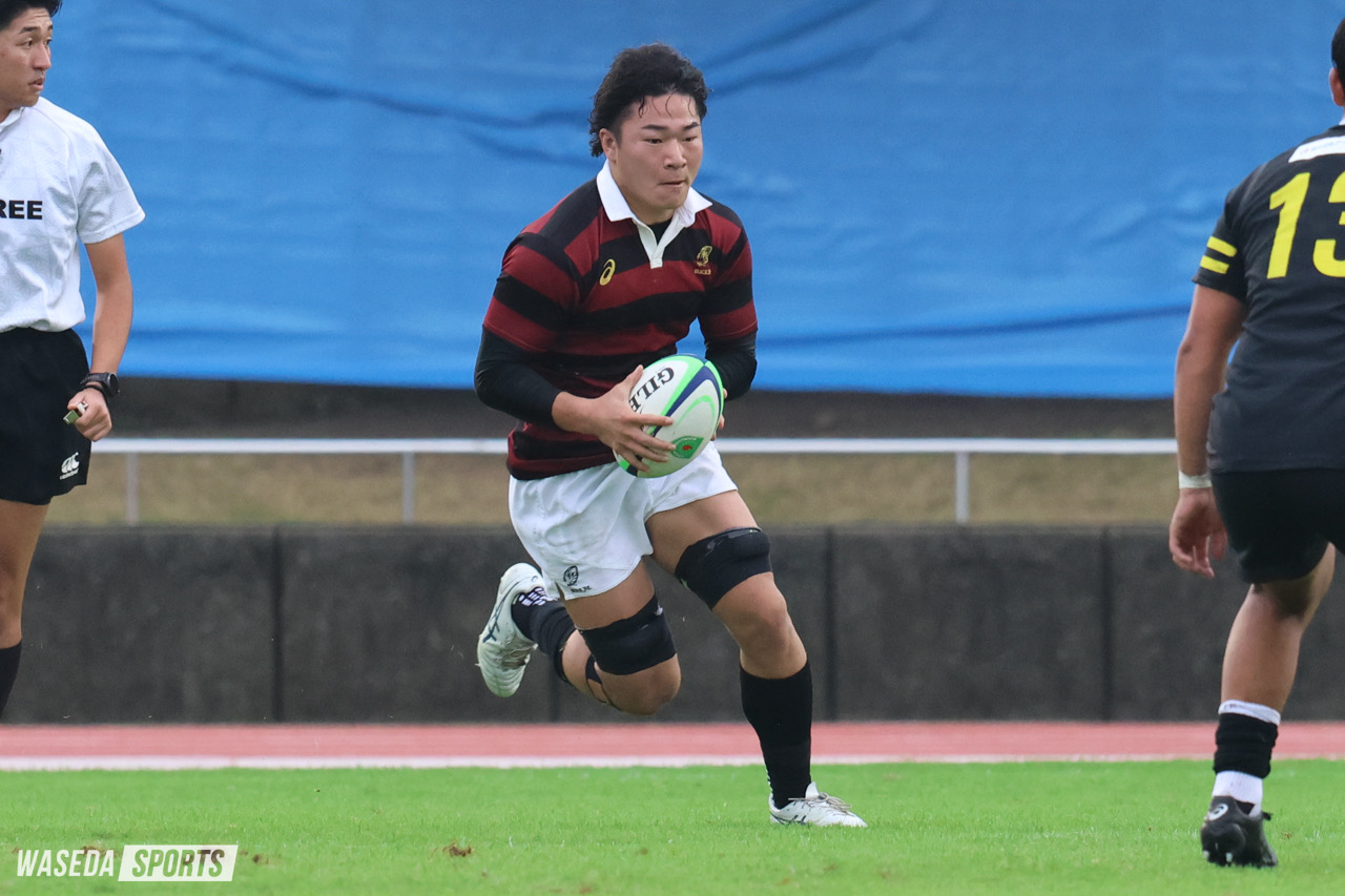 関東大学対抗戦(対抗戦)全勝優勝が懸かる中、迎えたのは夢の島競技場での青学大との一戦。前半開始から接点の激しさが見られる試合展開の中、WTB山下恵士朗(スポ2=早稲田佐賀)、WTB田中健想(社2=神奈川・桐蔭学園)が大外からまくる展開が続き39ー7でファーストハーフを終える。後半も早大が先制点を挙げ、勢い止まらぬままにHO清水健伸(スポ3=東京・国学院久我山)がトライラインにボールをねじ込んだ。フレッシュな面々の活躍も光る中、試合終盤にダメ押しのモール成功。青学大戦は59ー12で早大に軍配が上がった。