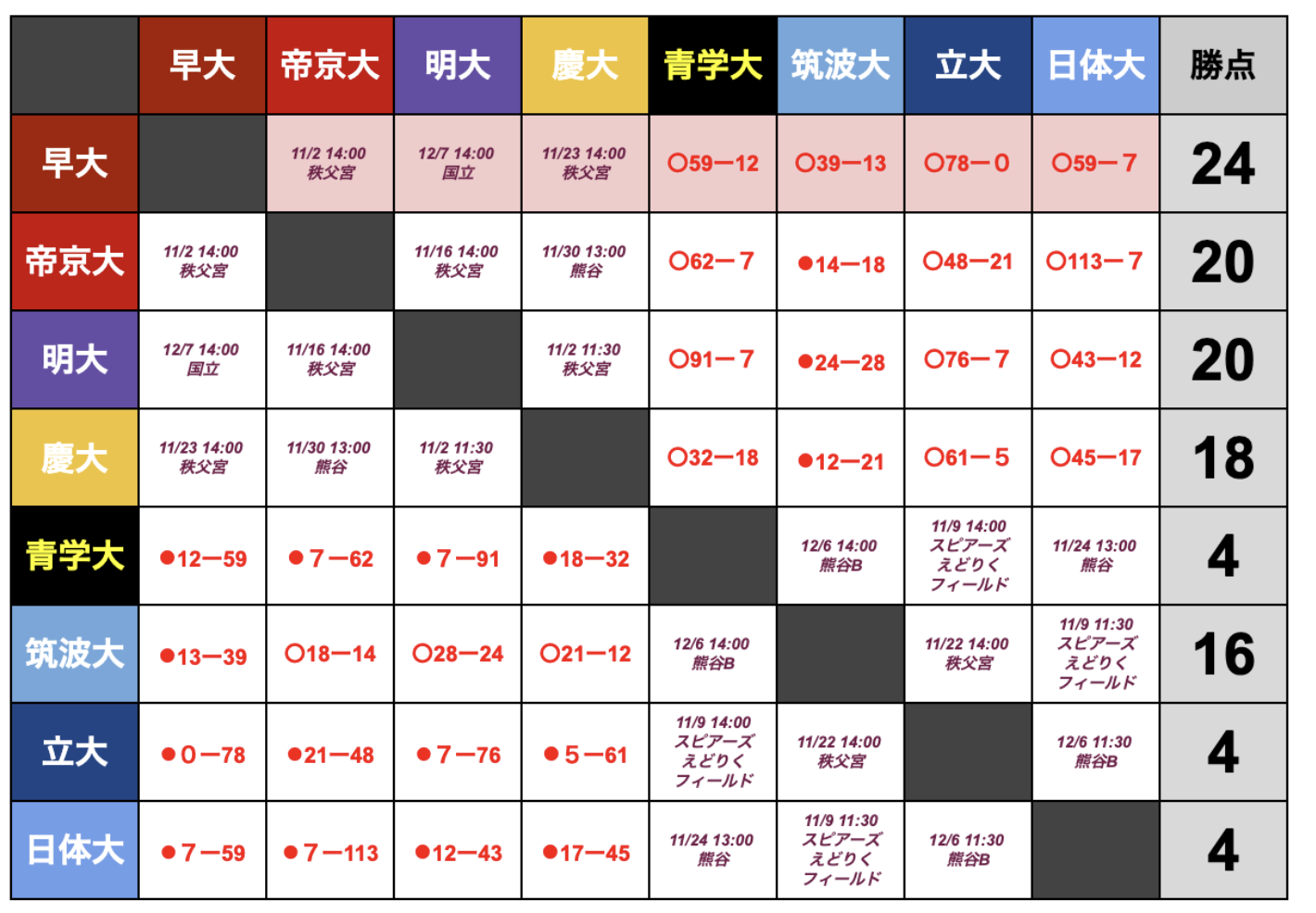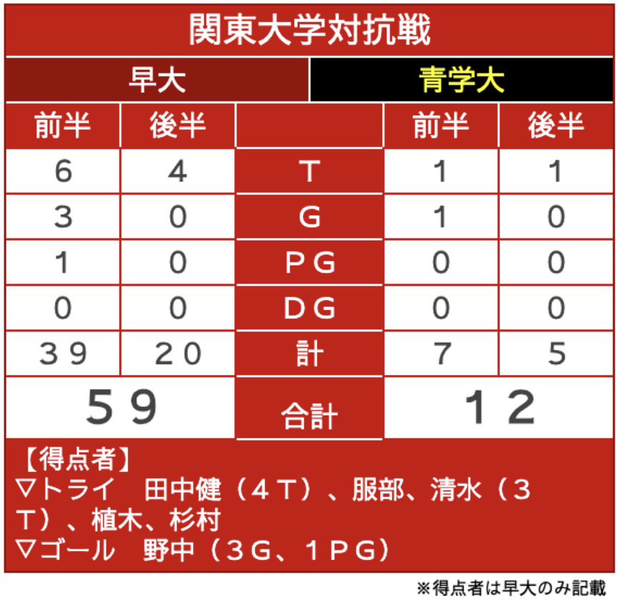 キックだけでなくランで勝負できることを証明しプレーの幅広さを魅せた服部を筆頭に、各々が今後控える残り三試合を戦いきるために必要なスキルを確認できた試合となった。しかしながら、まだ課題は残る。規律の乱れや得点の精度はさらに上げていかなければならないだろう。次なる相手は帝京大。『One Shot』の掛け声が響き渡る秩父宮ラグビー場で、歩みを進める早大フィフティーンを見逃すな。