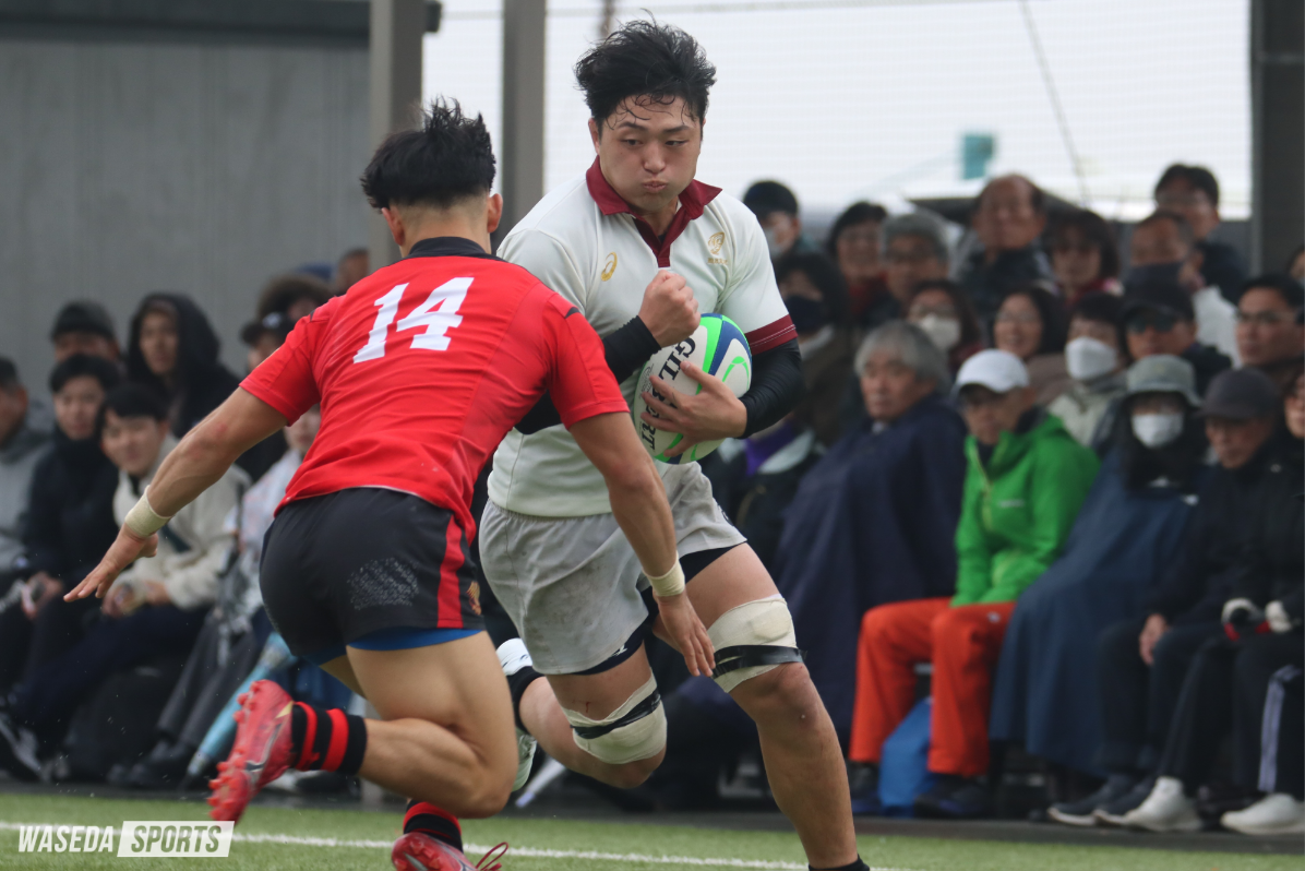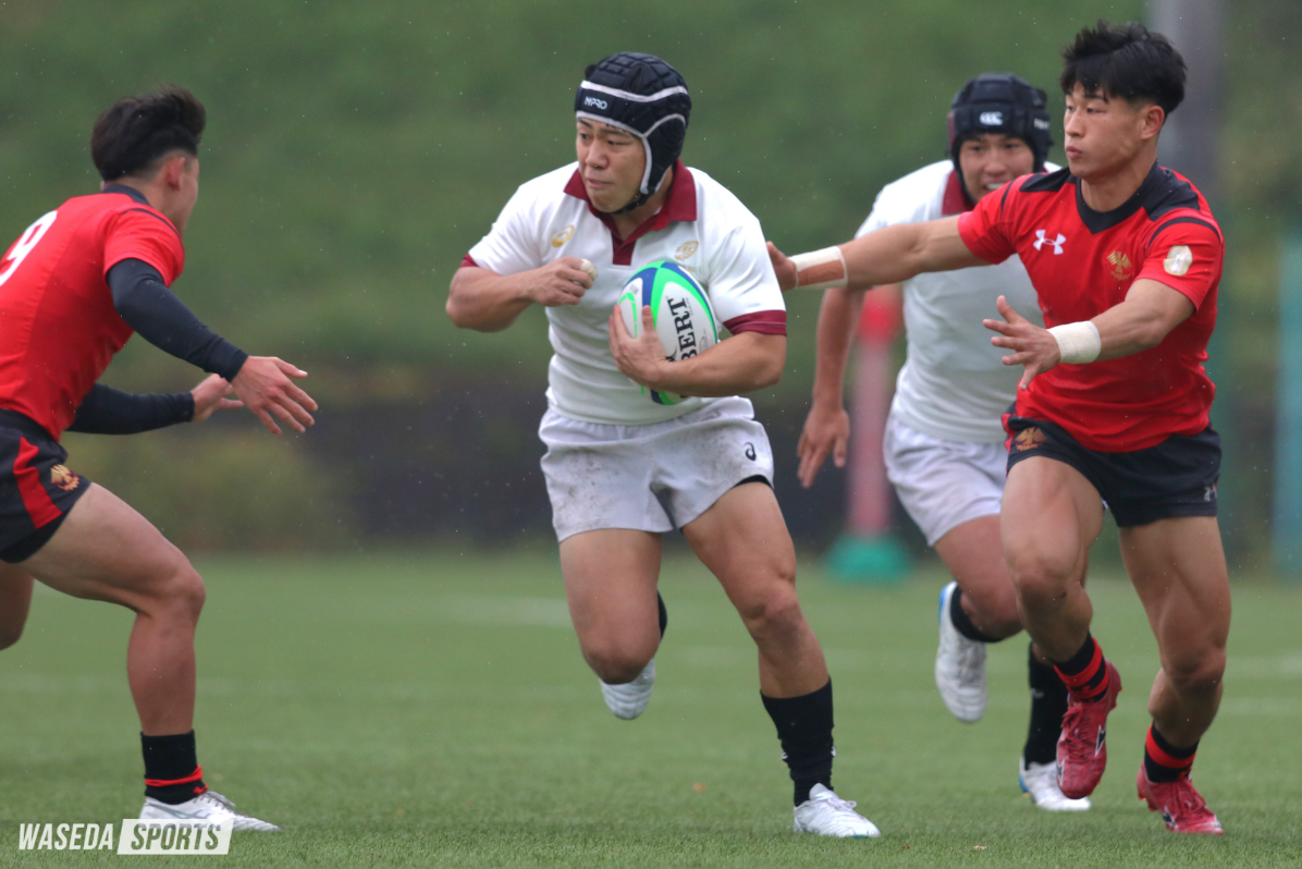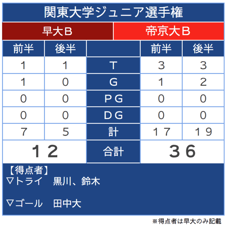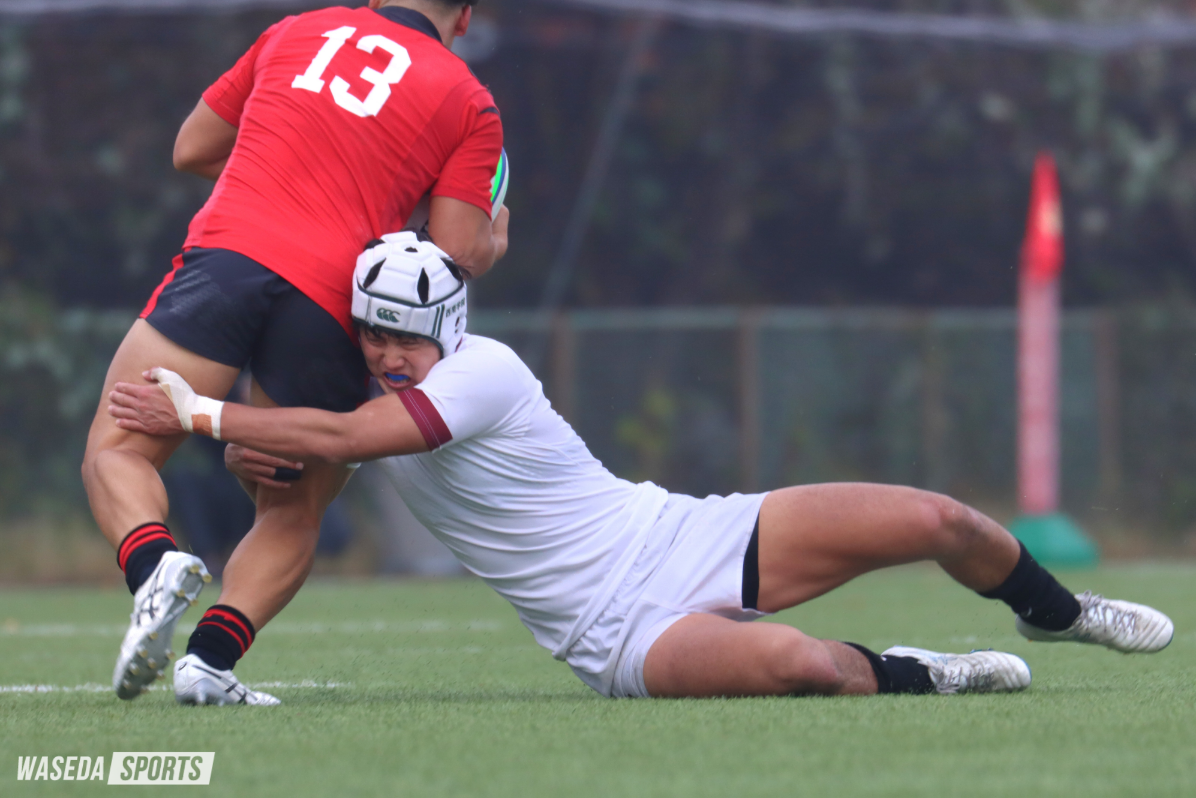 関東大学対抗戦で早大が5点差で帝京大に敗れてから一週間。早くも帝京大へのリベンジのチャンスが巡ってきた。関東大学ジュニア選手権(ジュニア選手権)屈指の好カード、早大B対帝京大Bの一戦は百草グラウンドにて行われた。アグレッシブなアタックで帝京大Bのペナルティーを誘発し、モールを起点に先制に成功した早大B。しかし帝京大Bのフィジカルを活かしたアタックを断ち切ることができず、前半に3トライを許してしまう。後半も立ち上がりに2トライを奪われ、スコアは7ー29。32分にようやく待望の後半初得点を挙げた早大Bだったが、反撃むなしく12ー36でノーサイド。ジュニア選手権リーグフェーズ最終戦にて初黒星を喫した。