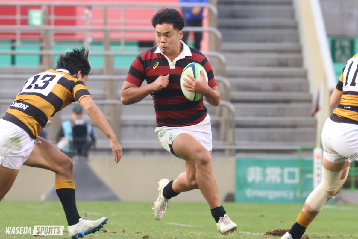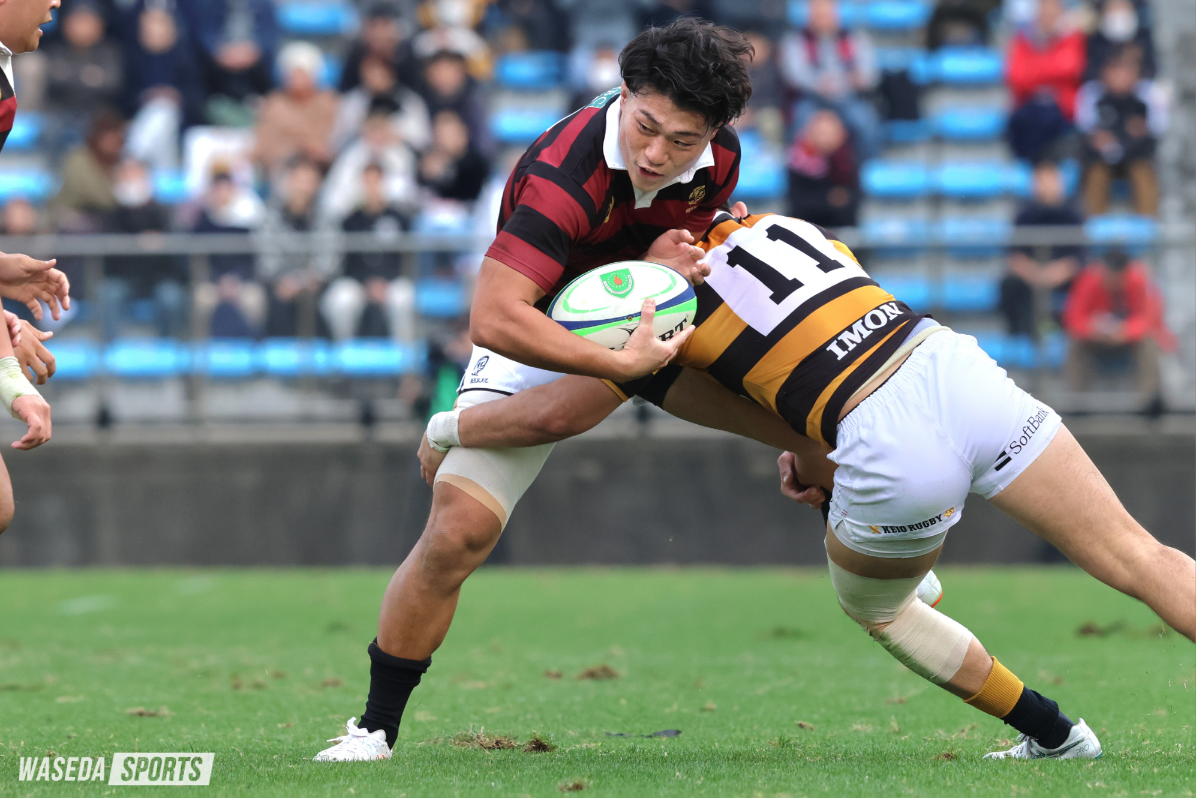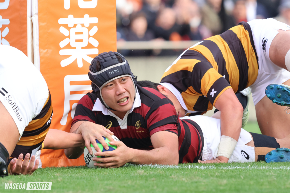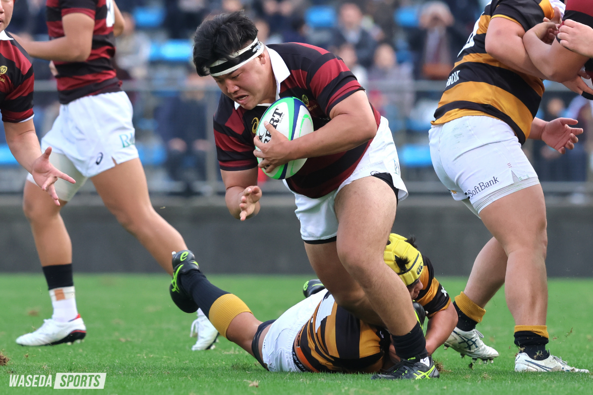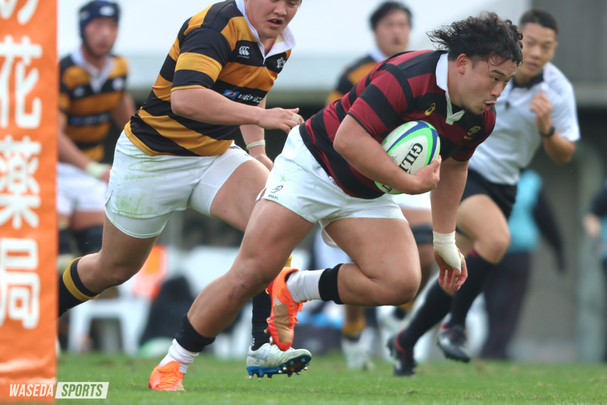 赤と黄、二色の紅葉に彩られた神宮外苑の景色を背に、秩父宮ラグビー場で赤黒と黒黄を身にまとった戦士たちが102回目を迎える伝統の一戦に臨んだ。前節で接戦の末に敗北している者同士、今節は絶対に負けられない。前半から主導権を握る早大は豊富な引き出しから多彩な攻撃を繰り出す。FWがスクラムでプレッシャーをかけ、ボールを有利に支配したかと思えばキックパスを織り交ぜながらBKが慶大のディフェンスを翻弄(ほんろう)。先に2トライを挙げる。対する慶大も突き刺さるディフェンスやSH橋本弾介(慶大)の持ち出しでチャンスを作り反撃し、14-7。しかし勢いの衰えない早大は連続で3トライを奪い、35-7で試合を折り返した。変わって後半、息を吹き返した慶大が19分にはモール、26分には劇的なインターセプトから好機をものにし、35-21と追い上げる。これ以上差を縮められるわけにはいかない早大は途中出場の選手らが躍動し、2本を返すとスコアは49ー21。試合終盤にゴール前まで攻め込まれるも、ディフェンスでプライドを見せた早大がゴールを守り切り、ノーサイド。早慶戦は早大に軍配が上がった。