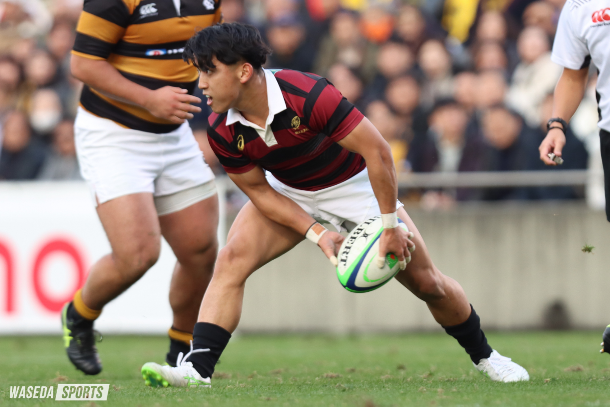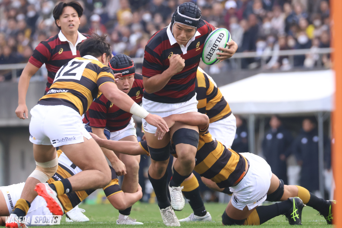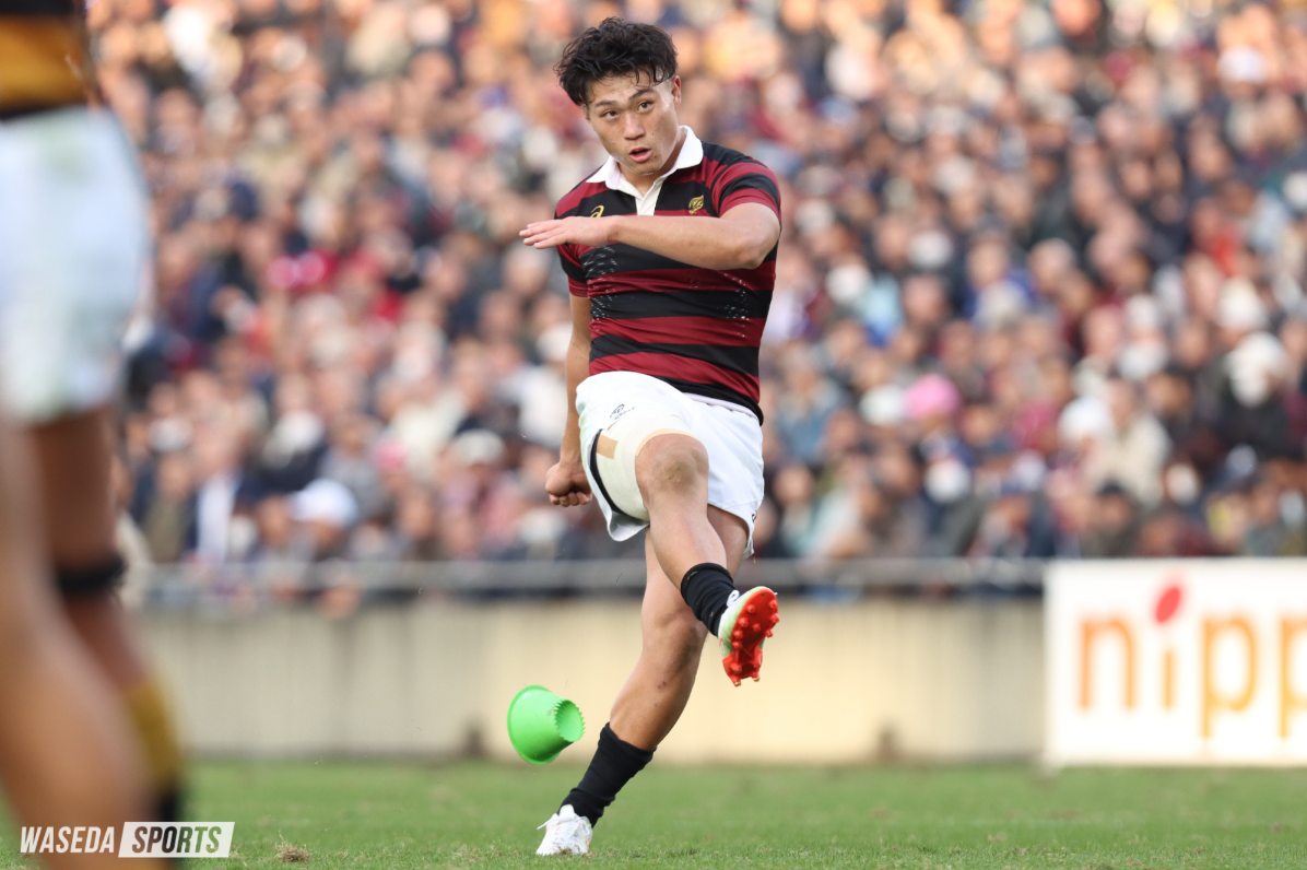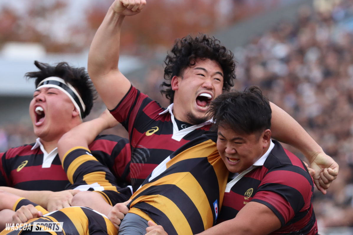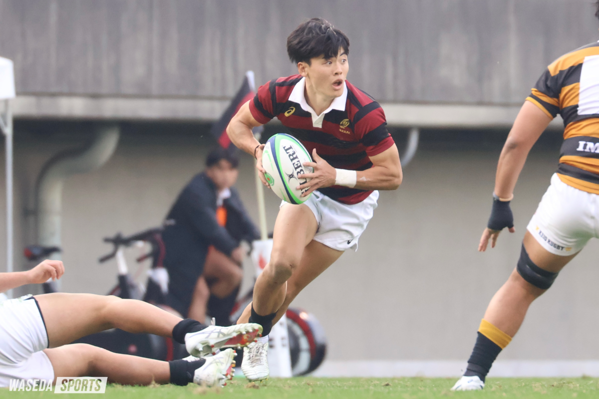 赤と黄、二色の紅葉に彩られた神宮外苑の景色を背に、秩父宮ラグビー場で赤黒と黒黄を身にまとった戦士たちが102回目を迎える伝統の一戦に臨んだ。前節で接戦の末に敗北している者同士、今節は絶対に負けられない。前半から主導権を握る早大は豊富な引き出しから多彩な攻撃を繰り出す。FWがスクラムでプレッシャーをかけ、ボールを有利に支配したかと思えばキックパスを織り交ぜながらBKが慶大のディフェンスを翻弄(ほんろう)。先に2トライを挙げる。対する慶大も突き刺さるディフェンスやSH橋本弾介(慶大)の持ち出しでチャンスを作り反撃し、14-7。しかし勢いの衰えない早大は連続で3トライを奪い、35-7で試合を折り返した。変わって後半、息を吹き返した慶大が19分にはモール、26分には劇的なインターセプトから好機をものにし、35-21と追い上げる。これ以上差を縮められるわけにはいかない早大は途中出場の選手らが躍動し、2本を返すとスコアは49ー21。試合終盤にゴール前まで攻め込まれるも、ディフェンスでプライドを見せた早大がゴールを守り切り、ノーサイド。早慶戦は早大に軍配が上がった。
