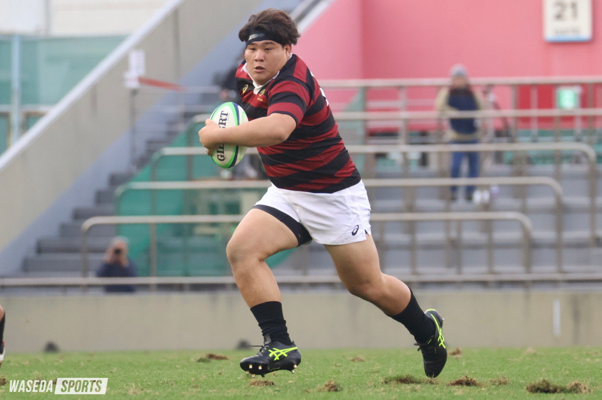 後半に入り、流れを渡したくない早大だったがキックオフ直後、自陣深くでノックフォワードをしてしまう。いきなりピンチを迎えてしまうが、ここは矢崎のスティールが光った。その後は互いに好機を生み出しながらもミスやディフェンスの圧で得点につながらない時間が続く。13分には交代で入ったPR平山風希(スポ1=大分東明) が力強いキャリーで突破し、敵陣深くまで攻め込むも決定機を作れない。この膠着状態に終止符を打ったのは慶大だった。19分に敵陣22mライン上でラインアウトを獲得するとモールを形成。早大を後退させると、大きくボールを展開して左隅にトライを挙げた。ここから慶大がギアを上げると、26分にはCTB野中健吾主将(スポ4=東海大大阪仰星)が放ったロングパスをインターセプト。独走トライを献上してしまい、後半無得点の早大は35-21と慶大の猛追を受ける。突き放したい早大はすぐさま平山などの突破を重ね、ゴール前まで攻め込む。力と力のぶつかり合いとなるが、この裏を突いたSH川端隆馬(スポ1=大阪桐蔭)が持ち込んでゴールをたたき割った。続く36分にも得点し、点差を戻した。負けられない慶大は獲得したペナルティーからクイックで仕掛け、じりじりと早大インゴールへと攻め込む。乱れ打ちのようなアタックから再度ペナルティーを誘うとゴール前でのラインアウトを得てラストワンプレー。BKも入ったモールで執念のトライを狙うも早大が守り切り、49-21でノーサイドの笛。拍手が鳴り響く秩父宮には勝利した早大サイドから真っ赤な夕陽が降り注いだ。