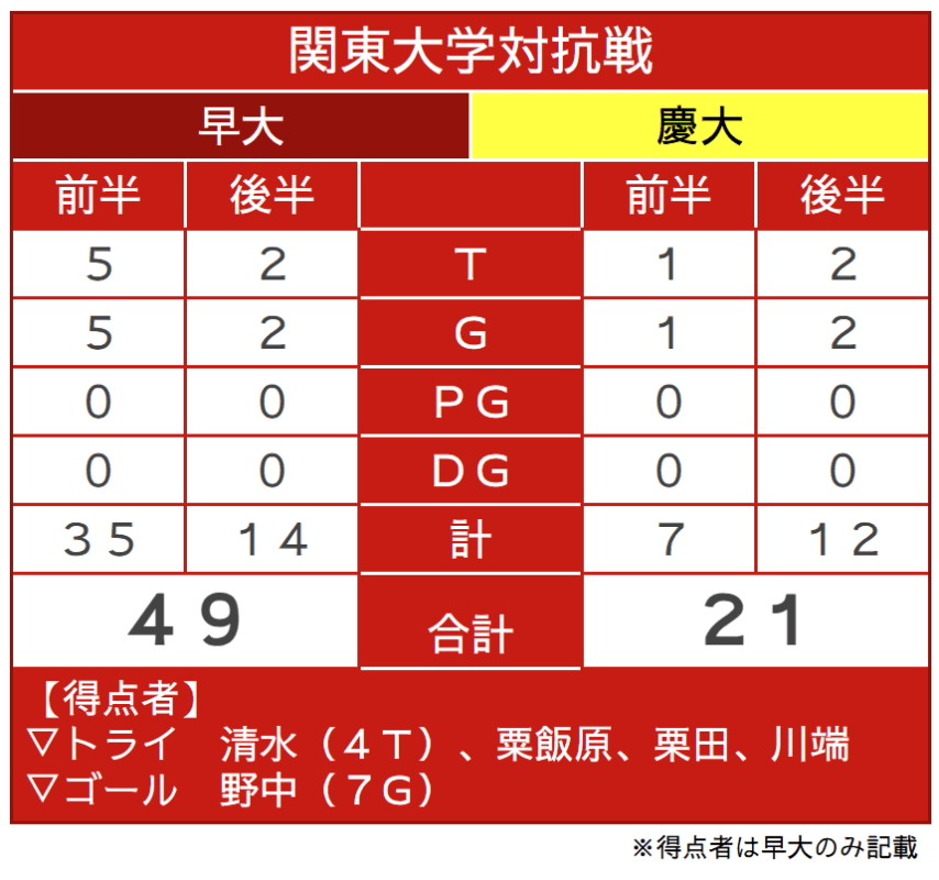 天高く蹴り上げられたキックオフのボールは慶大の胸に収まらず、いきなりファーストスクラムとなる。ここでフリーキックを得た早大はクイックスタートでチャンスを演出するが、ボールを失ってしまう。しかし5分、慶大ゴール前での相手ボールスクラムで組まれたと同時にFWが押し切ってペナルティーを獲得。早大の選手たちの咆哮が響き渡る。再度チャンスを得た早大はラインアウトからモールで押し込み、最後はHO清水健伸(スポ3=東京・国学院久我山)がグラウンディング。今試合初の得点を挙げる。10分には慶大に攻め込まれるもWTB山下恵士朗(スポ2=早稲田佐賀)がチームを救うスティール。相手のノットリリースザボールを誘う。マイボールラインアウトを獲得した早大は外に展開。CTB福島秀法(スポ4=福岡・修猷館)が芸術的なオフロードでボールをつなぐとFB矢崎由高(スポ3=神奈川・桐蔭学園)がゲインする。すると一気に逆サイドへとSО服部亮太(スポ2=佐賀工)がロングパス。福島とNO・8粟飯原謙(スポ4=神奈川・桐蔭学園)でパスをつなぎ大外にトライした。対する慶大は14分に早大陣内でラインアウトを獲得するとモールで前進。そこから左に展開していき、最後は橋本が持ち込み、NO・8中野誠章(慶大)に早大ゴールをこじ開けられた。それでも攻撃の手を緩めない早大はマイボールラインアウトからフェーズを重ね、魂のタックルをはねのけながら前進。服部が一つステップを挟み、走りこんできたLO栗田文介(スポ4=愛知・千種)がインゴールに飛び込んだ。勢いに乗る早大は25分にはモールから、37分にはラインアウトのサインプレーから清水がトライを奪い、ハットトリック。35-7で前半を折り返す。