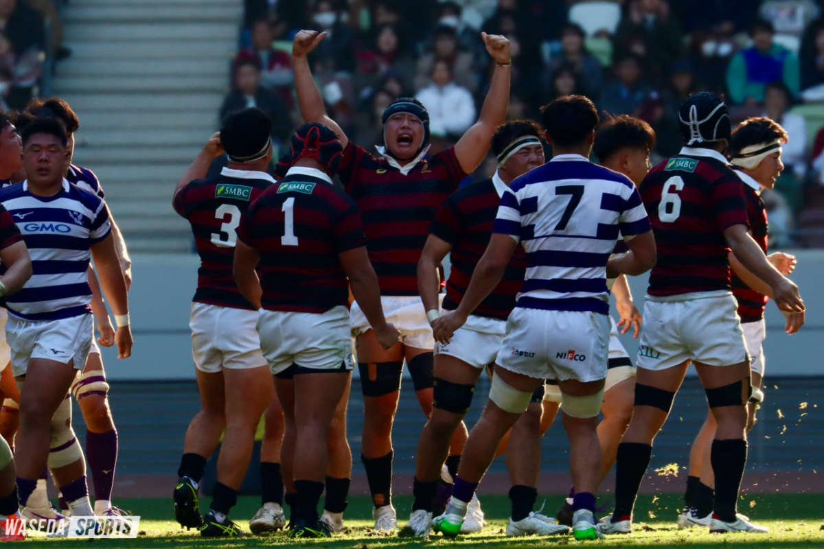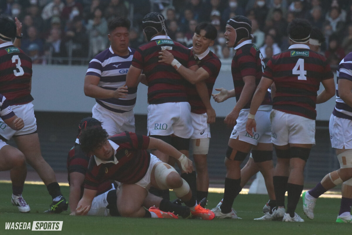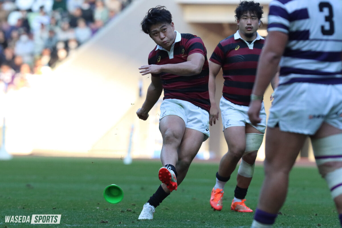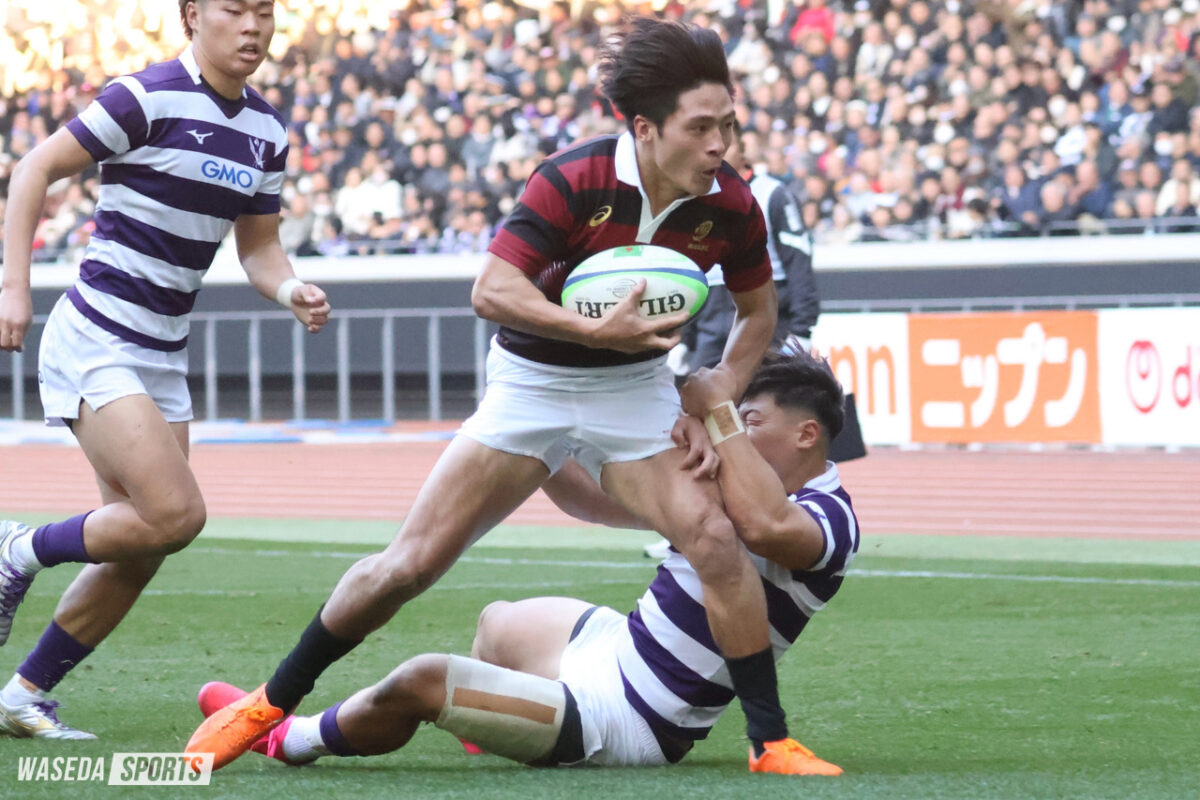 優勝を決する勝負の後半。またも先にチャンスを生み出したのは早大。服部の鋭いステップでラインブレイクすると、PR杉本安伊朗(スポ3=東京・国学院久我山)、矢崎、LO新井瑛大(教3=大阪桐蔭)が力強くゲインし、一気にゴール前へ。インゴールにボールをグラウンディングすることは叶わなかったが、アドバンテージを得ていた早大は得点機を継続する。巧みなパスワークで見事にディフェンスのギャップを突き、矢崎がインゴールに飛び込んだ。しかし、判定はオブストラクション。得点は認められず、スコアは10ー10のまま。チャンスから一転、キック処理でミスが出た早大に明大が一気に襲い掛かる。自陣深くでチャージされると、ボールはそのまま紫紺のジャージに。後半最初のトライを奪われることとなった。重戦車相手にスクラムで反則を何度も獲得するなど、確実に明大を押し込んでいた早大。しかし、アタックのミスから後退を余儀なくされるとPGで3点を重ねられ、10ー18と点差は8点に広がった。「追っている場合なら7点差以内に持っていくというのは大事なセオリー」と大田尾竜彦監督(平 16 人卒=佐賀工)が述べたように、敵陣での長い笛は野中の正確なキックで3点に変え、明大の背中を常に捉え続けた早大。2本のPGを決め、2点差にまで詰め寄ると試合は残り15分。時間を考えると、次のトライが試合の結果を大きく左右することは間違いなかった。そんな重要な局面を制したのは明大だった。モールを押し込み、手を伸ばした先は早大のトライライン。難しい角度のキックも決まり、16ー25と今試合最も大きな点差をつけられた。早大はすぐにPGを沈め、6点差に詰め寄る。早大が欲しかったのはここまで奪われてきたリードを一発でひっくり返すトライ。ノータイムを迎え、早大は中央で獲得したハイタックルのペナルティーをキックパスで再開。右ライン際から大きく展開したボールはWTB鈴木寛大(スポ3=岡山・倉敷)の手に渡り、迎えた最終局面はまさに昨年、早大がリードを守り切ったラストプレーの場面と重なるものがあった。ブレイクダウンでのノックフォワードの反則を取られ、優勝をこぼした早大。明大の歓喜の声とともに、ノーサイドの笛が鳴り響いた。