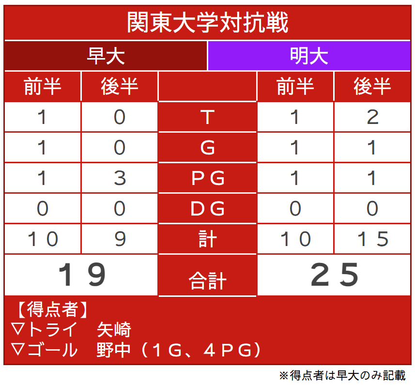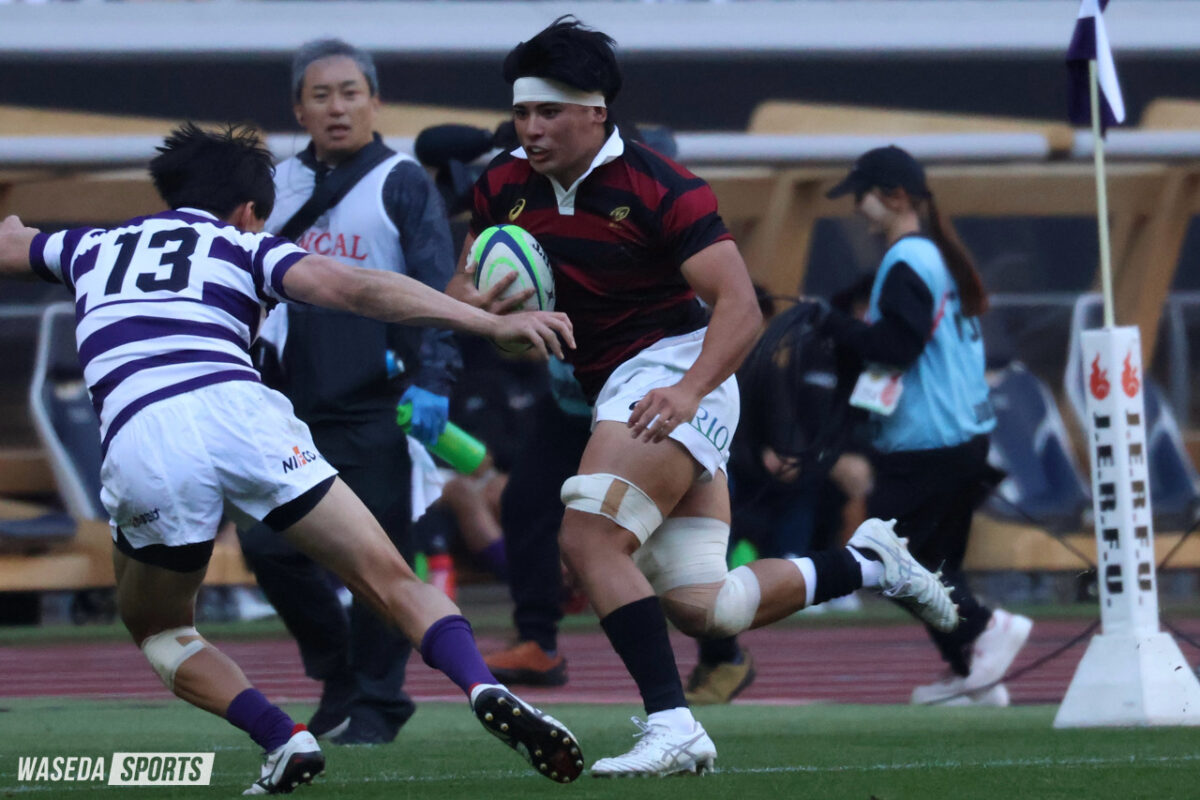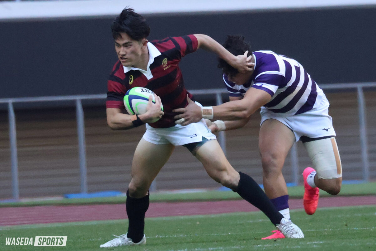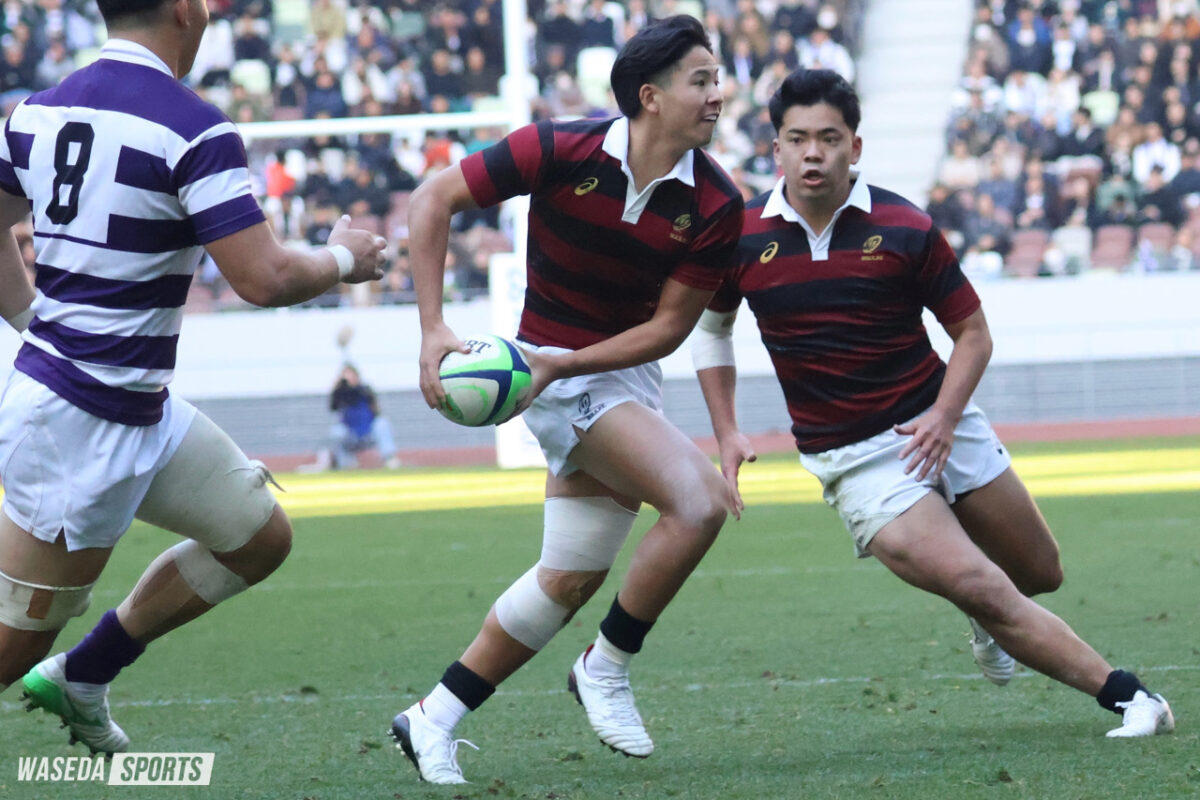 優勝を決する勝負の後半。またも先にチャンスを生み出したのは早大。服部の鋭いステップでラインブレイクすると、PR杉本安伊朗(スポ3=東京・国学院久我山)、矢崎、LO新井瑛大(教3=大阪桐蔭)が力強くゲインし、一気にゴール前へ。インゴールにボールをグラウンディングすることは叶わなかったが、アドバンテージを得ていた早大は得点機を継続する。巧みなパスワークで見事にディフェンスのギャップを突き、矢崎がインゴールに飛び込んだ。しかし、判定はオブストラクション。得点は認められず、スコアは10ー10のまま。チャンスから一転、キック処理でミスが出た早大に明大が一気に襲い掛かる。自陣深くでチャージされると、ボールはそのまま紫紺のジャージに。後半最初のトライを奪われることとなった。重戦車相手にスクラムで反則を何度も獲得するなど、確実に明大を押し込んでいた早大。しかし、アタックのミスから後退を余儀なくされるとPGで3点を重ねられ、10ー18と点差は8点に広がった。「追っている場合なら7点差以内に持っていくというのは大事なセオリー」と大田尾竜彦監督(平 16 人卒=佐賀工)が述べたように、敵陣での長い笛は野中の正確なキックで3点に変え、明大の背中を常に捉え続けた早大。2本のPGを決め、2点差にまで詰め寄ると試合は残り15分。時間を考えると、次のトライが試合の結果を大きく左右することは間違いなかった。そんな重要な局面を制したのは明大だった。モールを押し込み、手を伸ばした先は早大のトライライン。難しい角度のキックも決まり、16ー25と今試合最も大きな点差をつけられた。早大はすぐにPGを沈め、6点差に詰め寄る。早大が欲しかったのはここまで奪われてきたリードを一発でひっくり返すトライ。ノータイムを迎え、早大は中央で獲得したハイタックルのペナルティーをキックパスで再開。右ライン際から大きく展開したボールはWTB鈴木寛大(スポ3=岡山・倉敷)の手に渡り、迎えた最終局面はまさに昨年、早大がリードを守り切ったラストプレーの場面と重なるものがあった。ブレイクダウンでのノックフォワードの反則を取られ、優勝をこぼした早大。明大の歓喜の声とともに、ノーサイドの笛が鳴り響いた。