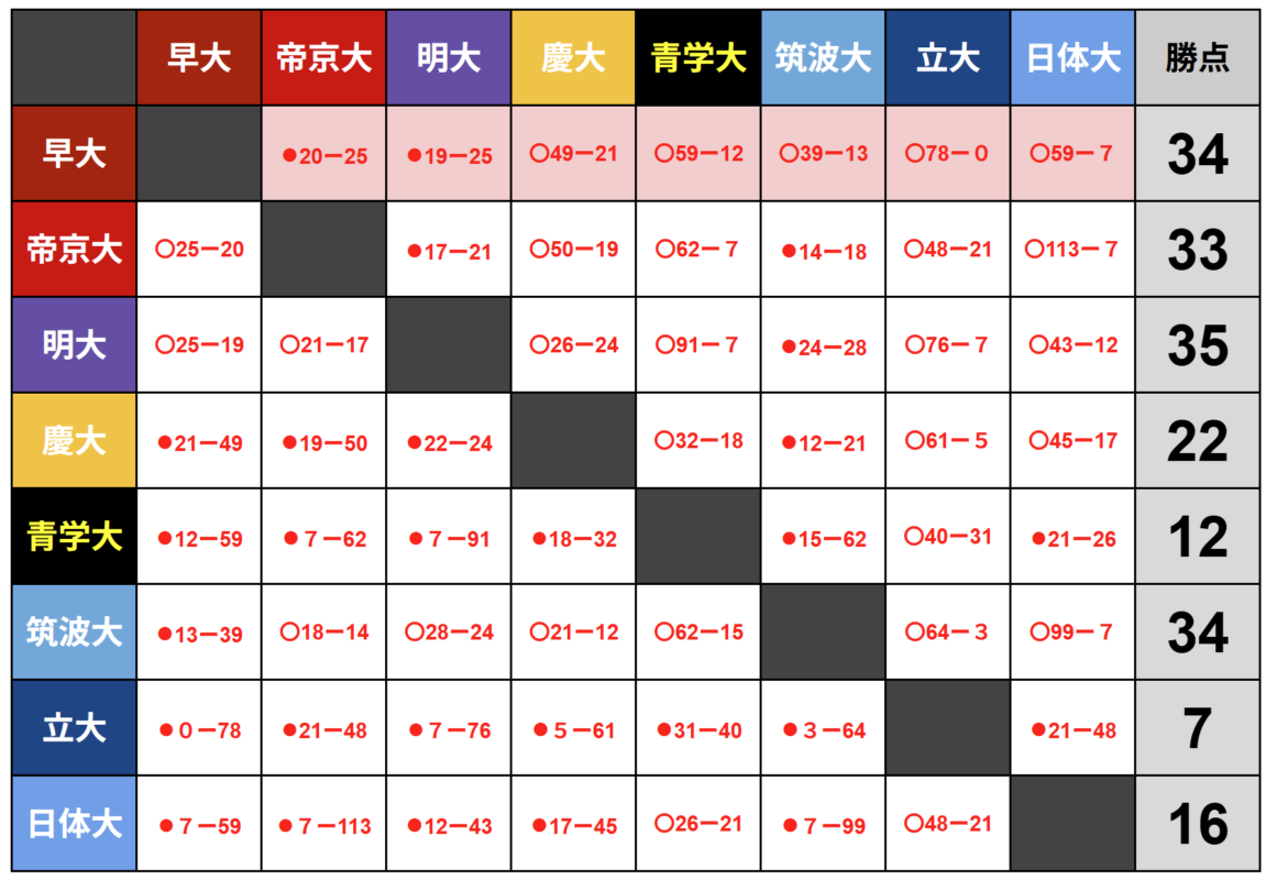 「トライを取り切っていたらというシーンはいくつもあったと思う」。試合後の記者会見で大田尾監督は振り返った。帝京大には5点差で敗れ、明大には6点差での黒星となった。そのどちらも、1トライ1ゴールでひっくり返せる僅差の勝負での敗北。課題だけではなく、収穫の多い敗戦であったことは間違いない。しかし、もう敗北は許されない。負ければ引退のノックアウトステージは来週から始まる。決勝で敗れたあの日から走り続けてきたチーム野中。これまでの日々の努力を肯定するために、今日の敗北を肯定するために、早大は最終局面へと向かう。