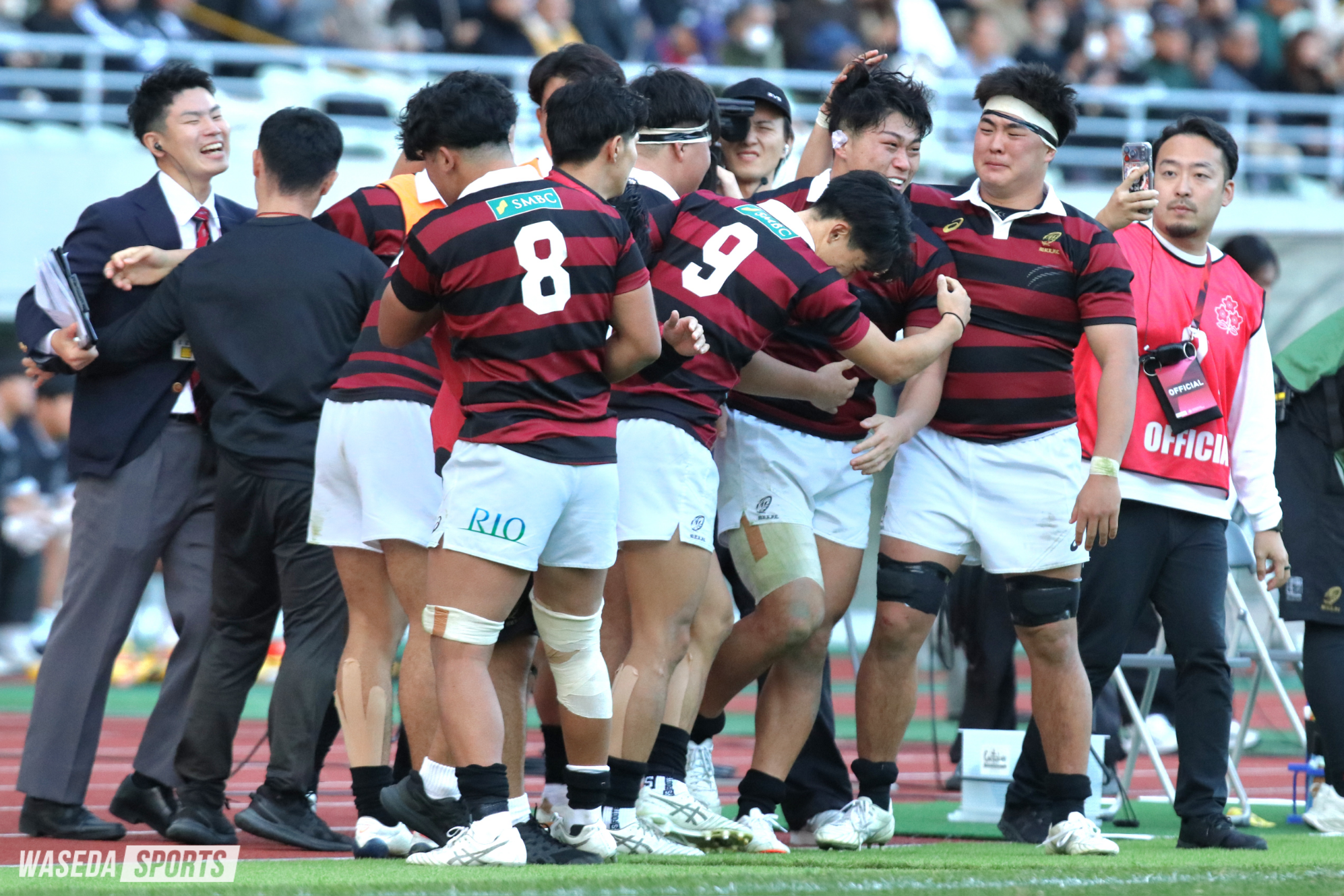 大阪の地でも響いた『One Shot』の掛け声。部員から観客へと波及するその一体感でつば迫り合いのゲームを制した。1トライ1ゴールで試合がひっくり返る小さな点差の中、規律正しい早大のディフェンスは何度も漆黒のジャージに食らいつき、年越しへの切符をつかんで見せた。試合開始から天理大にノーホイッスルトライを許し、暗雲が立ち込めたヤンマースタジアム。しかし焦りを見せなかった早大はシーソーゲームの展開となりながらも得点を重ねる。ラインアウトの安定性は欠いたが、スクラムで優位に立った早大。反則を獲得しながら前半を19ー14と5点のリードを奪って終えた。続く後半はノースコアのまま時計の針が進み、次の1トライがその後の行方を左右することは間違いなかった。我慢強い守備で天理大アタックのミスを誘発した早大は少ないチャンスで得点を生み出し、天理大を突き放す。点差を縮められた試合終盤は引退のかかった緊迫感のある雰囲気の中、タックルで勝利を手繰り寄せた早大が2026年1月2日の国立競技場へ駒を進めた。