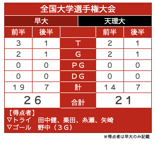 「早明戦が終わり、大学選手権のトーナメントを見た時にここが最大のヤマ場になると思っていた」と大田尾竜彦監督(平 16 人卒=佐賀工)が振り返ったように、一進一退の攻防はまさに手に汗握る戦いであった。5点のリードを追いかけられるというプレッシャーのかかる展開の中、早大のディフェンスは最後まで乱れることがなかった。「(関東大学)ジュニア選手権で優勝したメンバーが勢いを与えてくれた」。試合後のインタビューで田中勇が語ったのは天理大のアタックをコピーしたBチームへの感謝。関西王者との対戦に向け、チームが一丸となった証が今試合の勝利だろう。チーム野中は年越しに成功し、次戦は国立競技場での帝京大戦。昨季の決勝での借りを返し、頂を懸けた戦いに駒を進めることができるか。『荒ぶる』への大きな一歩を踏み出すため、避けられない真紅のジャージとの対戦で白星を奪い取れ。