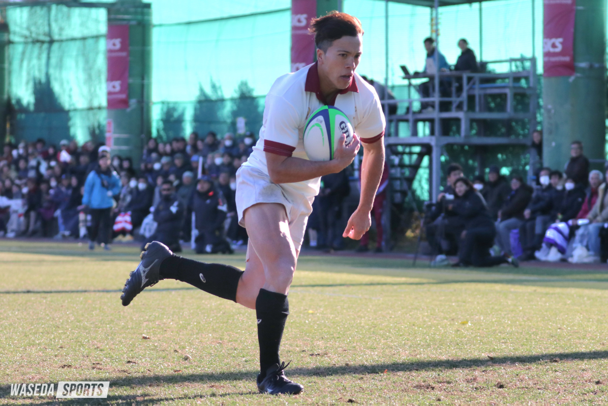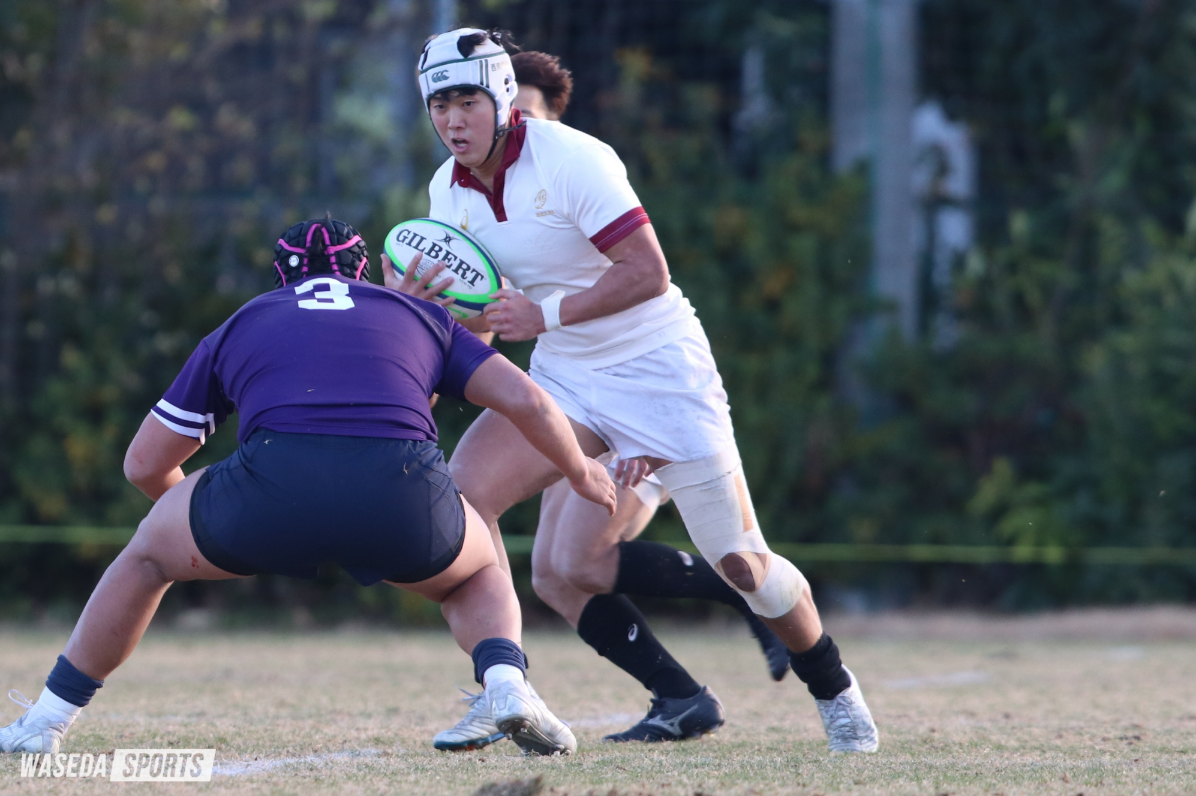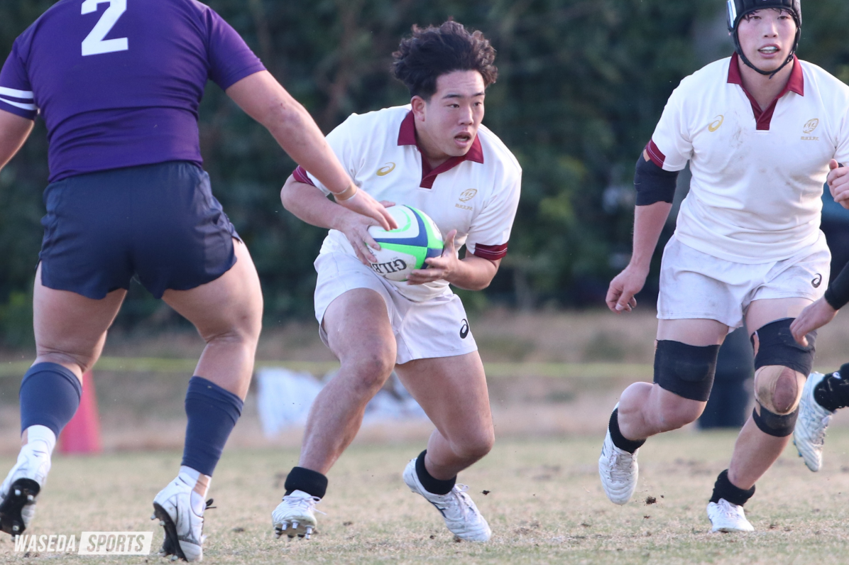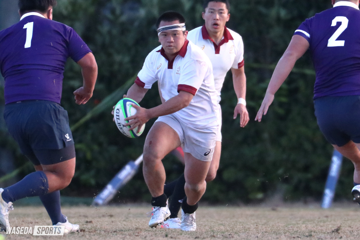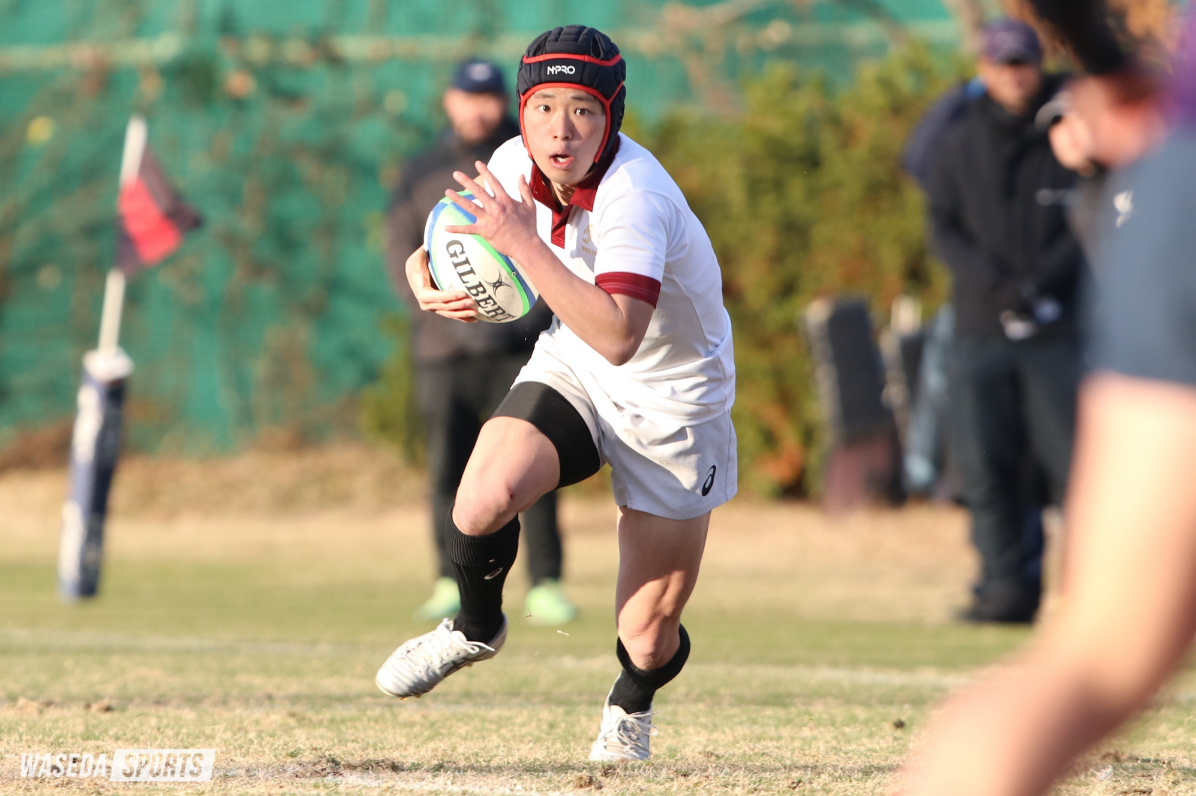 前半は仲山のキックオフで幕を開けた。強風が吹き荒れ、ゲームメイクが難しい状況の中、早大は風下に立ち、前半の行方は仲山のゲームコントロールに託された。明大のキックが風に流されてデッドラインを越えると、早大は開始早々、敵陣でのマイボールスクラムからチャンスを得る。5分、そのスクラムから仲山が一瞬のギャップを突いてビッグゲイン。最後はWTB小澤アンディ(法4=千葉・流経大柏)にボールが渡り、そのままゴールラインへ。風下という不利な条件の中でも、早大は幸先の良いスタートを切った。早大はアタックだけでなく、ディフェンスでも気持ちのこもったプレーを見せた。誰かが抜かれても、必ず誰かが止める。中でも光ったのが、LO萩原武大(スポ4=茨城・茗渓学園)の献身性だ。内側から鋭くプレッシャーをかけ、味方が窮地に陥れば即座にカバー。相手のチャンスの芽を次々と摘み取った。10分、早大にピンチが訪れる。スクラムで劣勢に立たされると自陣深くまで押し込まれ、ラインアウトモールを形成される。自陣5メートルラインまで迫られる大ピンチも、FWが一体となって一度は凌ぐ。しかし12分、明大に細かなパスを繋がれ、ついにインゴールを明け渡し、スコアは5ー7に。そして20分には連続失点を許し、5ー14と点差を広げられる。しかし、その後も得点を許しかねない場面で、萩原とCTB森田倫太朗(スポ3=兵庫・報徳)が決死のタックルを見せ、相手を仕留め切った。そして30分、上井草を揺らすビッグプレーが飛び出す。明大のキックを高栁が処理すると、迫り来るディフェンスを次々とかわしてビッグゲイン。自陣22メートルラインから一気に独走し、相手を寄せつけることなくゴールラインを駆け抜けた。その後も森田や萩原、LO米倉翔(スポ3=福岡・修猷館)の鋭いキャリー、さらには相手の陣形を見極めた仲山のキックなど、プライドを示すプレーが続く。しかし得点には結びつかず、10ー14でハーフタイムを迎えた。