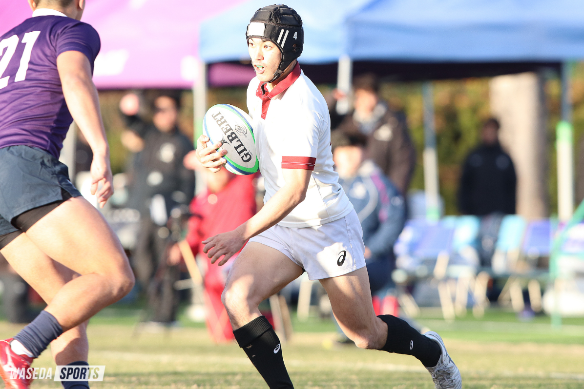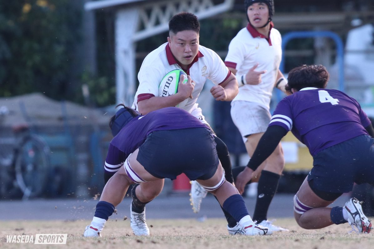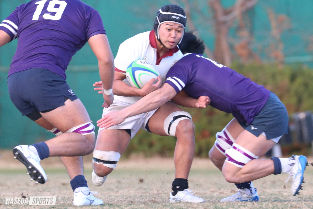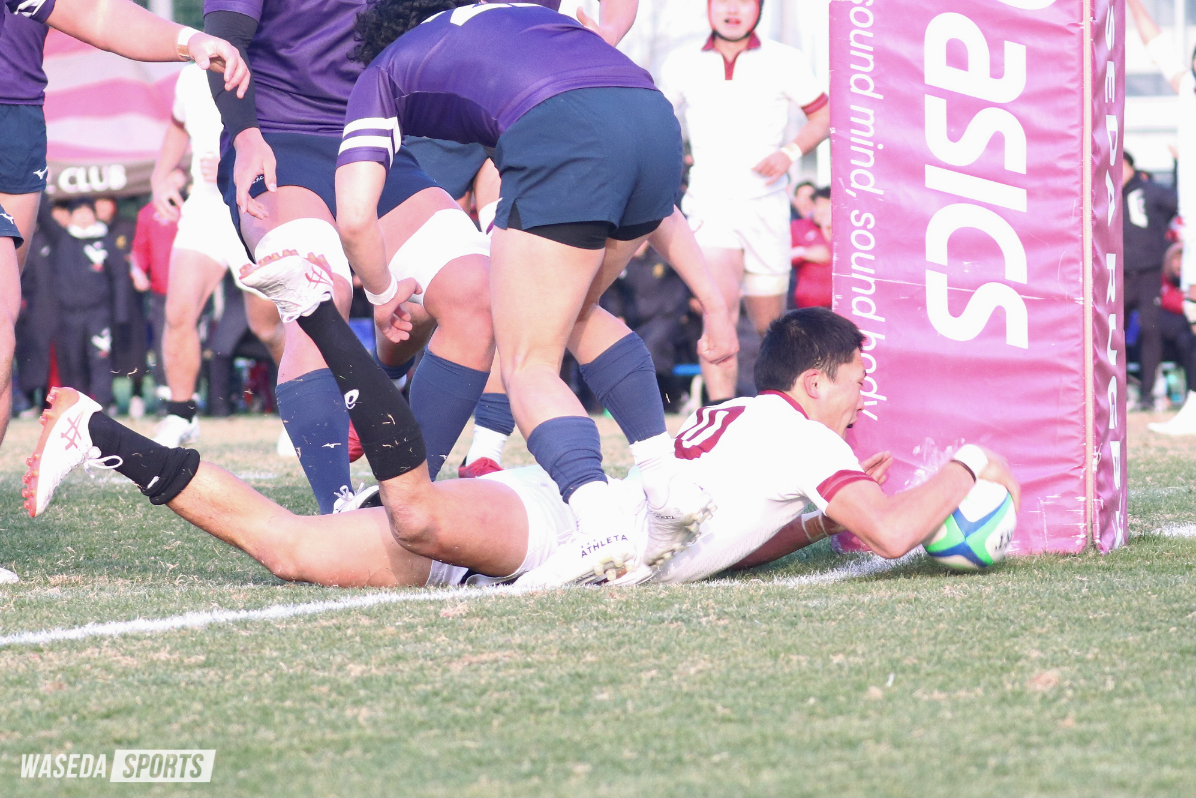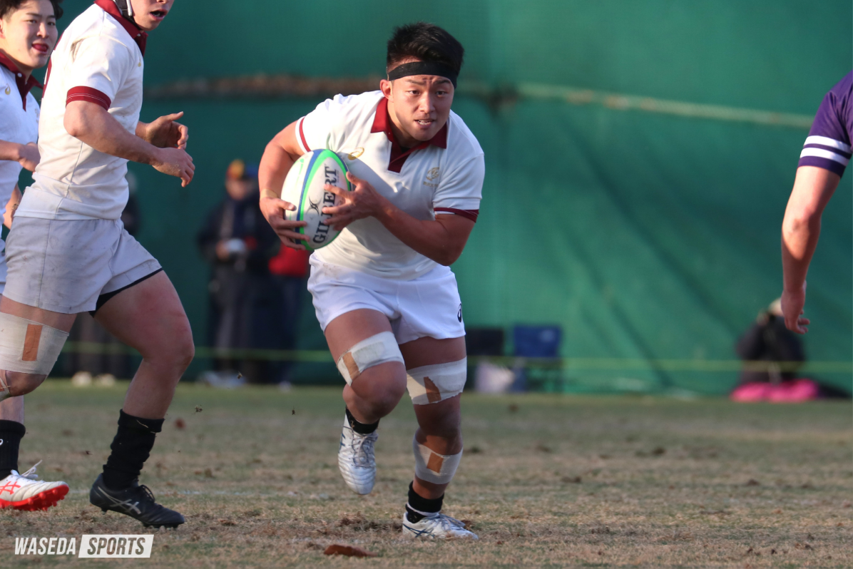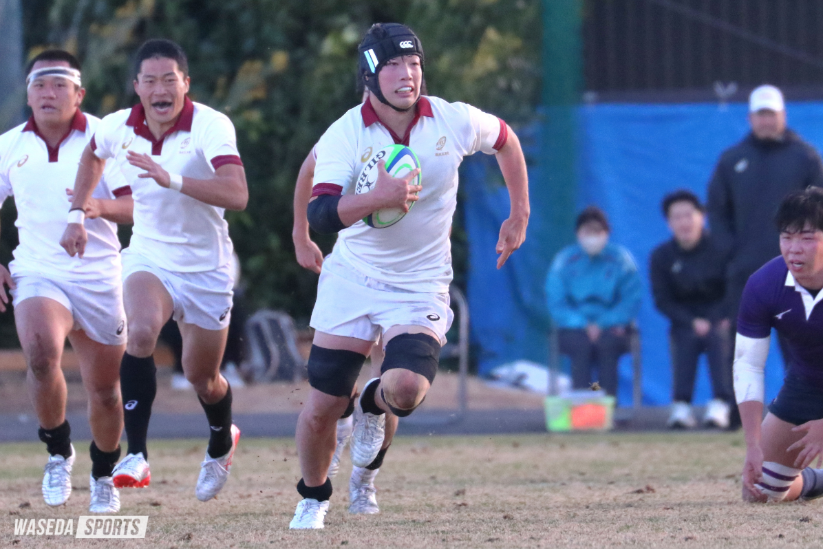 前半は仲山のキックオフで幕を開けた。強風が吹き荒れ、ゲームメイクが難しい状況の中、早大は風下に立ち、前半の行方は仲山のゲームコントロールに託された。明大のキックが風に流されてデッドラインを越えると、早大は開始早々、敵陣でのマイボールスクラムからチャンスを得る。5分、そのスクラムから仲山が一瞬のギャップを突いてビッグゲイン。最後はWTB小澤アンディ(法4=千葉・流経大柏)にボールが渡り、そのままゴールラインへ。風下という不利な条件の中でも、早大は幸先の良いスタートを切った。早大はアタックだけでなく、ディフェンスでも気持ちのこもったプレーを見せた。誰かが抜かれても、必ず誰かが止める。中でも光ったのが、LO萩原武大(スポ4=茨城・茗渓学園)の献身性だ。内側から鋭くプレッシャーをかけ、味方が窮地に陥れば即座にカバー。相手のチャンスの芽を次々と摘み取った。10分、早大にピンチが訪れる。スクラムで劣勢に立たされると自陣深くまで押し込まれ、ラインアウトモールを形成される。自陣5メートルラインまで迫られる大ピンチも、FWが一体となって一度は凌ぐ。しかし12分、明大に細かなパスを繋がれ、ついにインゴールを明け渡し、スコアは5ー7に。そして20分には連続失点を許し、5ー14と点差を広げられる。しかし、その後も得点を許しかねない場面で、萩原とCTB森田倫太朗(スポ3=兵庫・報徳)が決死のタックルを見せ、相手を仕留め切った。そして30分、上井草を揺らすビッグプレーが飛び出す。明大のキックを高栁が処理すると、迫り来るディフェンスを次々とかわしてビッグゲイン。自陣22メートルラインから一気に独走し、相手を寄せつけることなくゴールラインを駆け抜けた。その後も森田や萩原、LO米倉翔(スポ3=福岡・修猷館)の鋭いキャリー、さらには相手の陣形を見極めた仲山のキックなど、プライドを示すプレーが続く。しかし得点には結びつかず、10ー14でハーフタイムを迎えた。