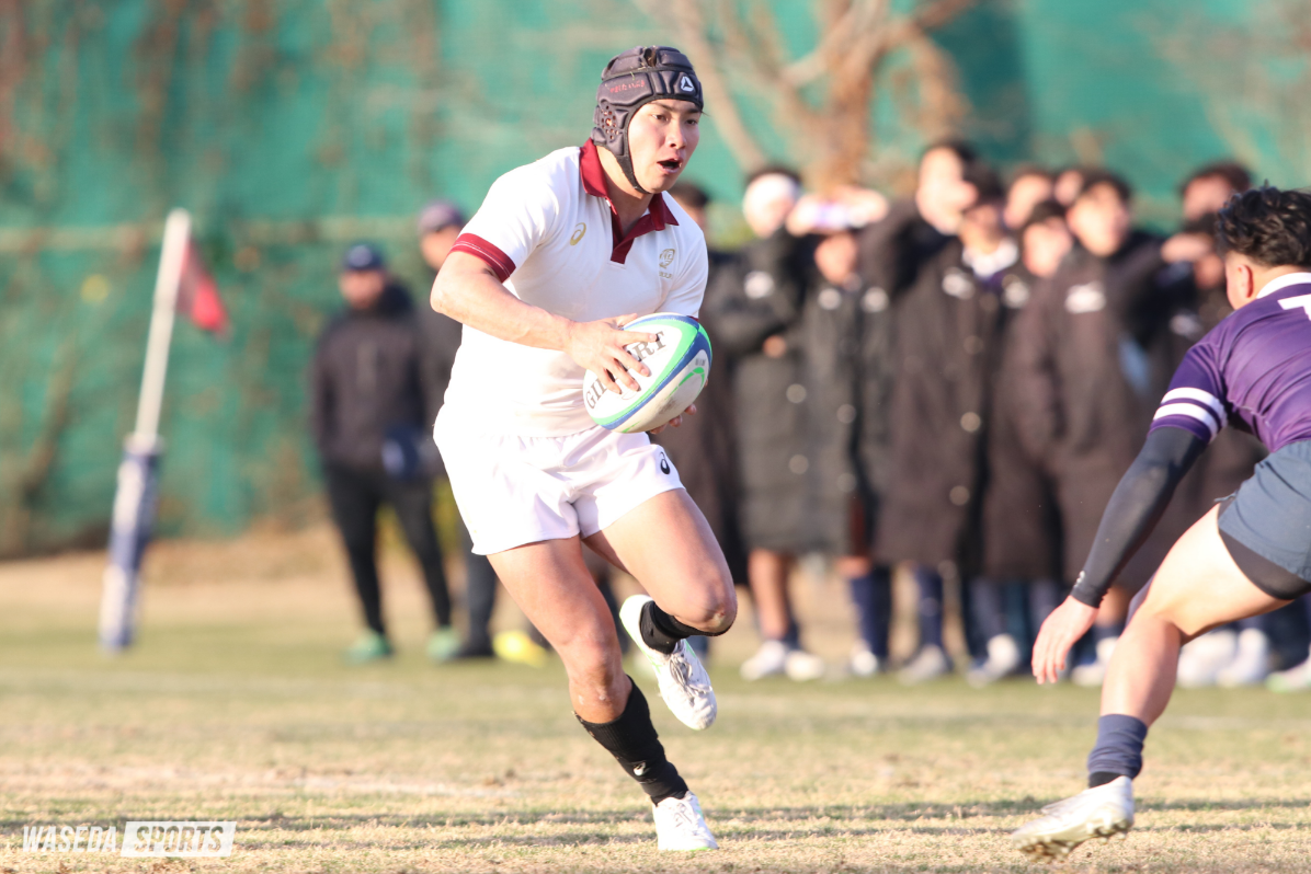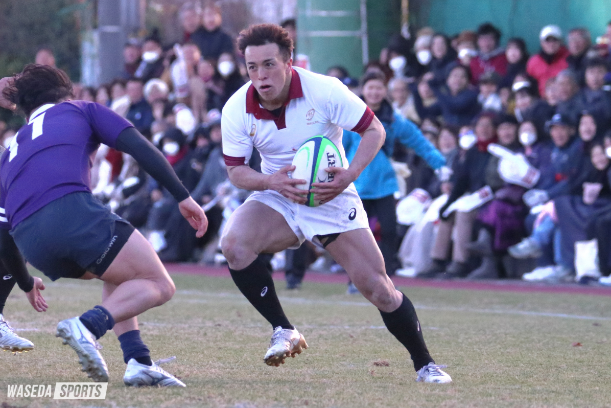 伝統と誇り。稲穂を胸に過ごす時間が長くなるほど、その想いは確かな重みを帯びていく。4年間、苦楽を共にしてきた仲間とともに早大・上井草グラウンドで明大を迎えうつ。その歩みのすべてを証明する場所で、宿敵との4年早明戦が幕を開けた。試合開始早々から流れをつかんだ早大は、その勢いのまま先制に成功する。攻守にわたってプライドを示したが、続けざまに明大に得点を許し、試合は一転して追う展開に。それでもSO仲山倫平(法4=ニュージーランド・ウェリントン・カレッジ)のゲームメイクが光り、FB高栁壮史(創理4=東京・早大学院)の豪快なランから1本を返す。10ー14で前半を折り返した。迎えた後半、早大はラインアウトモールを起点にBKへと展開し得点。この日初めてリードを奪った。しかし、再び明大に流れを渡すと、立て続けに失点を許してしまい、4年間の積み重ねを背負いながら臨んだ4年早明戦は17ー26でノーサイドとなった。