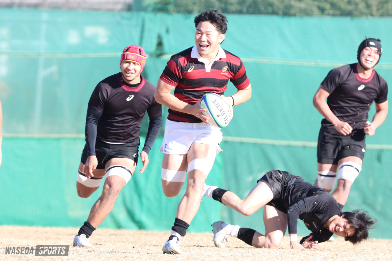 まず行われたのは、4年生チームと下級生チームの対戦。勝敗以上に楽しむことが前面に出た内容となり、選手同士の声掛けや自由な発想のプレーが随所に見られた。勝矢紘史(スポ4=長崎北陽台)がトライを決めると、コンバージョンキックにも挑戦。これを見事に成功させ、グラウンドを大いに沸かせた。さらに、松中羽菜(スポ4=東京・大妻多摩)を筆頭に、これまでチームを支えてきたマネージャーやトレーナーがディフェンスをかわし、ボールを抱え駆け抜ける場面もあった。試合終盤には4年生全員でモールからトライを決めるなど、4年生一人一人が上井草グラウンドでの最後のひと時を楽しんだ。