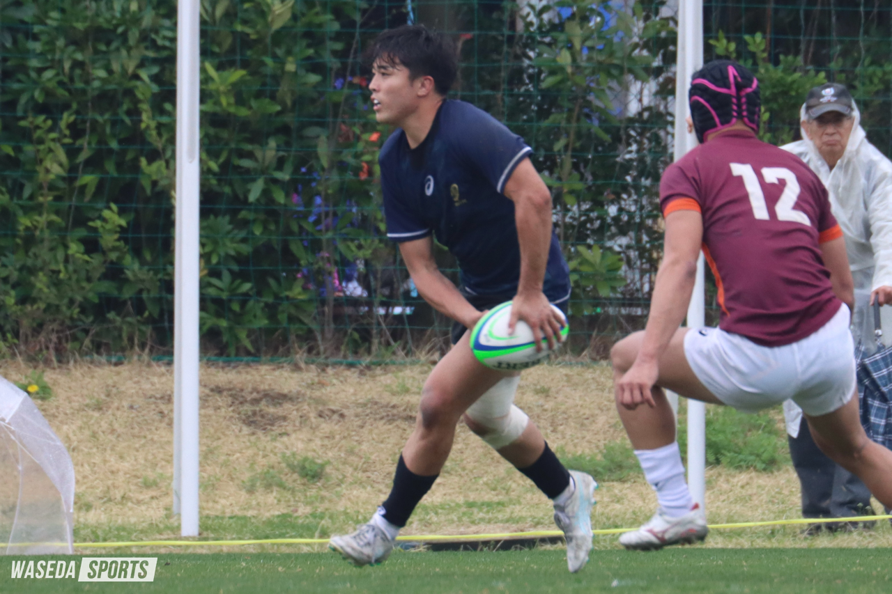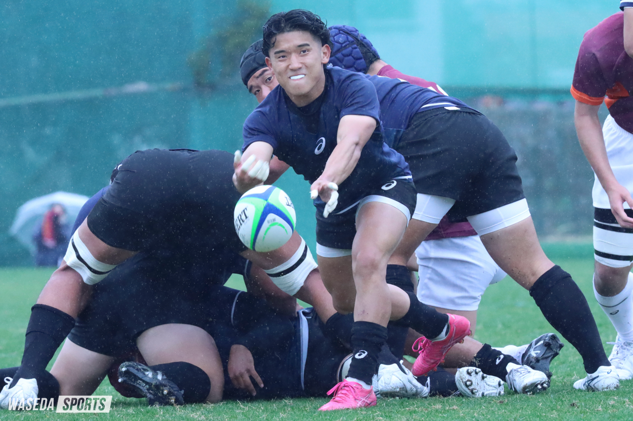 後半に入っても2年生の勢いは止まらない。ラックで新入生ボールをターンオーバーすると、SH川端隆⾺(スポ2=⼤阪桐蔭)がディフェンスの裏へグラバーキック。そこに走り込んだWTB肥後直希(スポ2=早稲⽥佐賀)がそのまま右隅にトライを決めた。さらに後半から出場のSO古瀬莊(スポ2=静岡聖光学院)が攻撃のリズムを作り、テンポが一気に加速。フォワードとバックスが見事に連携し、7分、11分、18分と立て続けに追加点を奪う。大きく点差を広げられた新入生だが、最後まで諦めない姿勢を見せる。CTB髙野恵次郎(スポ1=福岡・⼩倉)からCTB⽮島快修(政経1=埼⽟・早⼤本庄)へのパスが通って大きくゲインすると、素早く左へ展開。大外での突破を図ったものの、惜しくもラストパスが繋がらずタッチラインを割ってしまう。 終盤、2年生は自陣からの展開力も見せつける。25分、CTB⿑藤慧⼠郎(社2=宮城・仙台第三)が強烈なハンドオフで相手をはねのけてNO・8國⽥泰裕(法2=東京・早⼤学院) へ繋ぐと、そのまま敵陣深くまでボールを運ぶ。最後は大外から走り込んでいたWTB若林海翔(社2=東海⼤⼤阪仰星)へとパスが渡り、左隅へ飛び込んだ。最終スコアは0-62。2年生が圧倒する形で新人試合は幕を閉じた。