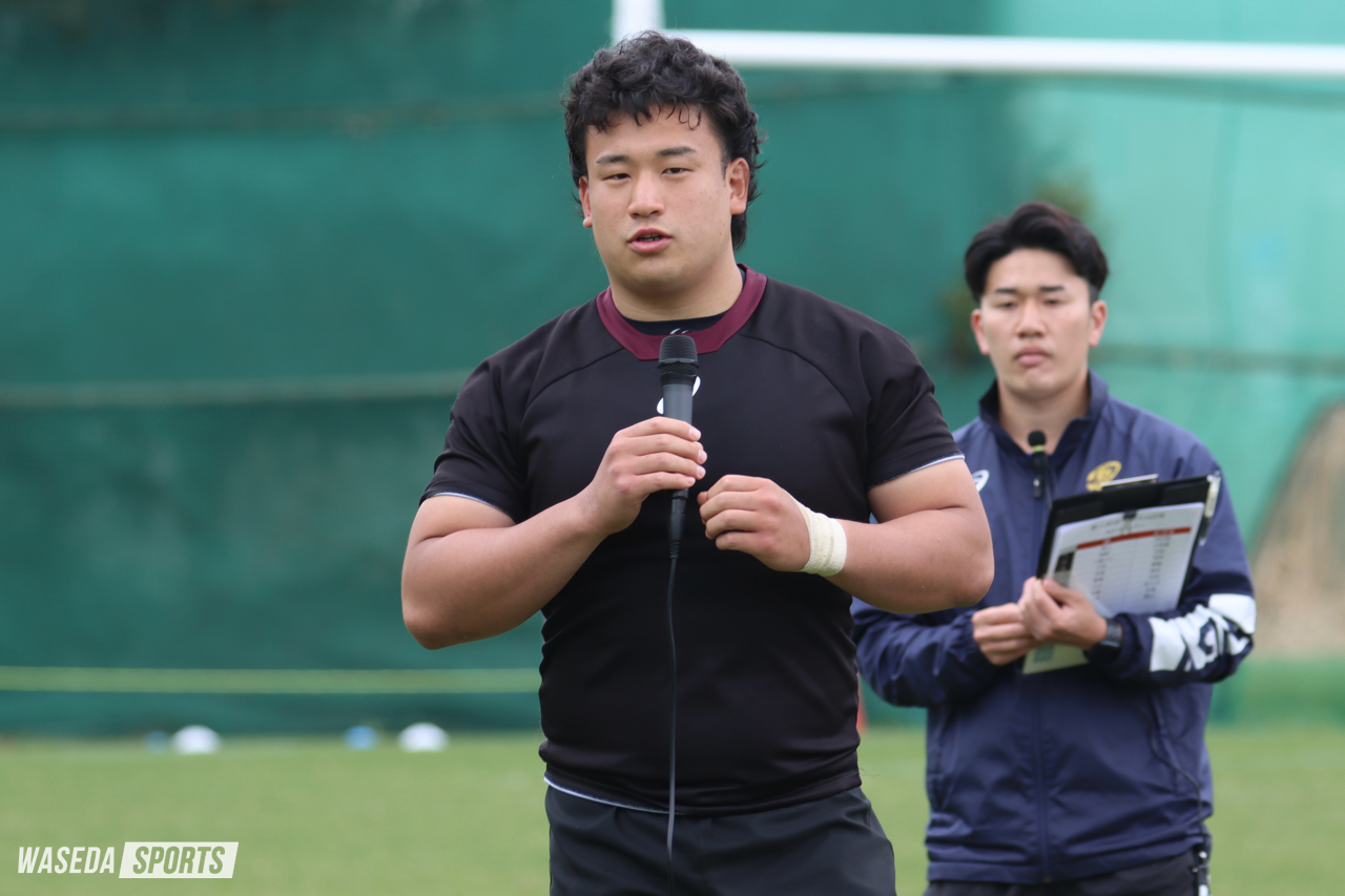 新入生代表の東佑太(スポ1=東海⼤⼤阪仰星)は、「大学日本一に貢献するため、伝統ある早大ラグビー部の一員である自覚を持ち、4年間精進していく」と意気込みを語った。続いて清⽔健伸主将(スポ4=東京・国学院久我⼭)が登壇し、「優勝までのあと一歩を埋めるためにどうすればいいか考えたが、その答えは分からない。答えを知るには優勝するしかない」と語り、着実に一歩ずつ積み重ねていくことを誓った。最後は部歌『北風』を全員で斉唱し、入部式は幕を閉じた。