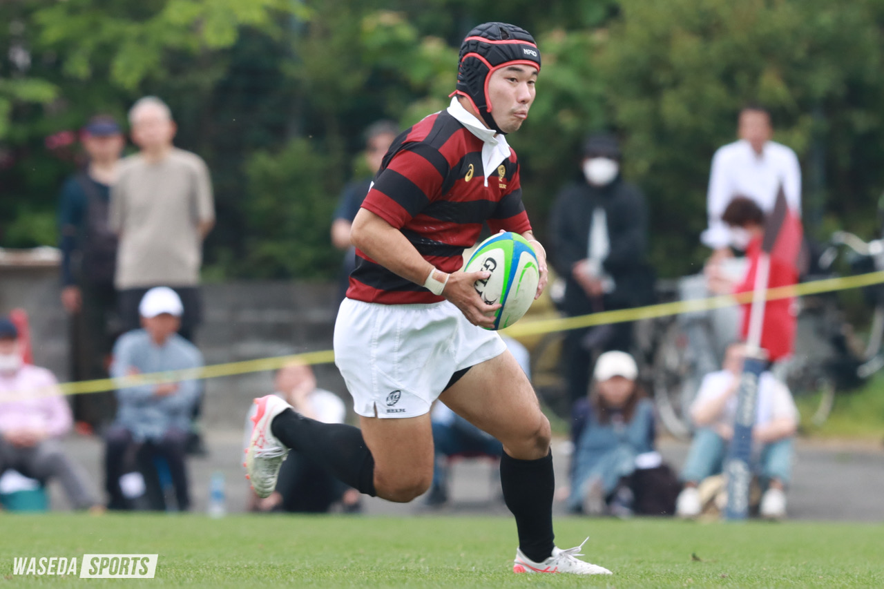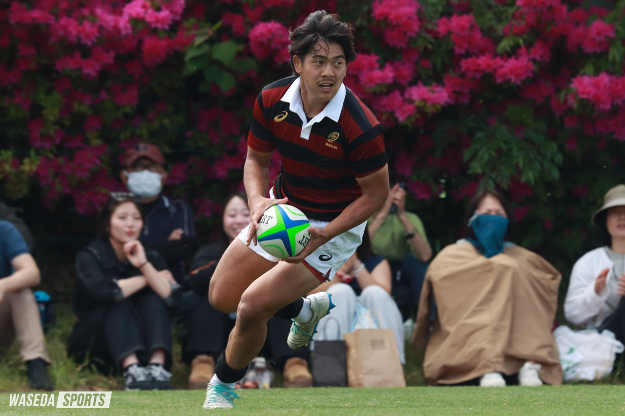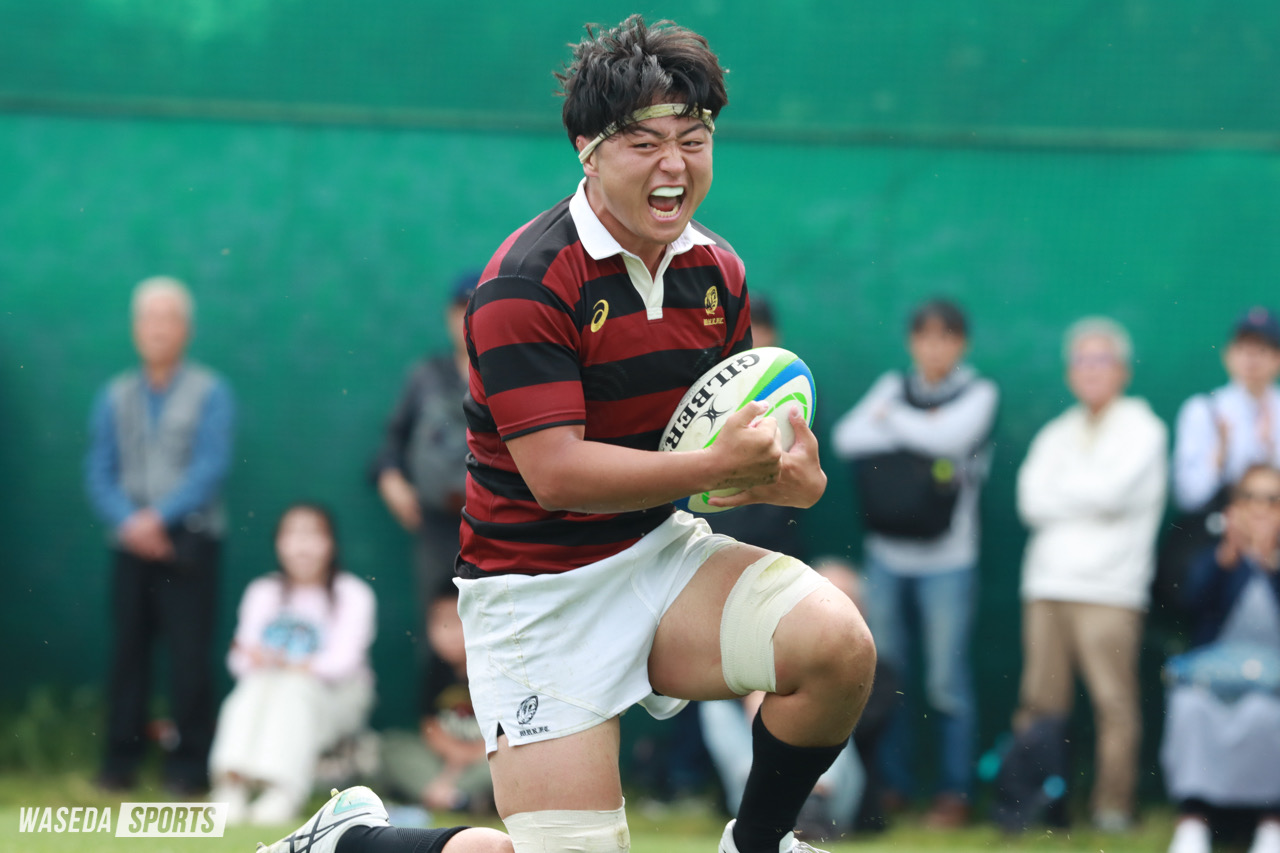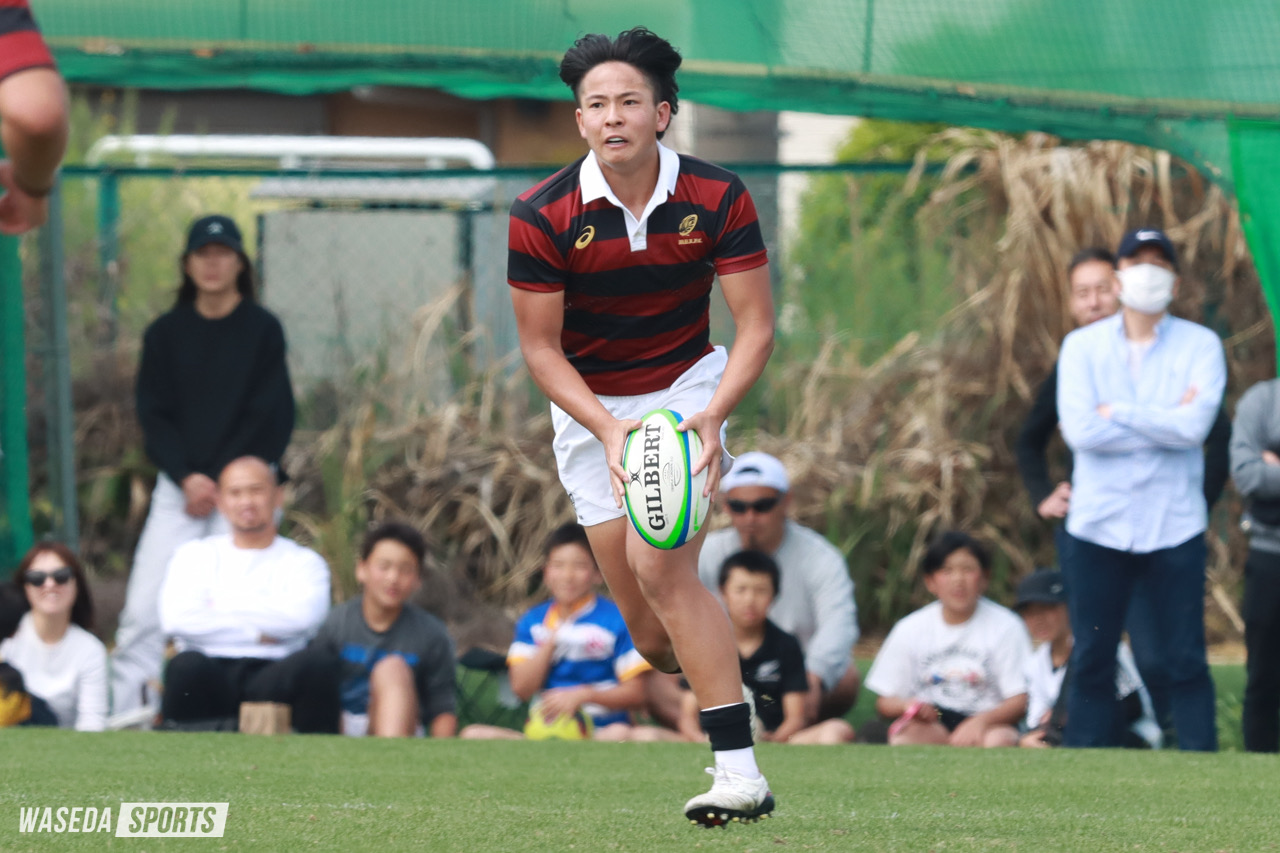 早大のキックオフから始まった今試合。すかさずCTB島⽥隼成(スポ3=福岡・修猷館)がハイボールの競り合いに打ち勝つと、早大はすぐにチャンスをつかみ取る。CTB名取凛之輔(スポ2=⼤阪桐蔭)が鋭いヒットから起点を作ると、早大は大外まで展開。開始早々から自慢のアタッキングラグビーを披露した。すると、筑波大はたまらずペナルティー。服部のキックで敵陣ゴール前まで攻め込む。2分、その後は筑波大のペナルティーからSH⼤賀雅仁(スポ4=神奈川・桐蔭学園)が速攻を仕掛けると、NO・8松沼寛治(スポ4=東海⼤⼤阪仰星)が腕を伸ばしてゴールラインにボールを叩き込んだ。右隅からの難しいコンバージョンキックを服部が沈め7ー0。その後は早大が昨年に引き続き持ち前のスクラムでみせる。筑波大ボールスクラムでペナルティーを獲得し、敵陣へ。しかし早大は8分、自らのハイパントから筑波大にキックカウンターを仕掛けられる。細かなパスを繋げられて早大はトライラインを許してしまった。7ー7と試合は振り出しに戻る。直後、再び島田がキックオフをキャッチ。10分、WTB⼭下恵⼠朗(スポ3=早稲⽥佐賀)が一度はディフェンスに捕まりながらも、足をかき続けてビッグゲイン。筑波大ディフェンスを振り切り、トライライン中央に飛び込んだ。服部のキックも決まり14ー7。続く16分、名取がビッグゲインを見せると、FL久我真之介(⽂構3=東京・早実)がトライ。21分、筑波大の連続攻撃を今試合は『赤黒』デビューとなったLO宮川侑⼤(スポ2=富⼭・砺波)がスティールで仕留め切る。仲間から褒めの言葉が飛び交った。服部のキックで敵陣ゴール前へ。早大はモールでペナルティーを獲得する。そして早大はスクラムを選択。部員席から『RISE OVER』コールが響いた。FWが起点を作ると、服部の素早く長いパスから島田が筑波大ディフェンスをずらしてゴールラインにねじ込み26ー7。今試合ではトライだけではなく、攻守にわたり島田の活躍が目立った。ディフェンスではスティールを成功させ、ハイボールキャッチでは存在感を示した。37分、FL野島信太郎(教4=東海⼤⼤阪仰星)の鋭いヒットから起点を作ると、島田のショートパスから宮川がゲイン。そのままオフロードパスを受け取った服部がフリーのままトライラインを駆け抜けた。31ー7で試合を折り返した。