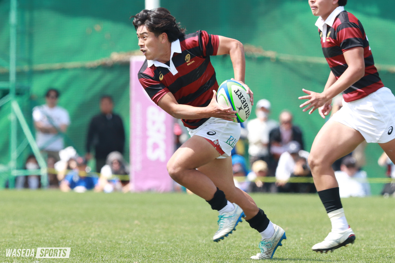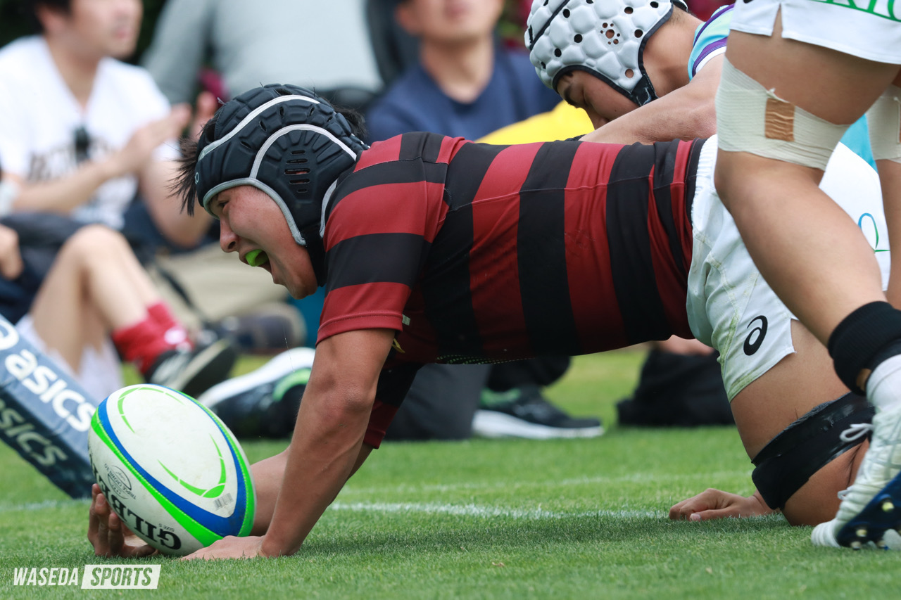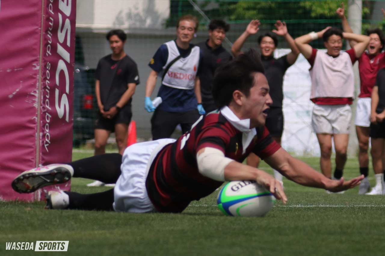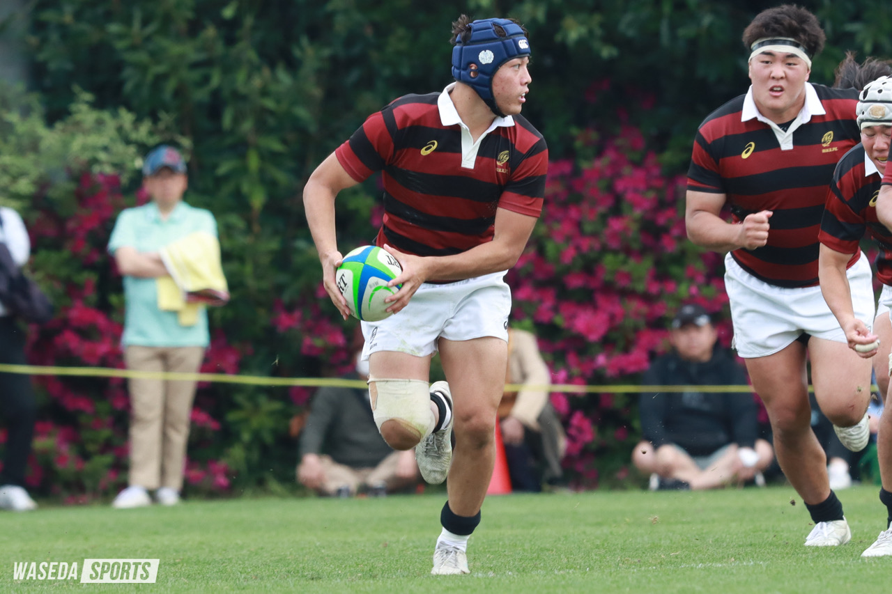 早大のキックオフから始まった今試合。すかさずCTB島⽥隼成(スポ3=福岡・修猷館)がハイボールの競り合いに打ち勝つと、早大はすぐにチャンスをつかみ取る。CTB名取凛之輔(スポ2=⼤阪桐蔭)が鋭いヒットから起点を作ると、早大は大外まで展開。開始早々から自慢のアタッキングラグビーを披露した。すると、筑波大はたまらずペナルティー。服部のキックで敵陣ゴール前まで攻め込む。2分、その後は筑波大のペナルティーからSH⼤賀雅仁(スポ4=神奈川・桐蔭学園)が速攻を仕掛けると、NO・8松沼寛治(スポ4=東海⼤⼤阪仰星)が腕を伸ばしてゴールラインにボールを叩き込んだ。右隅からの難しいコンバージョンキックを服部が沈め7ー0。その後は早大が昨年に引き続き持ち前のスクラムでみせる。筑波大ボールスクラムでペナルティーを獲得し、敵陣へ。しかし早大は8分、自らのハイパントから筑波大にキックカウンターを仕掛けられる。細かなパスを繋げられて早大はトライラインを許してしまった。7ー7と試合は振り出しに戻る。直後、再び島田がキックオフをキャッチ。10分、WTB⼭下恵⼠朗(スポ3=早稲⽥佐賀)が一度はディフェンスに捕まりながらも、足をかき続けてビッグゲイン。筑波大ディフェンスを振り切り、トライライン中央に飛び込んだ。服部のキックも決まり14ー7。続く16分、名取がビッグゲインを見せると、FL久我真之介(⽂構3=東京・早実)がトライ。21分、筑波大の連続攻撃を今試合は『赤黒』デビューとなったLO宮川侑⼤(スポ2=富⼭・砺波)がスティールで仕留め切る。仲間から褒めの言葉が飛び交った。服部のキックで敵陣ゴール前へ。早大はモールでペナルティーを獲得する。そして早大はスクラムを選択。部員席から『RISE OVER』コールが響いた。FWが起点を作ると、服部の素早く長いパスから島田が筑波大ディフェンスをずらしてゴールラインにねじ込み26ー7。今試合ではトライだけではなく、攻守にわたり島田の活躍が目立った。ディフェンスではスティールを成功させ、ハイボールキャッチでは存在感を示した。37分、FL野島信太郎(教4=東海⼤⼤阪仰星)の鋭いヒットから起点を作ると、島田のショートパスから宮川がゲイン。そのままオフロードパスを受け取った服部がフリーのままトライラインを駆け抜けた。31ー7で試合を折り返した。