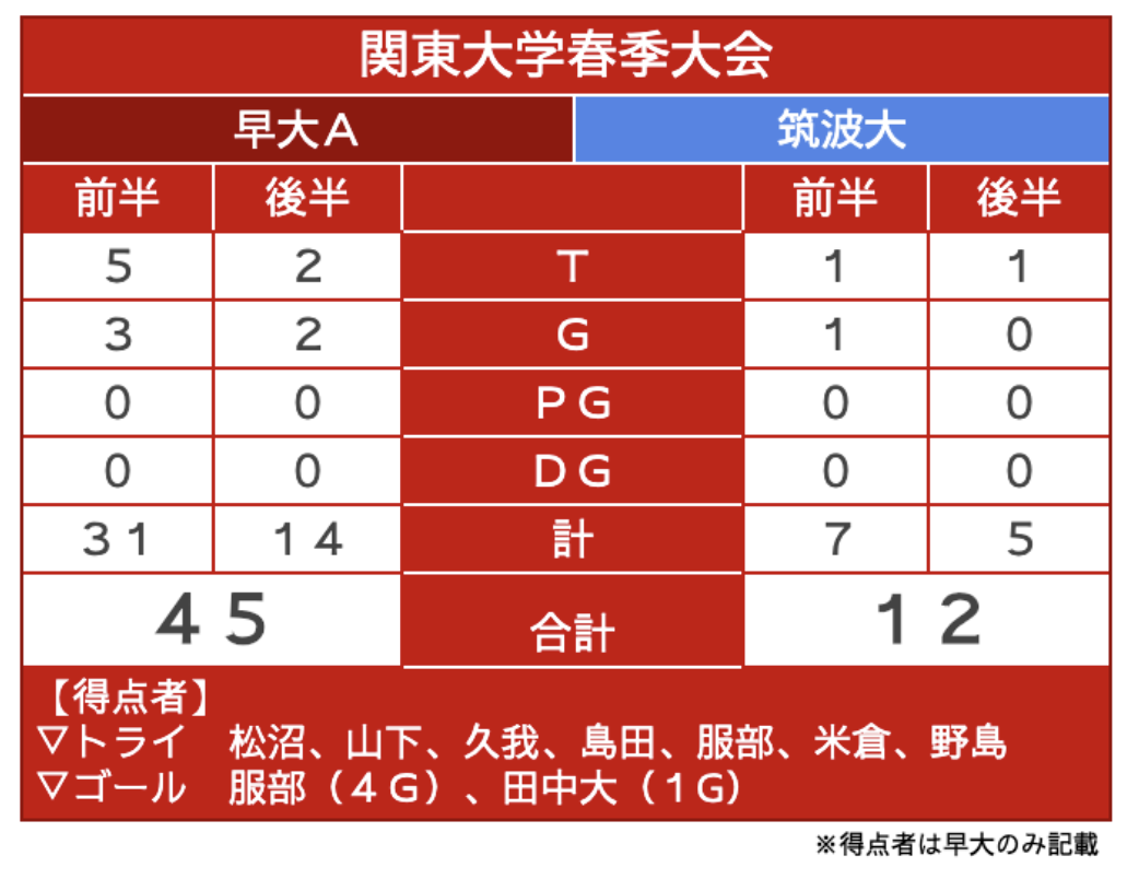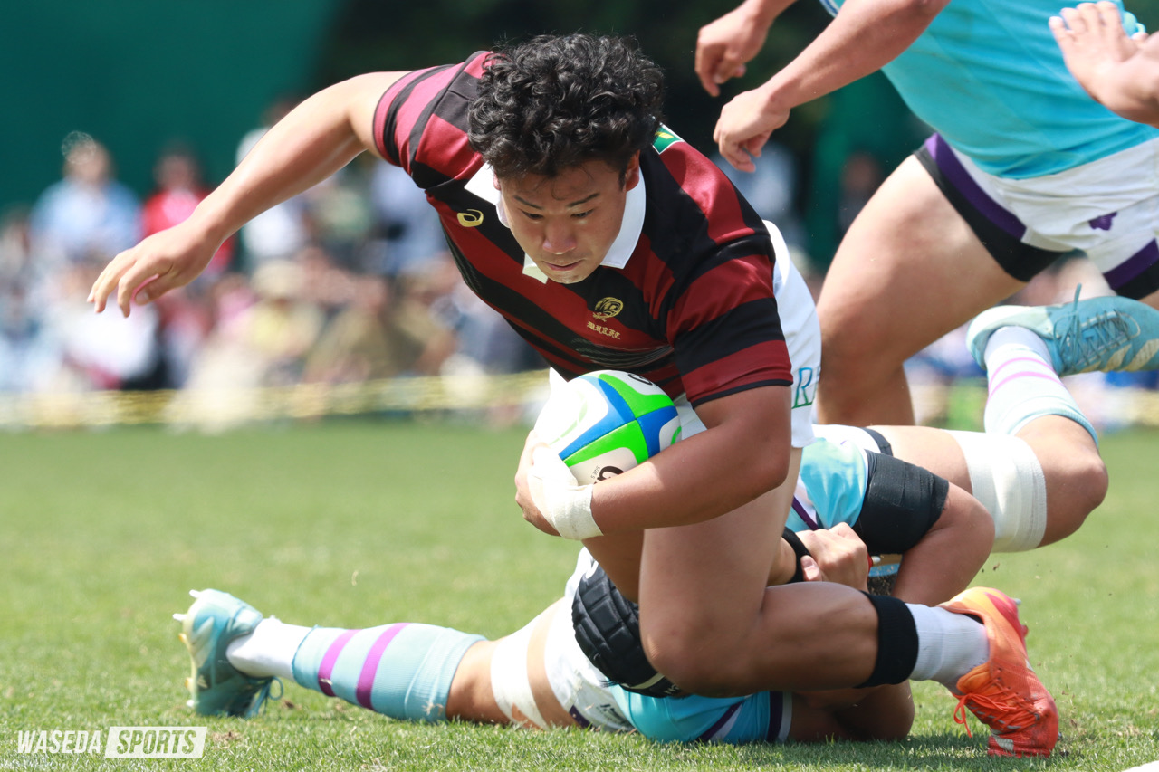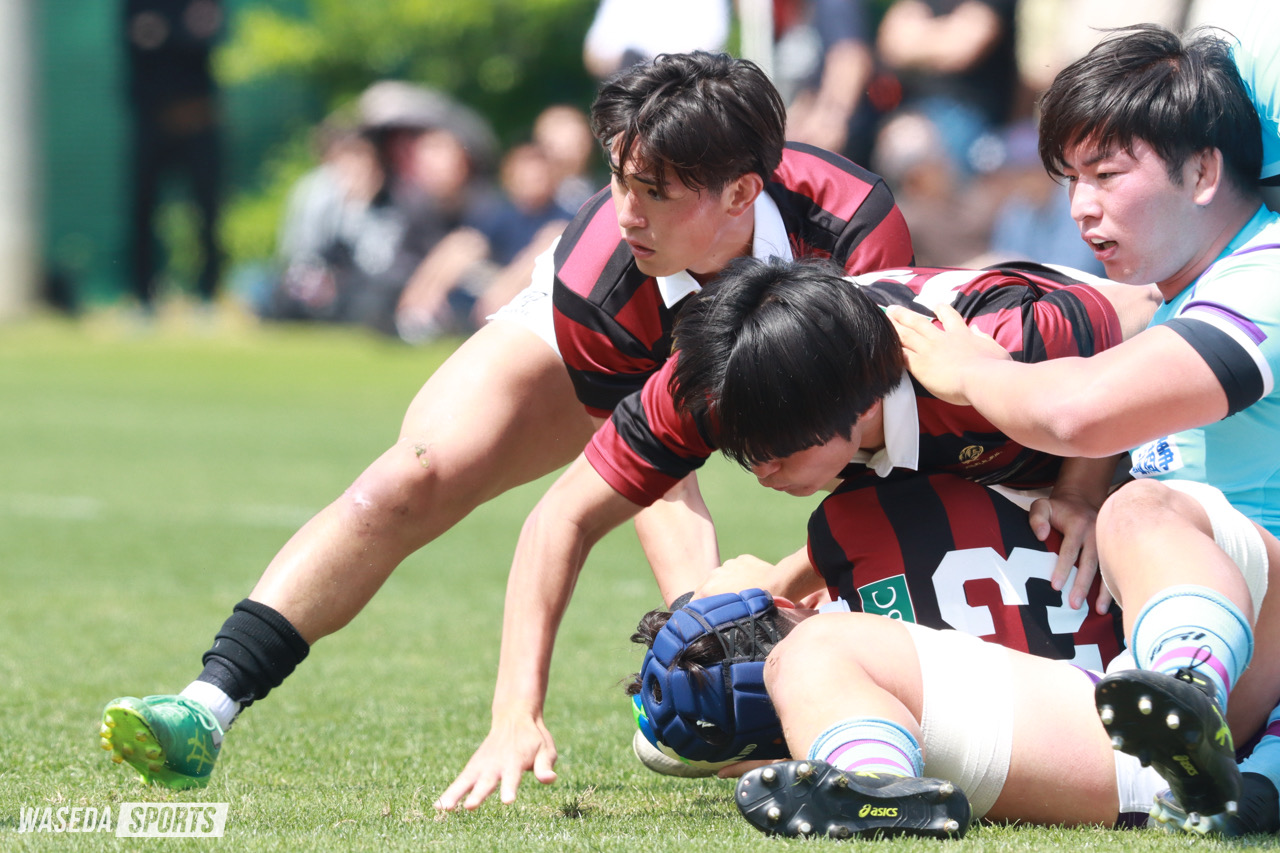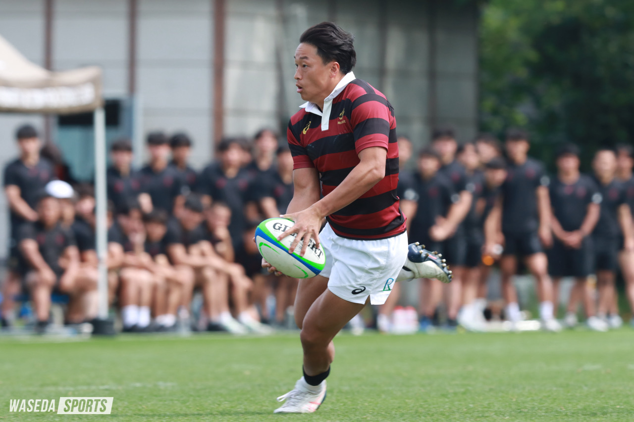 早大のキックオフから始まった今試合。すかさずCTB島⽥隼成(スポ3=福岡・修猷館)がハイボールの競り合いに打ち勝つと、早大はすぐにチャンスをつかみ取る。CTB名取凛之輔(スポ2=⼤阪桐蔭)が鋭いヒットから起点を作ると、早大は大外まで展開。開始早々から自慢のアタッキングラグビーを披露した。すると、筑波大はたまらずペナルティー。服部のキックで敵陣ゴール前まで攻め込む。2分、その後は筑波大のペナルティーからSH⼤賀雅仁(スポ4=神奈川・桐蔭学園)が速攻を仕掛けると、NO・8松沼寛治(スポ4=東海⼤⼤阪仰星)が腕を伸ばしてゴールラインにボールを叩き込んだ。右隅からの難しいコンバージョンキックを服部が沈め7ー0。その後は早大が昨年に引き続き持ち前のスクラムでみせる。筑波大ボールスクラムでペナルティーを獲得し、敵陣へ。しかし早大は8分、自らのハイパントから筑波大にキックカウンターを仕掛けられる。細かなパスを繋げられて早大はトライラインを許してしまった。7ー7と試合は振り出しに戻る。直後、再び島田がキックオフをキャッチ。10分、WTB⼭下恵⼠朗(スポ3=早稲⽥佐賀)が一度はディフェンスに捕まりながらも、足をかき続けてビッグゲイン。筑波大ディフェンスを振り切り、トライライン中央に飛び込んだ。服部のキックも決まり14ー7。続く16分、名取がビッグゲインを見せると、FL久我真之介(⽂構3=東京・早実)がトライ。21分、筑波大の連続攻撃を今試合は『赤黒』デビューとなったLO宮川侑⼤(スポ2=富⼭・砺波)がスティールで仕留め切る。仲間から褒めの言葉が飛び交った。服部のキックで敵陣ゴール前へ。早大はモールでペナルティーを獲得する。そして早大はスクラムを選択。部員席から『RISE OVER』コールが響いた。FWが起点を作ると、服部の素早く長いパスから島田が筑波大ディフェンスをずらしてゴールラインにねじ込み26ー7。今試合ではトライだけではなく、攻守にわたり島田の活躍が目立った。ディフェンスではスティールを成功させ、ハイボールキャッチでは存在感を示した。37分、FL野島信太郎(教4=東海⼤⼤阪仰星)の鋭いヒットから起点を作ると、島田のショートパスから宮川がゲイン。そのままオフロードパスを受け取った服部がフリーのままトライラインを駆け抜けた。31ー7で試合を折り返した。