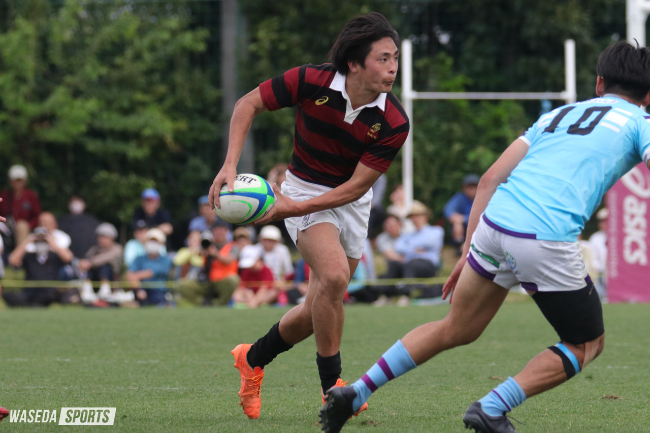 迎えたセカンドハーフ。司令塔の服部を起点にテンポに緩急をつけながらアタックの流れを作り出した。12分、筑波大のキックをカウンターから服部がクイックでボールを継続する。FB植⽊太⼀(⼈3=神奈川・関東学院六浦)がカウンターを仕掛けて島田がブレイク。LO⽶倉翔(スポ4=福岡・修猷館)がゲインして中央にグラウンディング。ゴールも決まり38ー7と点差を広げた。そして今試合では野島も存在感を光らせた。前半の早い時間から試合に出場し、声出しからチームを励ますと、高いワークレートから疲労が溜まった後半でもすべてのブレイクダウンで顔を出す運動量をみせた。そんな野島が26分、キックオフからそのままゴールラインを駆け抜け45ー12と点差を広げた。その後もリードを保った早大が45ー12で試合を折り返した。