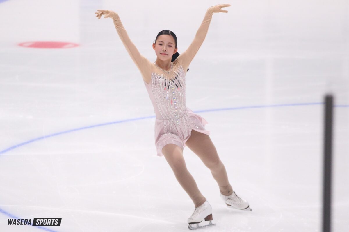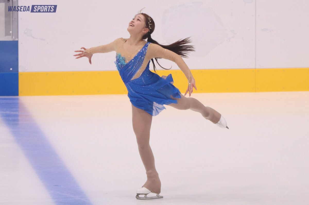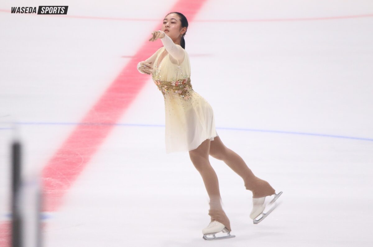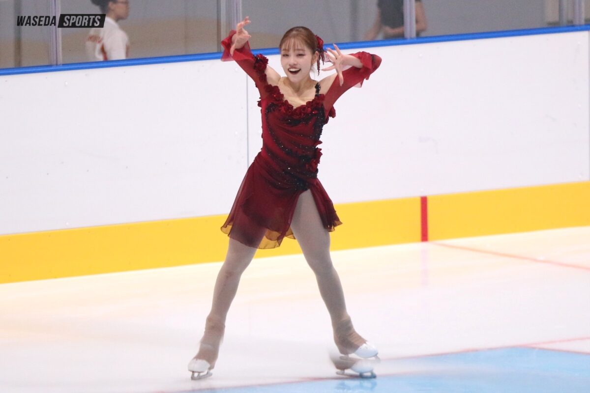 早大勢で最初に登場したのは、2年生の穂積乃愛(人通2=東京・駒場学園)。鮮やかなワインレッドの衣装でリンクに上がると、『24のカプリース』に合わせて、華やかで優雅な演技を見せた。冒頭から細かく軽やかなステップを披露するが、3回転ループで転倒し、減点となってしまう。その後は、回転が抜けるミスも出たが最後まで笑顔で滑りきった。怪我を抱えながらも3回転に挑んだがミスが続き、「頭が真っ白のまま終わってしまった」というが、得点は37.23点で23位となり、無事翌日のフリーに進んだ。