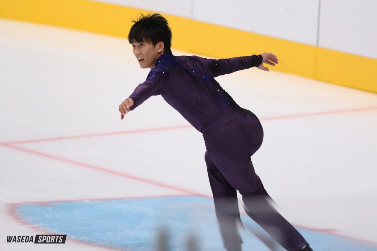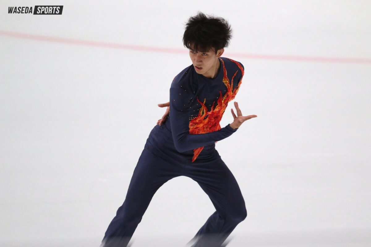 男子シングルの競技には山田琉伸(人通3=埼玉栄)が出場。怪我により、大会1週間前まで氷から完全に離れていたと言い、痛みを抱えながらの演技となった。3回転フリップは両足着氷、コンビネーションジャンプは転倒と前半から着氷が乱れてしまう。ステップでは長い手足を大きく動かしメリハリの効いた滑りを見せるが、スピンで体勢を崩すなどジャンプ以外でもミスが出た。得点は45・08点で14位。「想定より酷い内容だった」と納得のいく演技とはならなかったが、不安の中、「四季」より『夏』をしっかりと最後まで滑りきった。