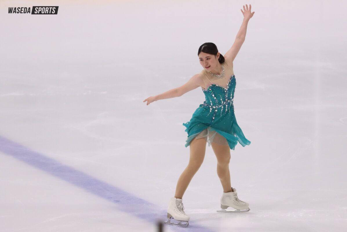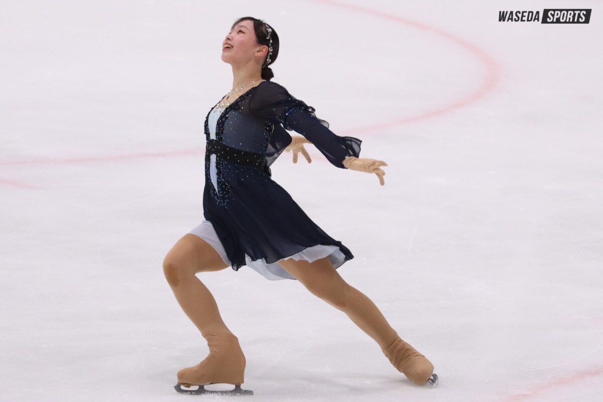 今大会、早大勢最後の滑走者は穂積乃愛(人通2=東京・駒場学園)。体調を崩して前日まで寝込んでいたといい、苦しいコンディションの中で試合を迎えた。『the legend of 1900』がかかると天を見上げ両手を差し伸べるようにして滑り出し、一つひとつの音を拾い上げるように丁寧に演じていく。ジャンプの構成は2回転中心に落としたものの、大きなミスなく滑り切った。「ちょっとバテたな」と苦笑いを浮かべたが、78.16点で12位となり、無事全日本インカレ進出を決めた。