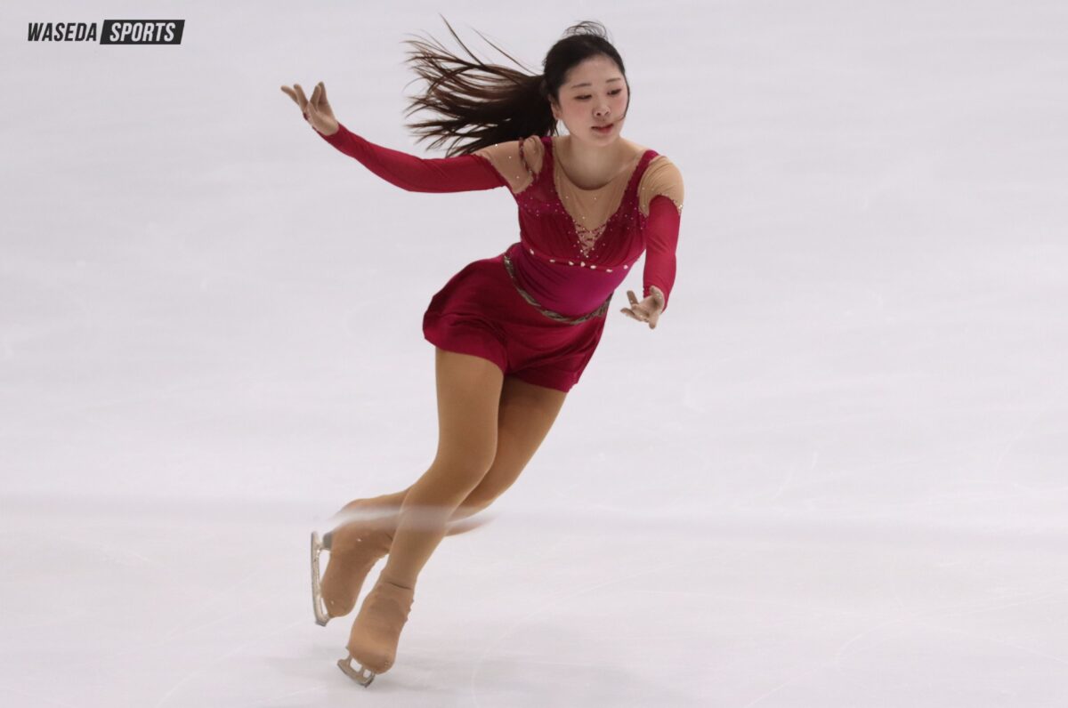 続いて登場したのは吉本玲(国教3=兵庫・芦屋国際中教校)。冒頭から2本のジャンプは、両足着氷、転倒と大きく乱れる。難しい出だしとなったが、その後なんとか立て直し、全てのジャンプを着氷させた。得意のスピン、ステップはさすがの美しさで、コレオでは1点の加点を得た。結果は63.76点で26位。苦しい結果となった前回大会(東京選手権)からは改善できたとしたが、「(練習では調子が上がっていたのに)力んでしまった」と、試合本番で力を出す難しさも感じた。