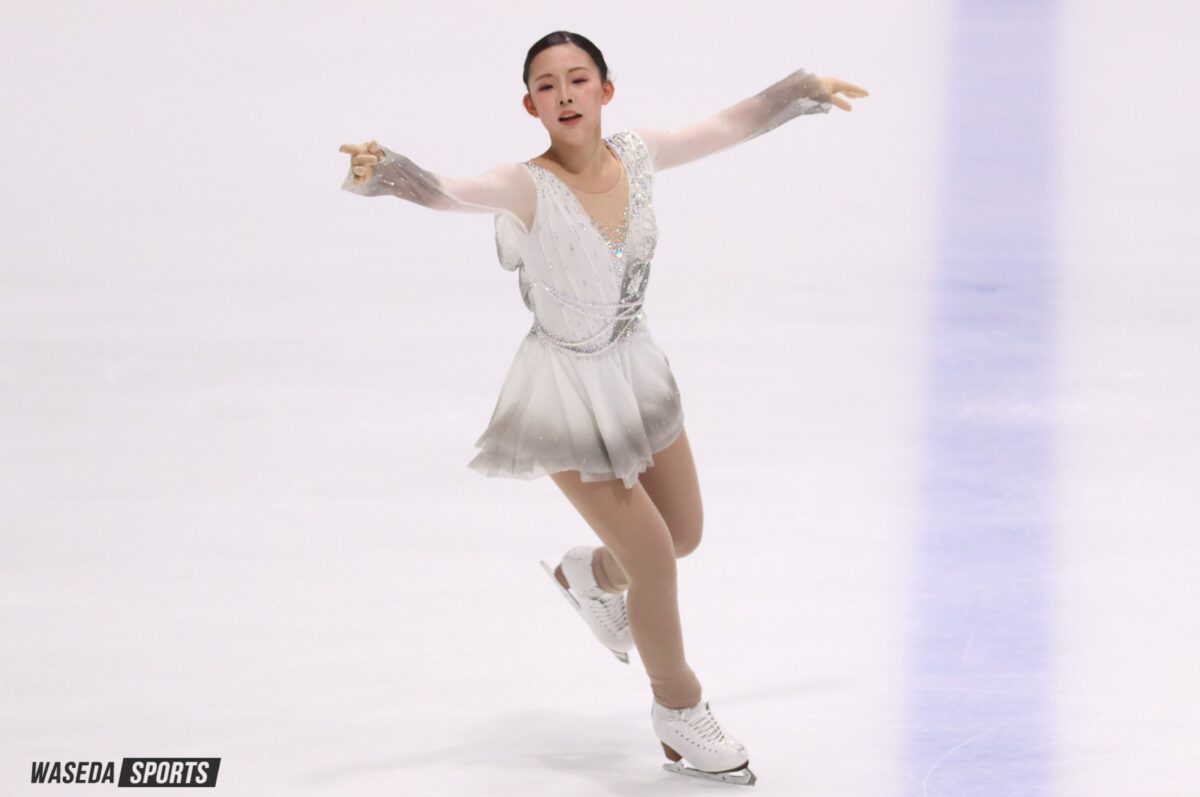 3人目は同じく1年生の宮本明依(ス1=富山中)。1本目、2本目と続けてジャンプを成功させると笑顔を見せた。ステップでも大きく身体を使い、のびのびと演じていく。スピンステップでは取りこぼしもあったものの、『タイタニック』のロマンチックな曲調を柔らかく演じた。得点は35・89点で15位。小さなミスの積み重ねで得点が伸び悩み、「スケーティング力を磨いて基礎点が伸びるようにしたい」と反省も見せたが、笑顔で演技を終えた。