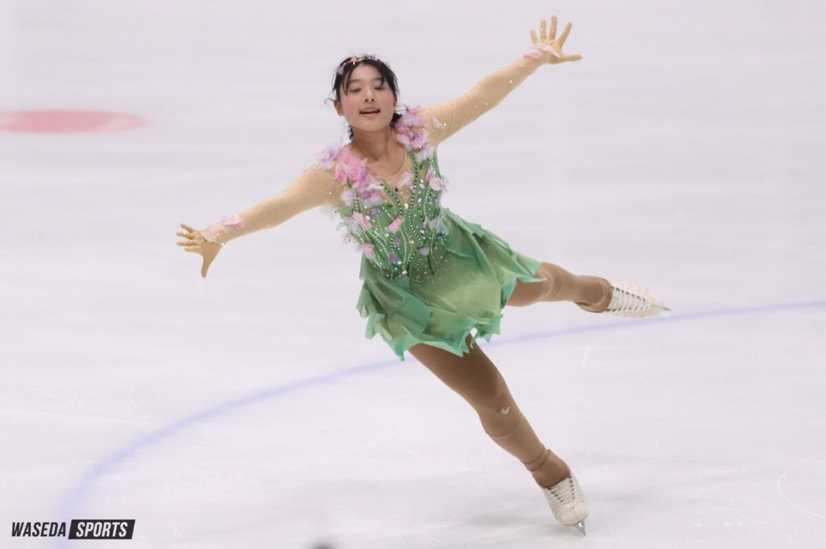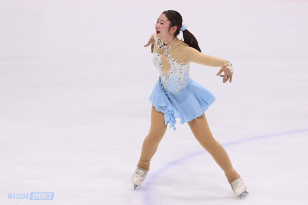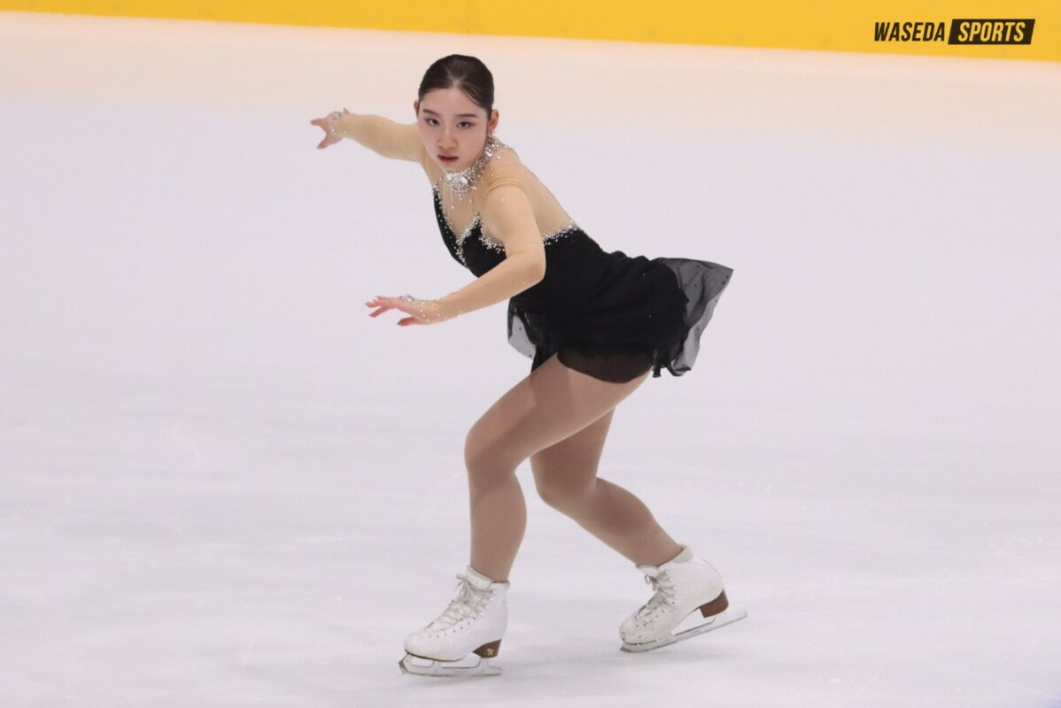 大会2日目には6級女子の競技が行われた。1年生の金田桜季(商1=早稲田佐賀)は、リンクを広く使いながら、『ロミオとジュリエット』の壮大な世界観を表現。冒頭のコンビネーションジャンプを着氷すると、その後のジャンプもすべて成功。58.28点で15位につけた。「ジャンプに大きなミスがなく、満足のいく出来だった」と安堵の表情を見せた一方、スピンでレベルを取りこぼしたことを受け、「スピンやスケーティングの強化」を今後の課題として挙げた。