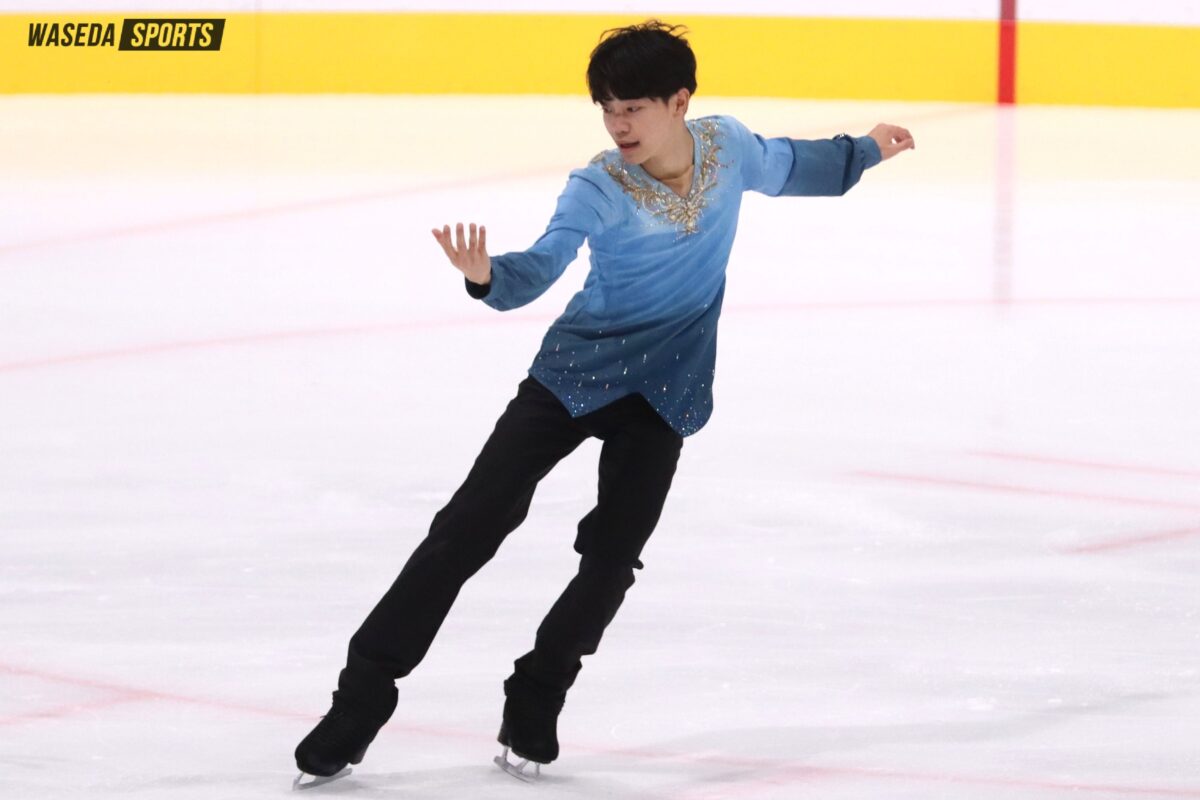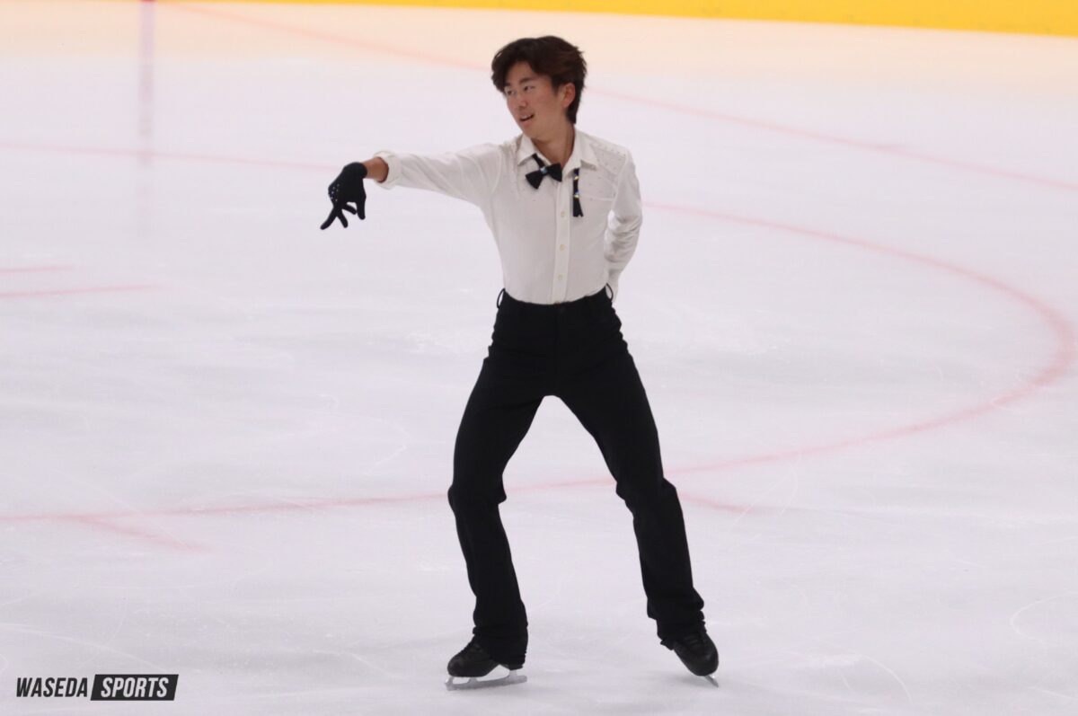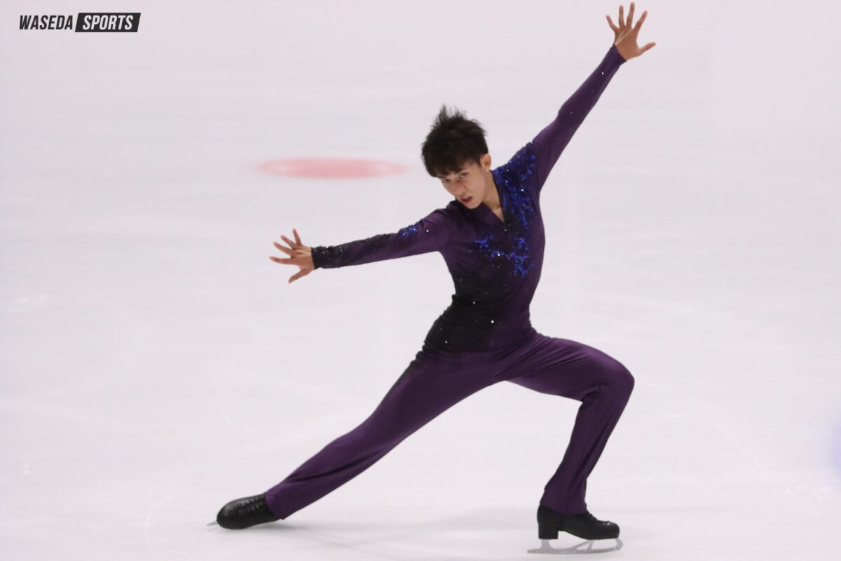3番滑走で登場した山田琉伸(人通3=埼玉栄)は、『ピアノコンツェルト2番1楽章』を演じる。冒頭の3回転トーループは成功したものの、その後のジャンプは回転の抜けや着氷の乱れが目立った。それでもスピンではレベル4を獲得するなど進化も見られ、本調子ではない中最善を尽くした。今季は怪我の影響が長引き、休んでは試合に出るということが続く。大会直前の調整はうまくいっていたが、「そもそも(調整したところで発揮する)100パーセントが(自分の中に)なかった」と分析。それでも98.86点で8位となり無事全日本インカレに進んだ。