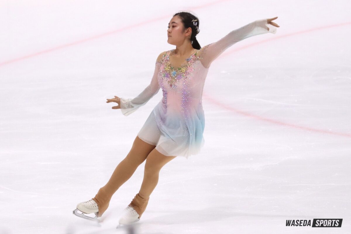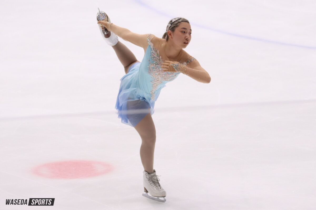 2人目は1年生の梅本優花(教1=東京・早実)。水色の衣装をまとい、少し緊張した面持ちでリンクに上がった。重要になるのは今大会に向け念入りに練習してきたという2回転サルコウ。1本目は着氷させるも、2本目で転倒してしまった。その後も細かいミスが出たものの、指先まで丁寧な所作で、しっとりと『God Bless You』の優しい曲調を演じた。得点は35・95点で14位。「1つミスをしても次にミスが響かないようにしないと」と、演技後は肩を落とした。