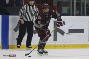 第2ピリオドに入っても勢いが止まることなく、早大が一方的に攻撃を仕掛ける時間帯が続いた。23分にFW樋口能乙(スポ2=青森・八戸)がネットを捉えると、26分にはFW高見澤英翔(スポ2=埼玉栄)、29分にはFW清水朝陽(社4=北海道・武修館)が追加点を挙げ、一気に8点差まで広げた。第2ピリオド中盤、果敢にアタッキングゾーンへパックを運びシュートを放つも、ゴールを捉えられずなかなか得点できない時間が続いた。しかし37分にはFW笹沼がゴール左前のフェイスオフスポット付近から鋭くゴールを狙い、それが決まって9-0で最終ピリオドを迎えた。
