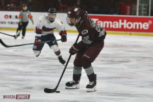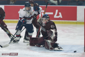 第1ピリオドでは、比較的早大がパックを保持しながらも、相手の攻撃に油断できない展開となった。7分、FW清水朝陽(社4=北海道・武修館)のアシストによりFW高見澤が先制点を入れ、流れを引き寄せる。
