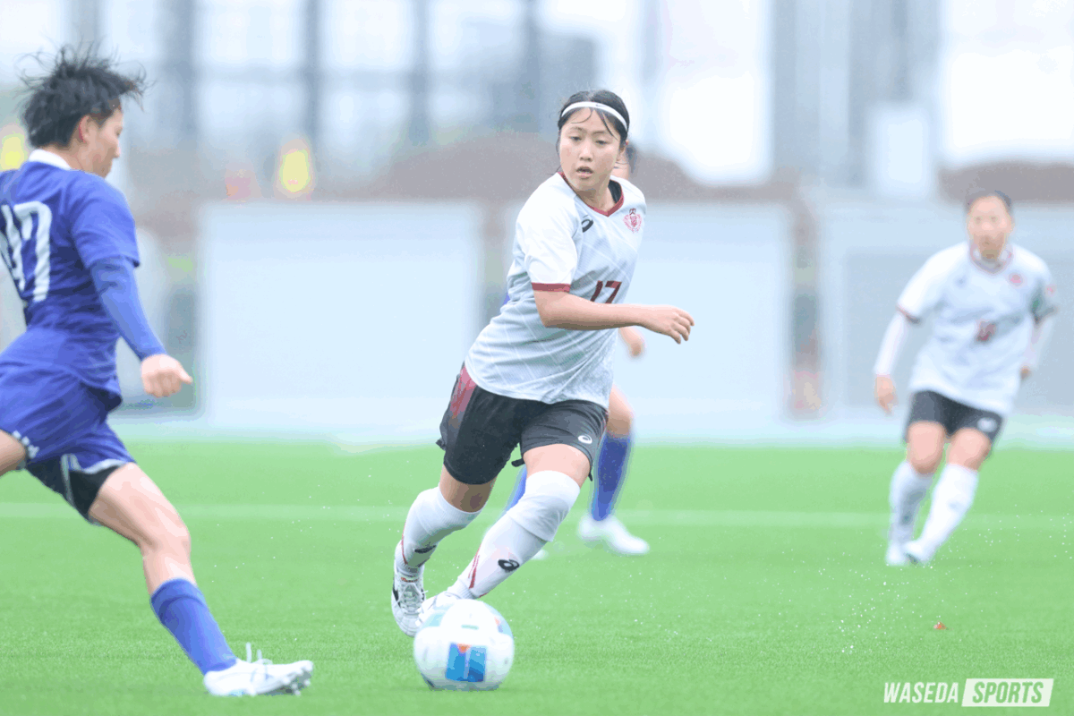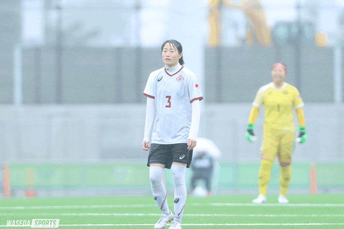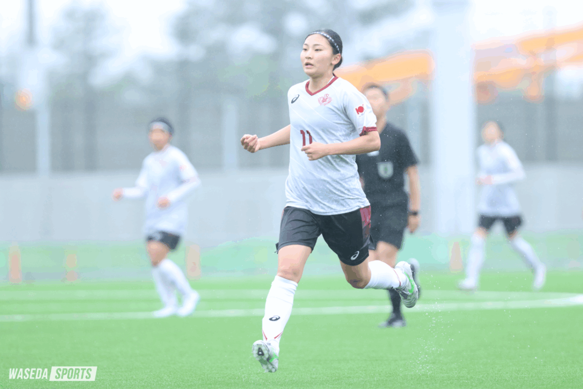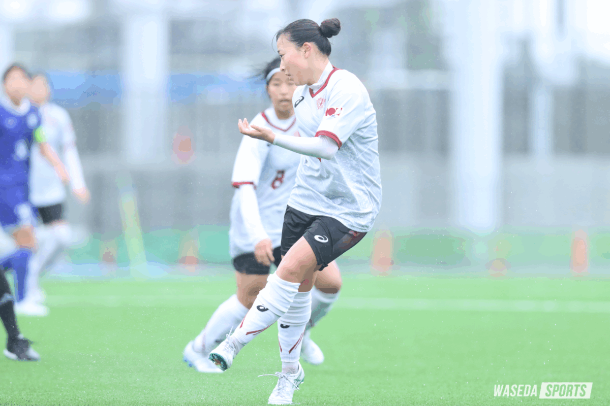 大粒の雨が降りしきるなか、おこなわれた今節。ア女はそんな雨にも動じないプレーを序盤から展開する。ディフェンスラインを高く保ち、敵陣でボールを保持。右サイドを使った攻撃で相手を敵陣へ押し込むことに成功する。しかし、決定機を迎えることはできずにいると徐々にボールは相手のもとへ。すると20分、相手のロングボールを使った攻撃から自陣の左サイドで起点をつくられると、ペナルティーエリア内へクロスを上げられる。このクロスに対し、DF杉山遥菜(スポ3=東京・十文字)とGK田村亜沙美(スポ3=ジェフユナイテッド市原・千葉レディースU18)間での対応がうまくいかず、相手に合わせられ、失点。ビハインドとなったア女だが、立ち上がり同様にボールを保持し続けた。38分には、カウンターから相手ゴールへと迫ったが、惜しくもシュートは打てない。そのまま試合は後半へと進んだ。