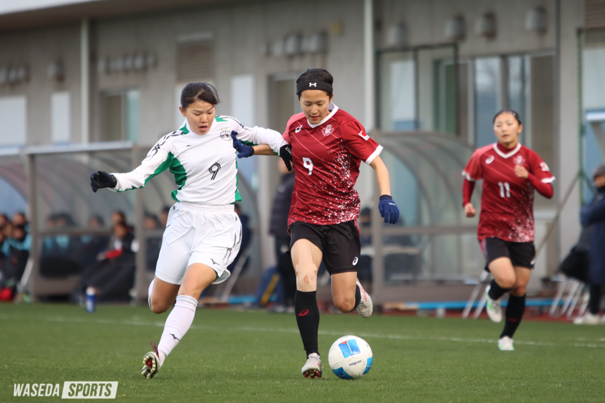 試合開始から15分ほどまで両者共に攻守のせめぎ合いが続いていた中、MF吉田玲音(社2=新潟・帝京長岡)を中心にア女が徐々にボールを安定して保持し始める。一方大体大はブロックディフェンスをしくことで、ア女にボールは握らせているものの、最終ラインを崩さない堅守を見せる。拮抗状態が続いていた前半25分、右サイドのMF米村歩夏(スポ2=宮城・聖和学園)からの裏へのパスにFW生田七彩(スポ4=岡山・作陽)が抜け出す。シュートまで行かなかったが、以降ア女のサイドからのシュートやセンタリングが見え始める。しかし、大体大の堅い守備を突破することができず、スコアレスで後半へと折り返した。