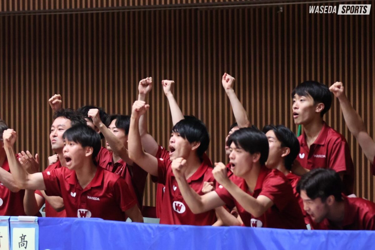 6番浦田景太朗(商1=兵庫・三田学園)が敗れ、最終7番・濵田尚まで回る。第1ゲームは相手に意表を突かれる攻撃をされるなど苦しい試合に。先に1ゲームを取られた中で、2ゲーム以降は「攻めの気持ちを忘れないようにと言われて、それが実践できたことが良かった」と語ったように積極的に攻撃をする場面が増える。得意のブロックで堅実に守りながらも、隙を見計らい攻撃に転じて着実に得点を重ねる。そこから3ゲームを連取し、見事勝利を収めた。