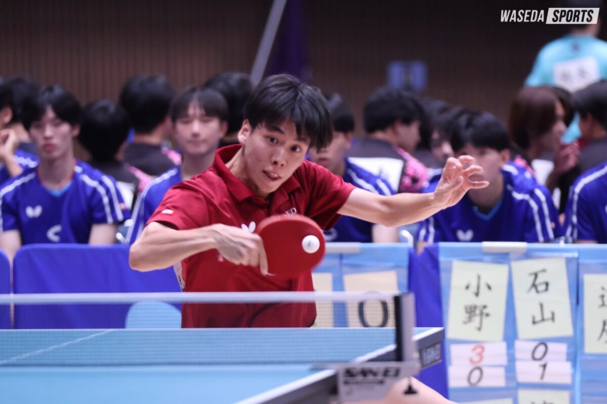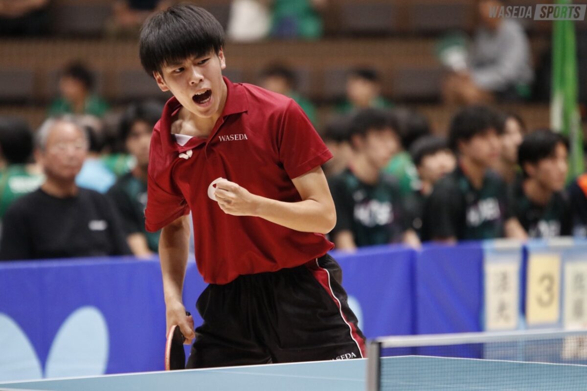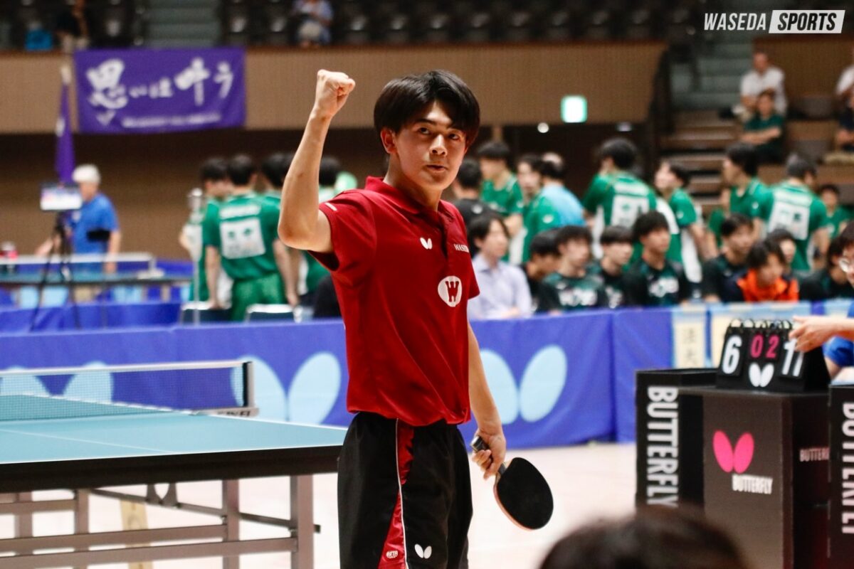 秋リーグ前半戦は、あと一歩のところで涙をのむ試合が多かった早大男子。この悔しさを晴らすためにも気持ちを切り替えて臨んだ6戦目の相手は中大だ。1番・田村真吾副将(基理4=東京・早稲田)は田村は相手の勢いあるフォアドライブに押され、思うように攻撃の形をつくれず、終始流れを奪われて敗戦を喫した。2番・濵田一主将は後陣から鋭い両ハンドを振り抜き、相手に主導権を渡さない。ラリーの中でも冷静さを保ち、粘り強いプレーでポイントを重ね、貫禄の勝利を挙げた。