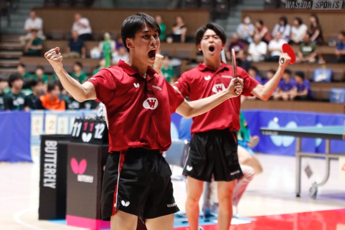 続く磯村拓夢(社3=福岡・希望が丘)はサービスエースで先制点を奪うも、ラリーをものにできず敗れる。ダブルスは、第1ゲームを11ー2と圧巻の試合運びを見せる。しかし、第2ゲーム目を2-4から6連続ポイントを許し、落とす。インカレでは2ゲーム先取したところから逆転された相手ペアに流れを渡したくない第3ゲーム。先にゲームポイントを握られたるも、濵田一主将のサービスエースで同点に追いつき、そのまま奪取する。次のゲームでは濵田一主将の全身から繰り出されるフォアドライブからの徳田のバックドライブの連携プレーも見せた。要所で濵田一主将のサービスが得点につながり、見事勝利する。