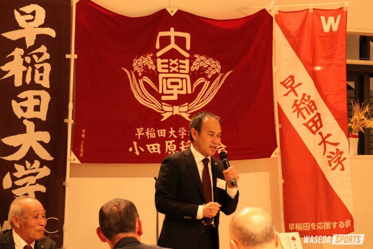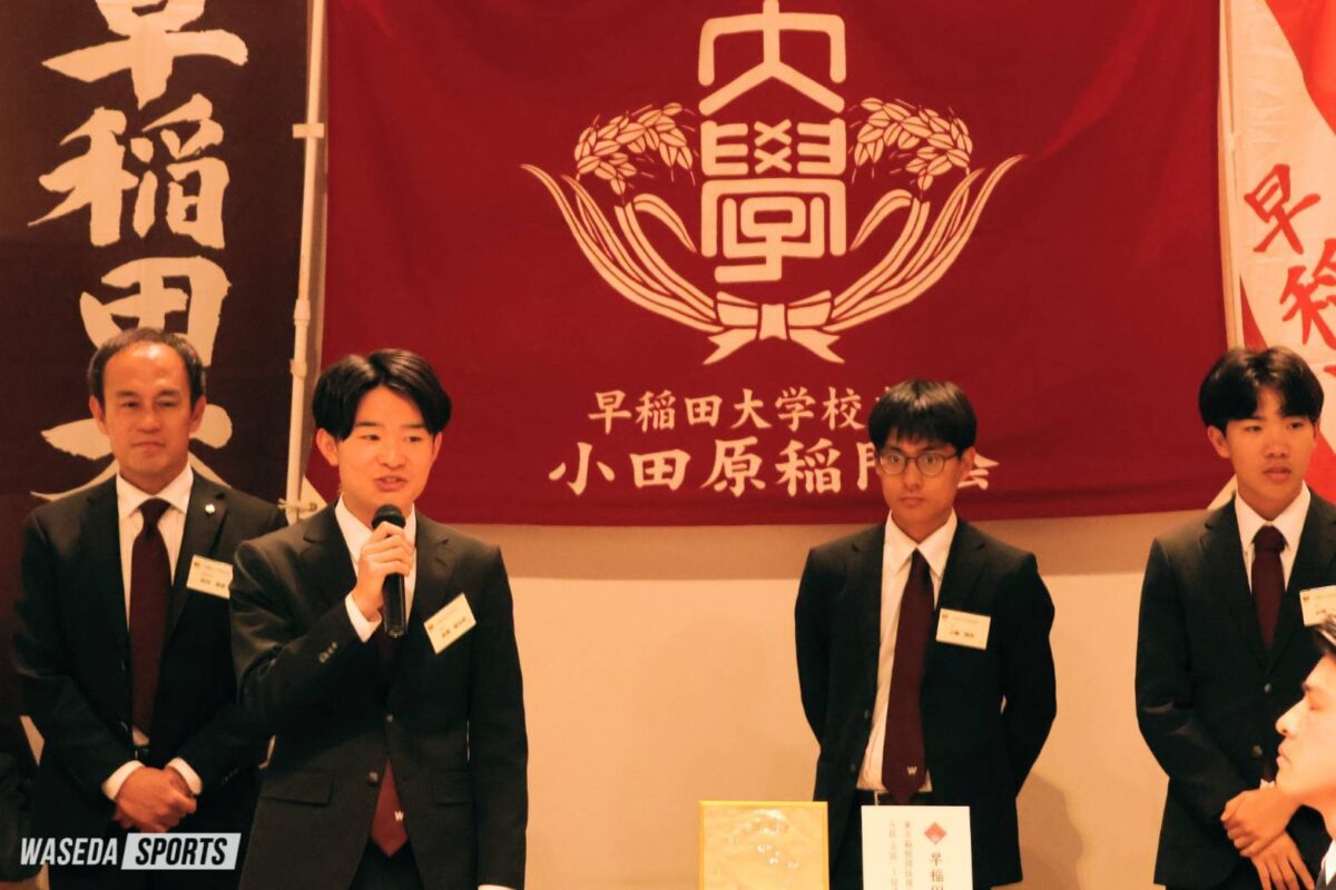 早稲田大学校友会小田原稲門会による「2026年箱根駅伝の健闘を祝う会」が今年も小田原市内で開催された。競走部からは花田勝彦駅伝監督(平6人卒=滋賀・彦根東)、工藤慎作(スポ3=千葉・八千代松陰)、山﨑一吹(スポ3=福島・学法石川)、そして髙尾啓太朗駅伝主務(商3=千葉・佐倉)が出席し、地元の校友らと交流を深めた。