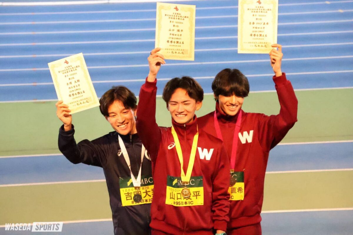 8人でのレースとなった男子1万メートルには、山口と吉倉が出場。絶好のコンディションにも恵まれ、号砲前から好記録への期待が会場を包んだ。レースは山口が中盤から他を圧倒する独走劇を披露し、貫禄の優勝。一方、最後までもつれた表彰台争いでは、吉倉が激しい競り合いを繰り広げ、意地のラストスパートで3位を獲得した。