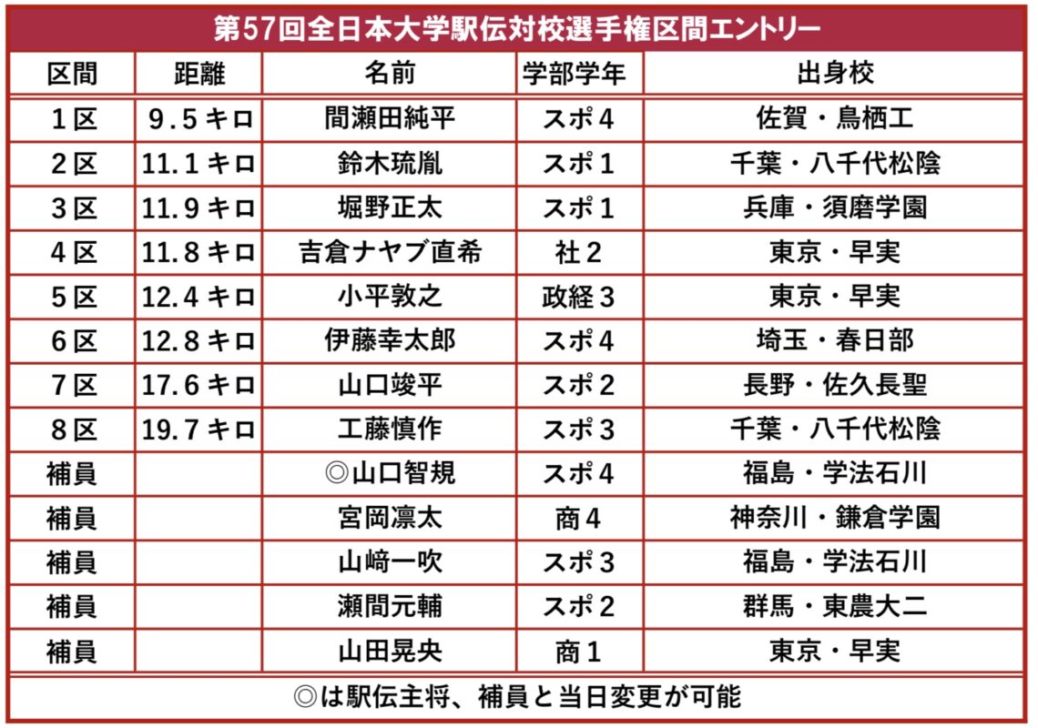 また、全日本は当日に補員から3名までのエントリー変更が可能。昨年の早大は1名の当日変更を行っている。補員の中で一際目立つのはエース・山口智規駅伝主将(スポ4=福島・学法石川)だ。トラックシーズンでは日本インカレ(日本学生対校選手権)で二冠を獲得し、7月には5000メートルで日本学生歴代3位の記録を叩き出した今季絶好調の山口智。先月の出雲駅伝では2区区間賞を獲得し、圧巻の9人抜きでチームを首位に押し上げた。日本一奪還には山口智によるエースの走りが欠かせない。加えて、ハーフマラソン61分台の自己ベストを持つ宮岡凜太(商4=神奈川・鎌倉学園)も補員に登録。今までエントリーメンバーには選ばれながらも出走を逃してきた宮岡だが、悲願の大学駅伝デビューはあるだろうか。他には今年の箱根6区を走った山﨑一吹(スポ3=福島・学法石川)、ロードに強い瀬間元輔(スポ2=群馬・東農大二)、スピードランナーの1年生、山田晃央(商1=東京・早実)が補員に名を連ねる。各校が知略を巡らせる当日変更の駆け引きにも注目だ。