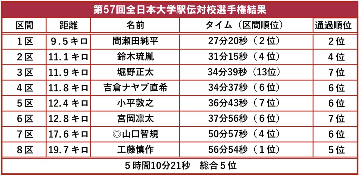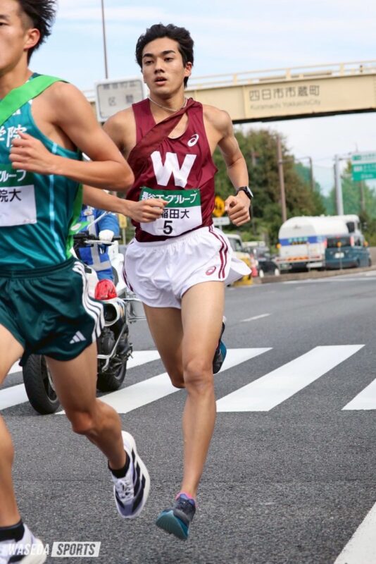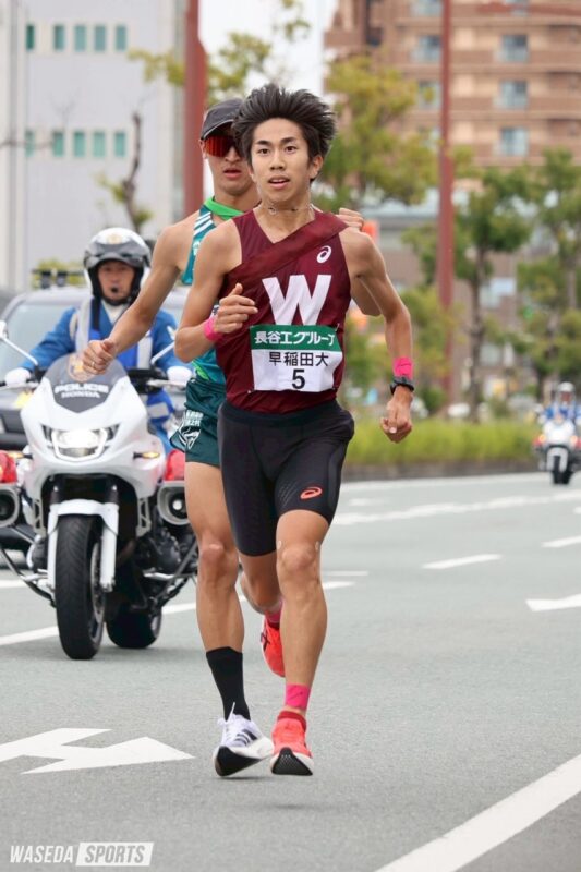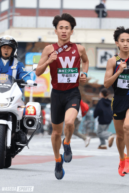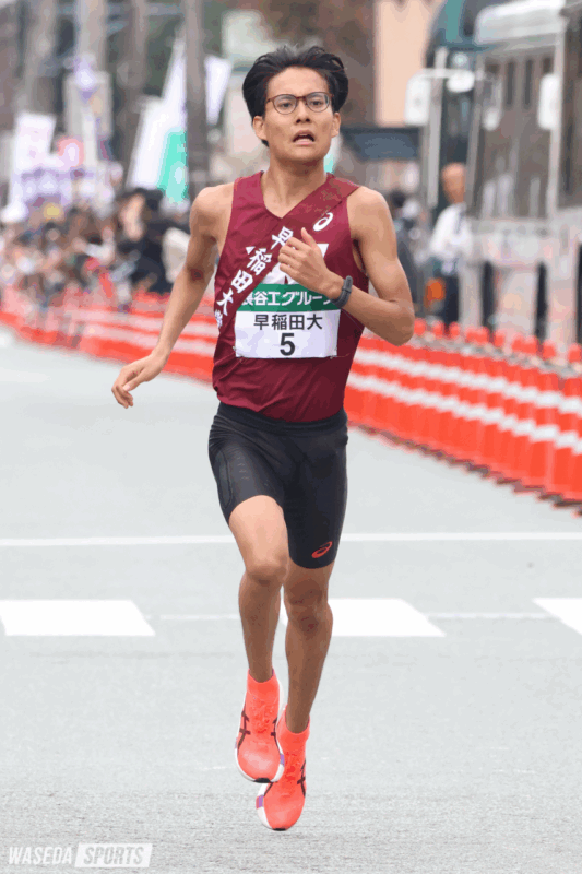 1区には4年連続、間瀬田純平(スポ4=佐賀・鳥栖工)が出走。間瀬田は序盤、集団の中ほどでレースを進めた。集団は5キロまで1キロ3分ペースを保って進むと、7キロ地点手前で本間颯(中大)がスパートをかけた。集団から遅れるかのように見えたが、「ラストでレースが動くと思っていた」間瀬田は冷静に最後の勝負に備えていた。9キロ手前で集団に追いつくと、ラストの叩き合いではライバルとなる国学院大や駒大より先着。1位と秒差無しの区間2位でチームに勢いをつけた。
