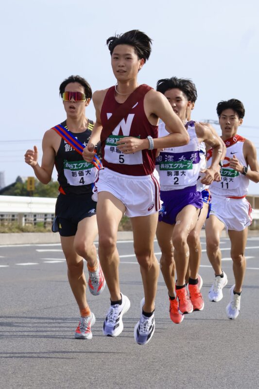 2区には、鈴木琉胤(スポ1=千葉・八千代松陰)が登場。鈴木琉はタスキを受けると、すぐさま先頭へと飛び出した。その後も集団を引っ張るいつも通りの走りを見せた鈴木は、5キロの給水地点での小池莉希(創価大)の飛び出しも封じ込めると、終盤まで先頭争いに参加。ラスト1キロのスパートで中大、帝京大に先着を許すも粘り切り、先頭と3秒差の4位でタスキリレーを果たした。区間順位は4位と、出雲に続いて序盤のエース区間で堂々の走りを見せた鈴木琉。箱根での好走にも期待がかかる。
