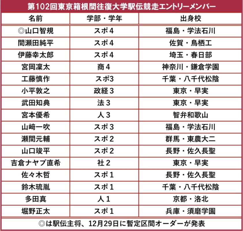 第102回東京箱根間往復大学駅伝競走 早大チームエントリー(12/10時点)