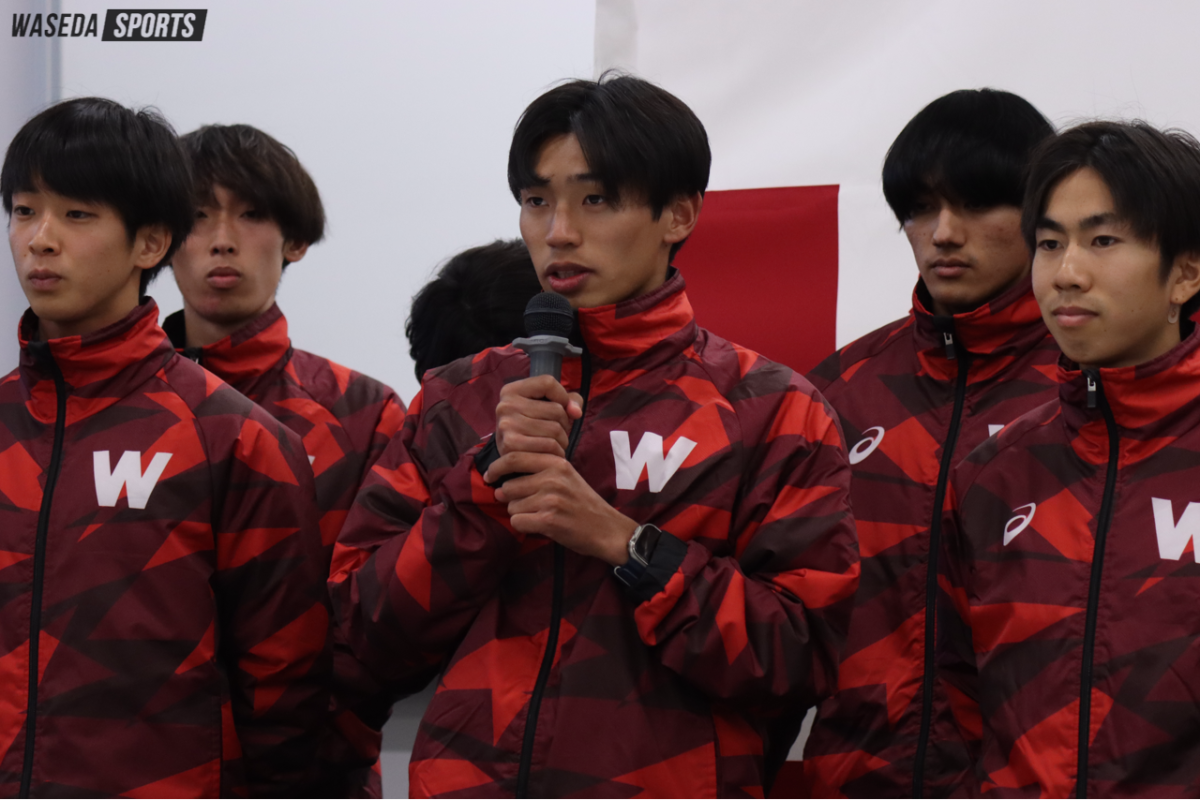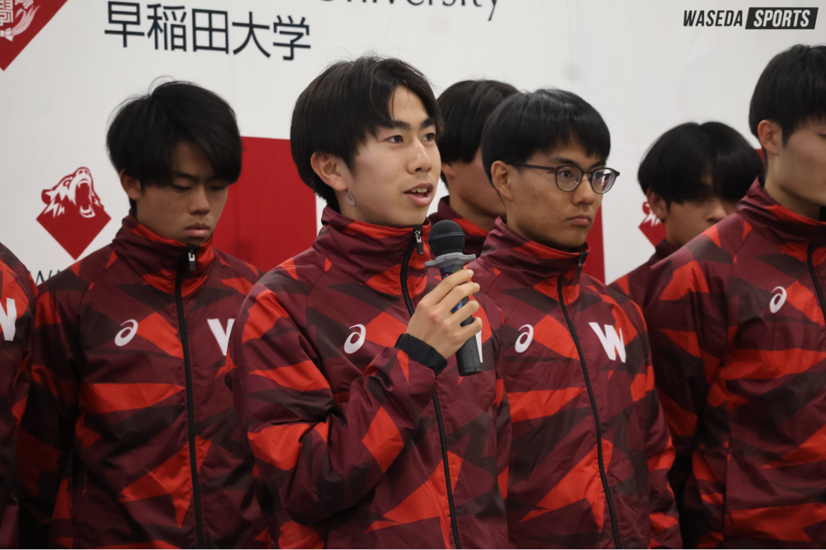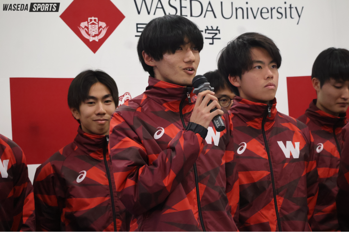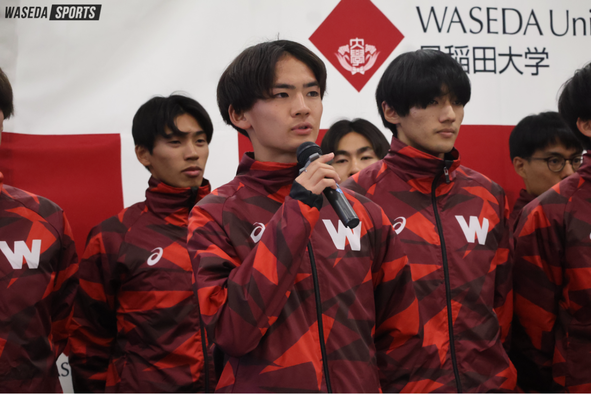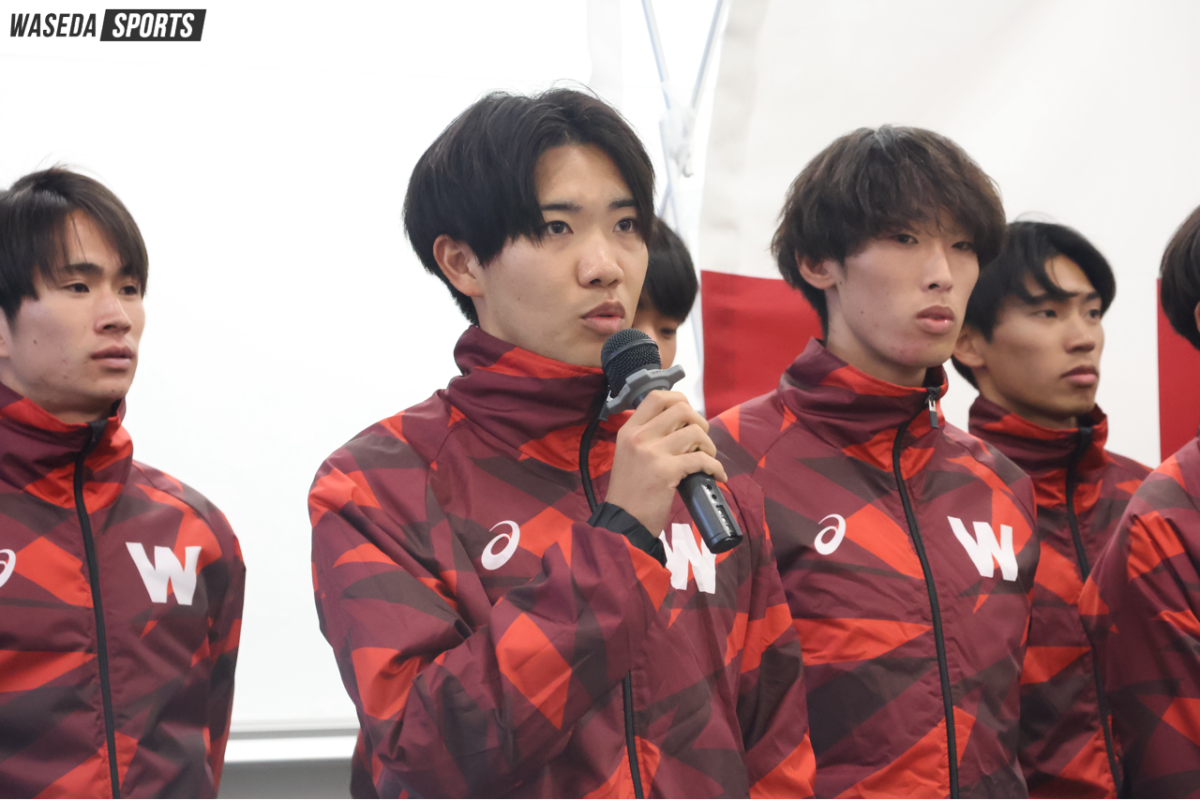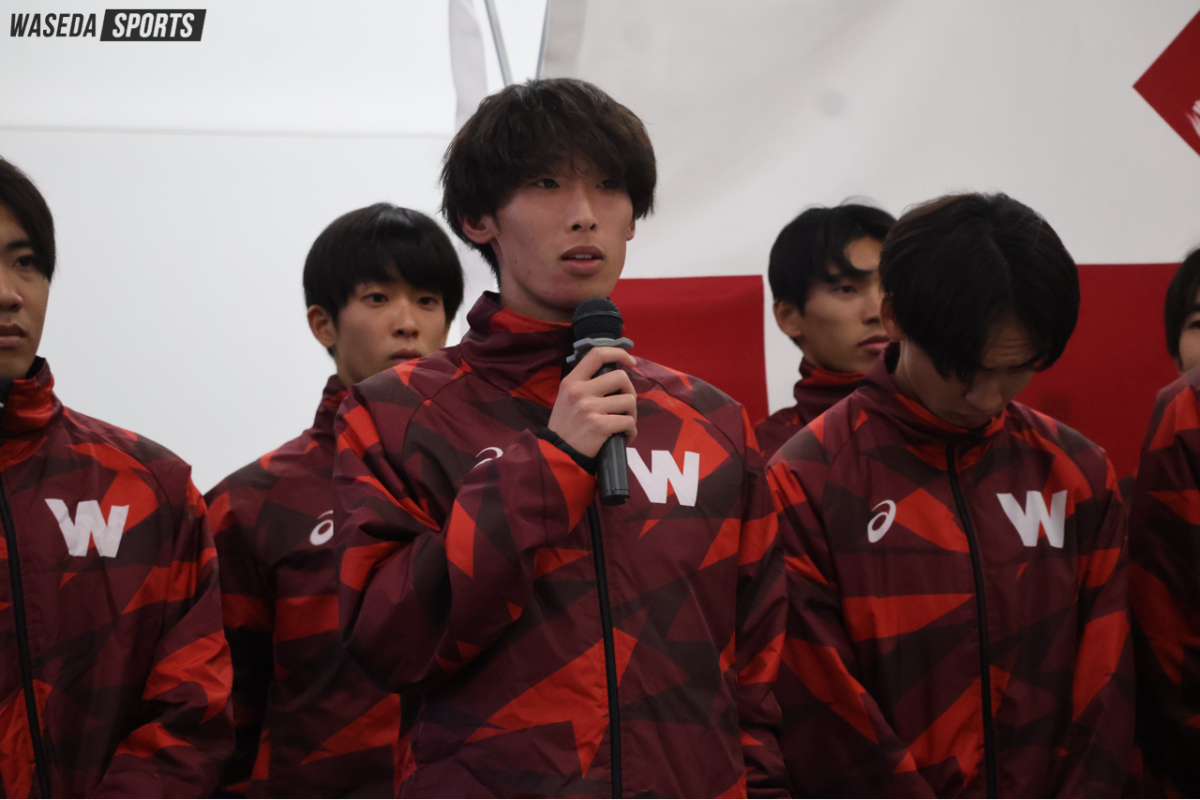 第101回箱根駅伝の報告会を大手町で行った時に、花田監督が(来年は)総合優勝をするとおっしゃって、このチームが発足しました。111代目ということで、1がそろう縁起のいい代です。『One早稲田』として選手はもちろん、白石(幸誠主務、人4=愛媛・八幡浜)をはじめとするスタッフ、または瀬古さん(瀬古利彦氏、昭55教卒)などOB会、クラウドファンディングなどで応援してくださる全ての方々とワンチームとなってこの1年間戦ってきました。出雲、全日本と優勝には届きませんでしたが、一学生の域を超えて、シニアで世界大会を目指すような選手、または早稲田実業高などの付属校から大学に上がってきて主力を担う選手、もしくは文武両道を極めている学生が出てきたということで、直近の早稲田とは違う「強い早稲田が帰ってきた」という証拠を見せることができたと思います。みんな状態が良いので、そこは期待してほしいと思います。箱根に向けて走る練習はもちろん、大手町で『都の西北』を今日よりもっと上手に歌えるように練習したいと思いますので、1月3日の大手町、楽しみにしていてほしいと思います。最後の箱根駅伝になるので、自分の4年間を最大限に表現して、1人でも多くの人たちがエンジに憧れるような1時間にできるように頑張っていきたいと思います。応援よろしくお願いします。